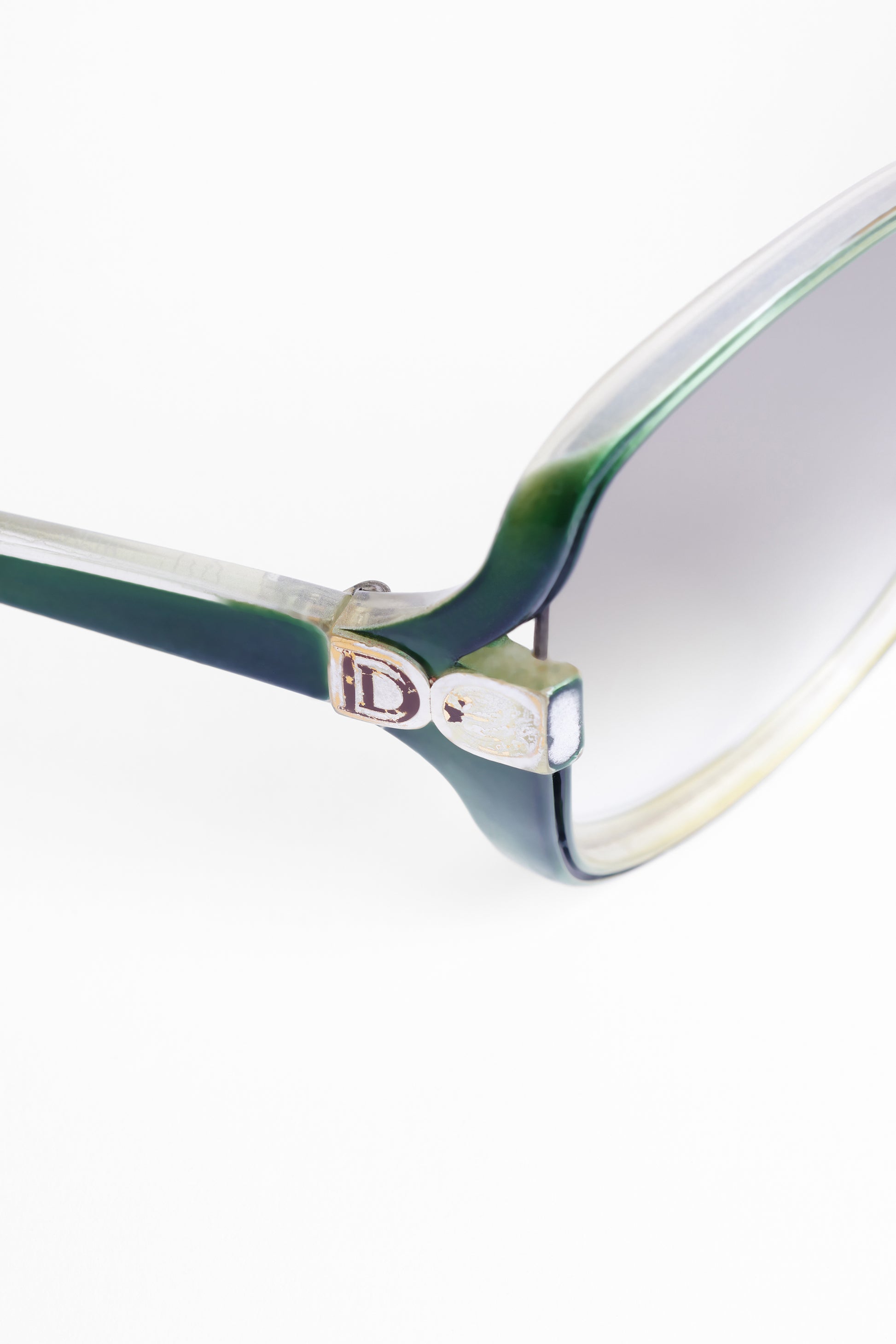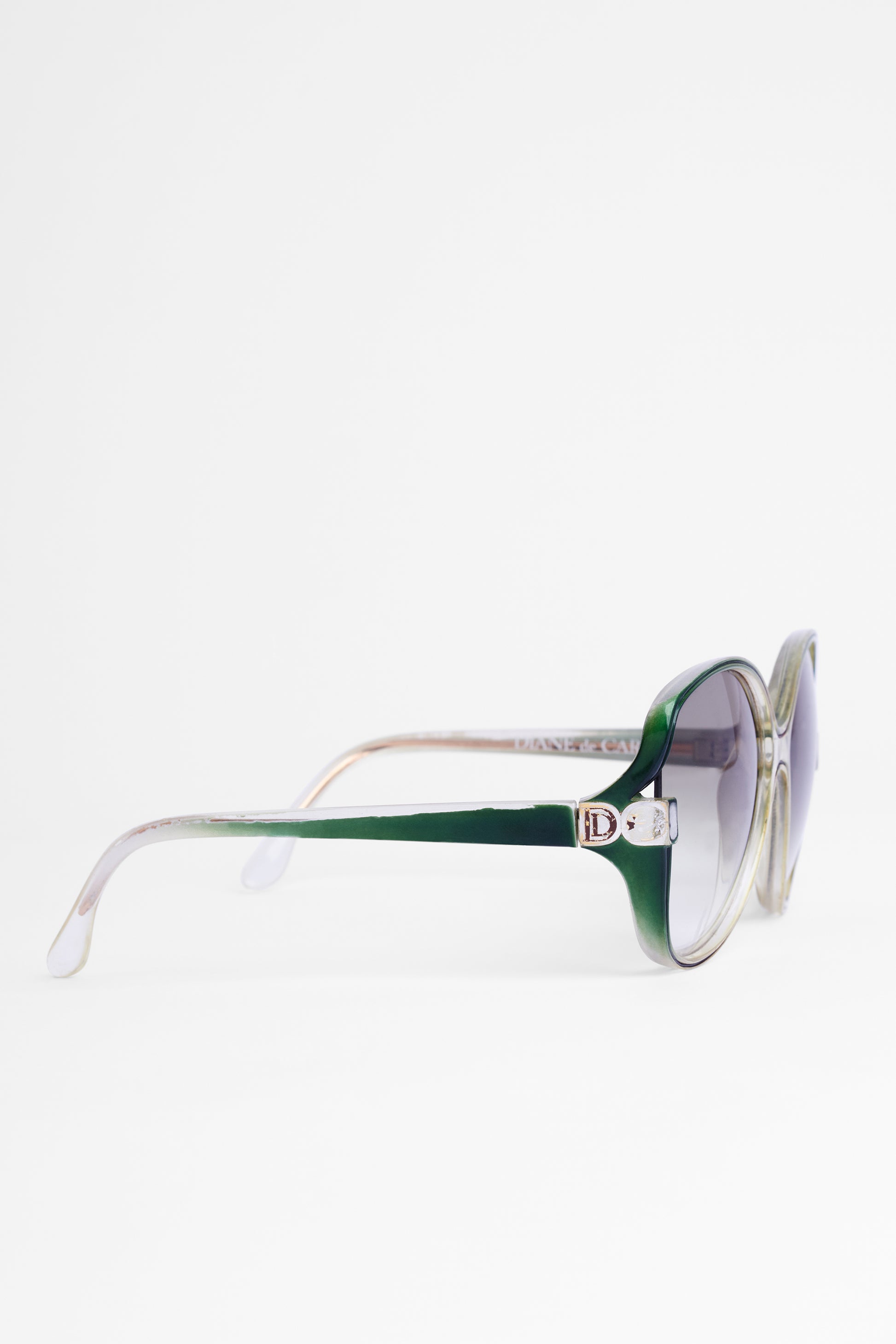 Circa 1970's Diane de Carlo oversize sunglasses. Features green clear acetate frame and lens, green arms and tinted lens. In good vintage condition, please note that there is some scratching to the lens and light stretching to the arms.