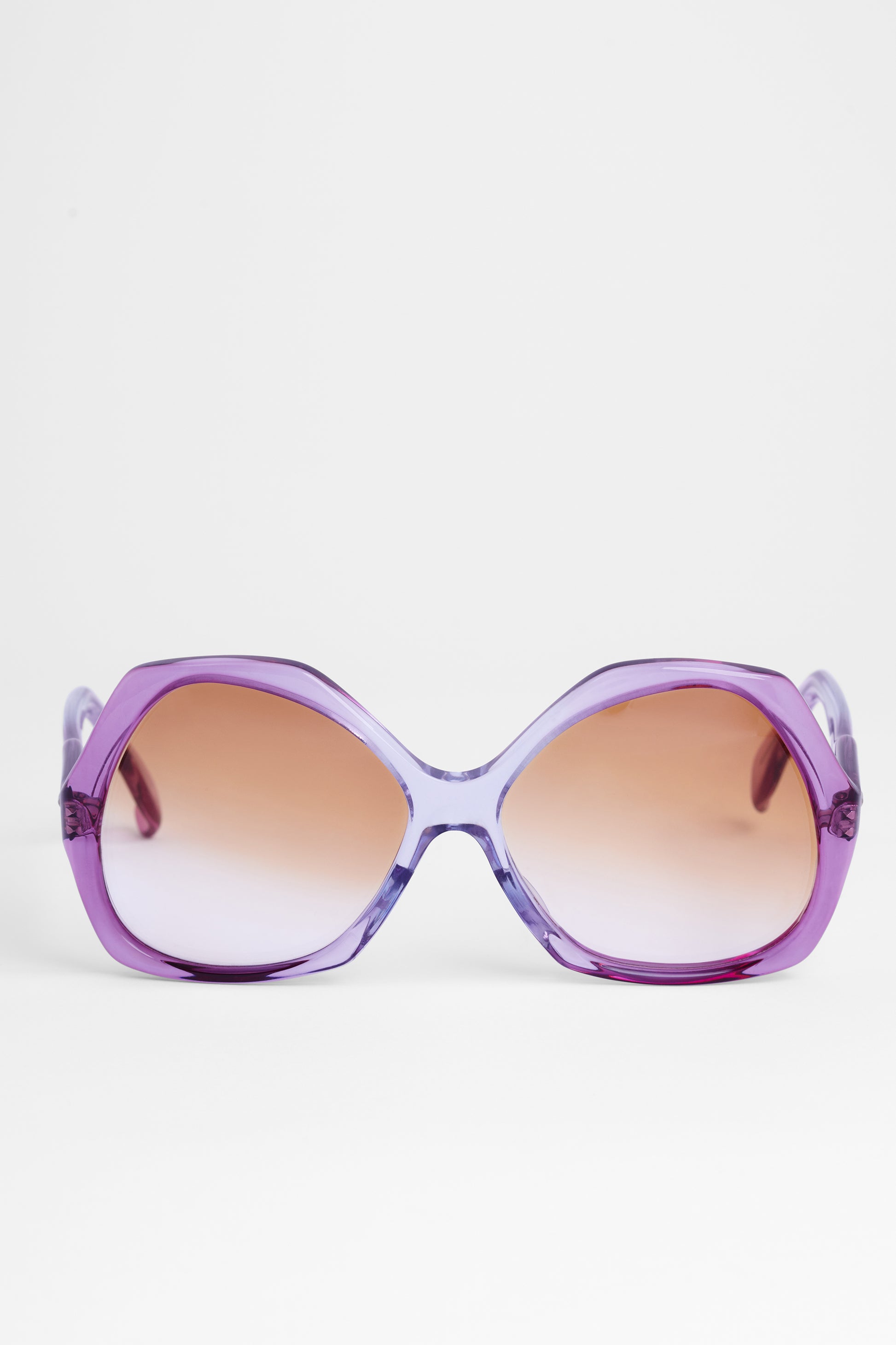 Vintage Circa 1970's Selecta oversized hexagon shape sunglasses. Features purple and clear acetate frame and arms and clear brown ombre lenses. In great vintage condition, some slight stretch to arm bands that can be tightened.