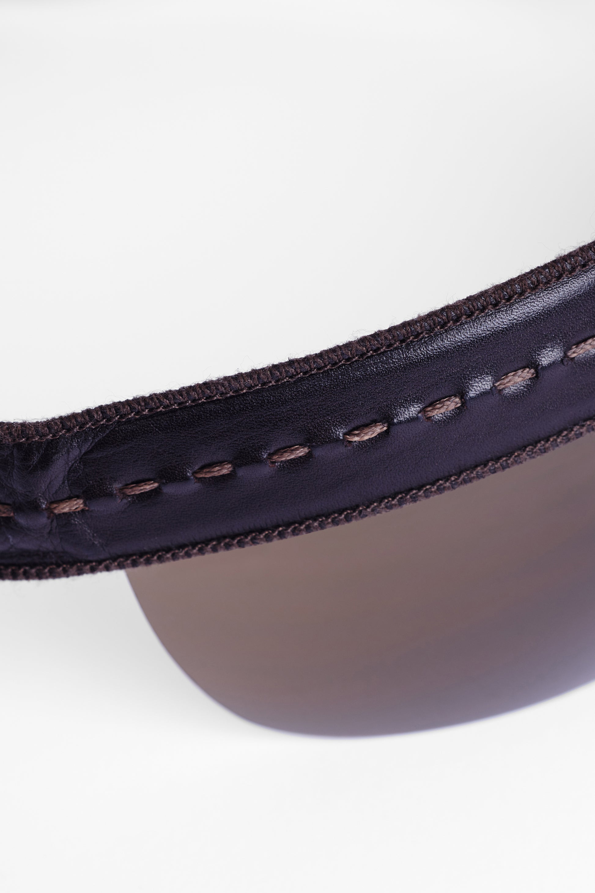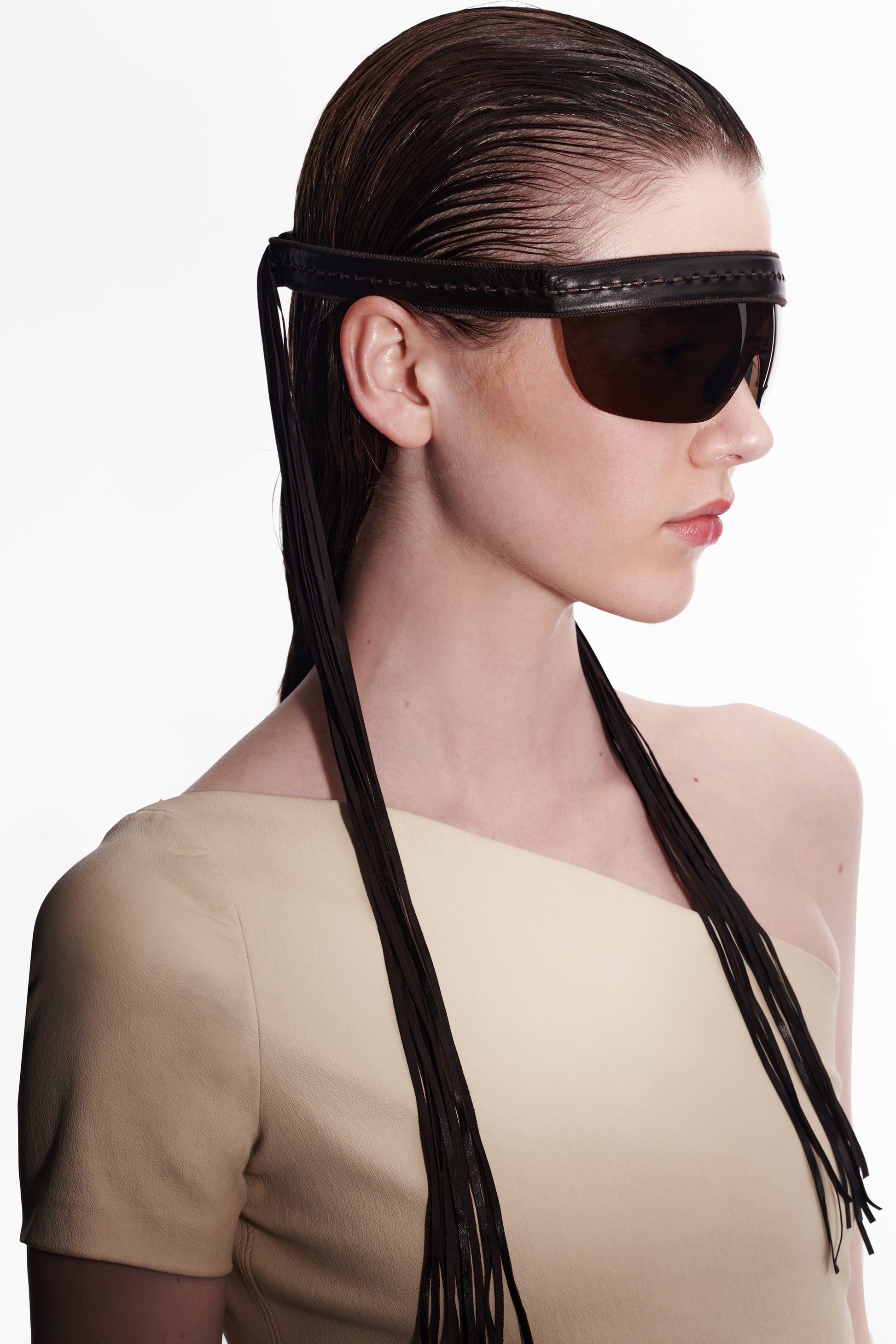 Vintage rare circa 1990 Fendi 1990s leather sunglasses. Features long brown leather fringe, shield frame, dark brown lenses and adjustable snap button closure head strap.Comes with original box. In excellent vintage condition