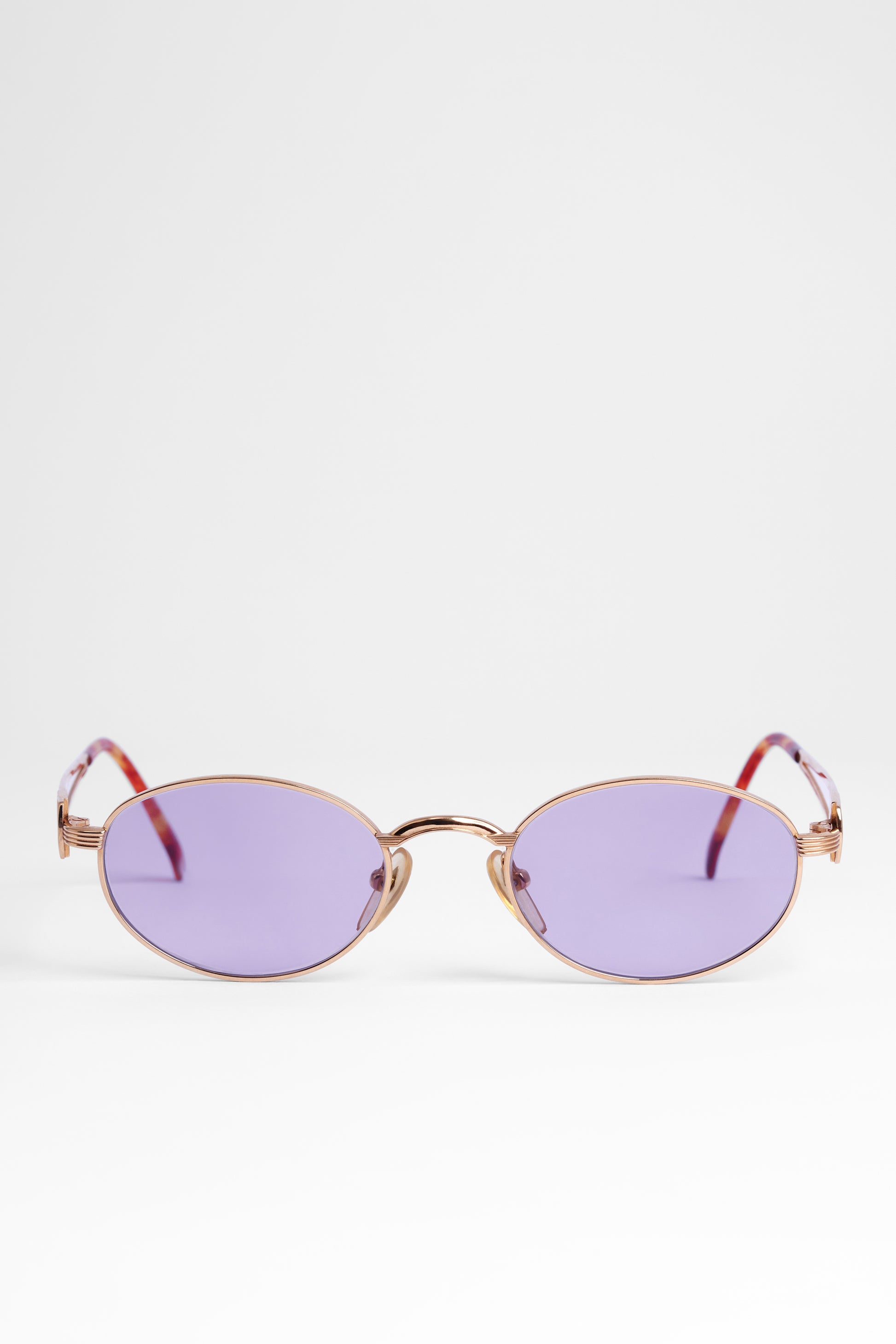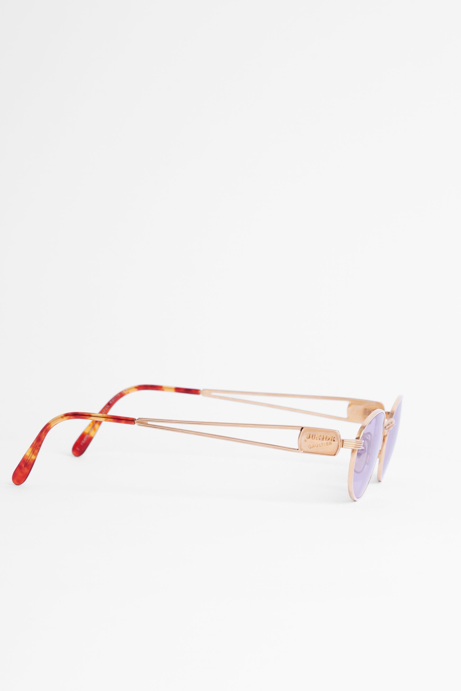 1990's Junior Jean Paul Gaultier. Features slim oval shape, gold trim, purple lenses, Gaultier stamp detail and tortoiseshell arm. In excellent vintage condition.