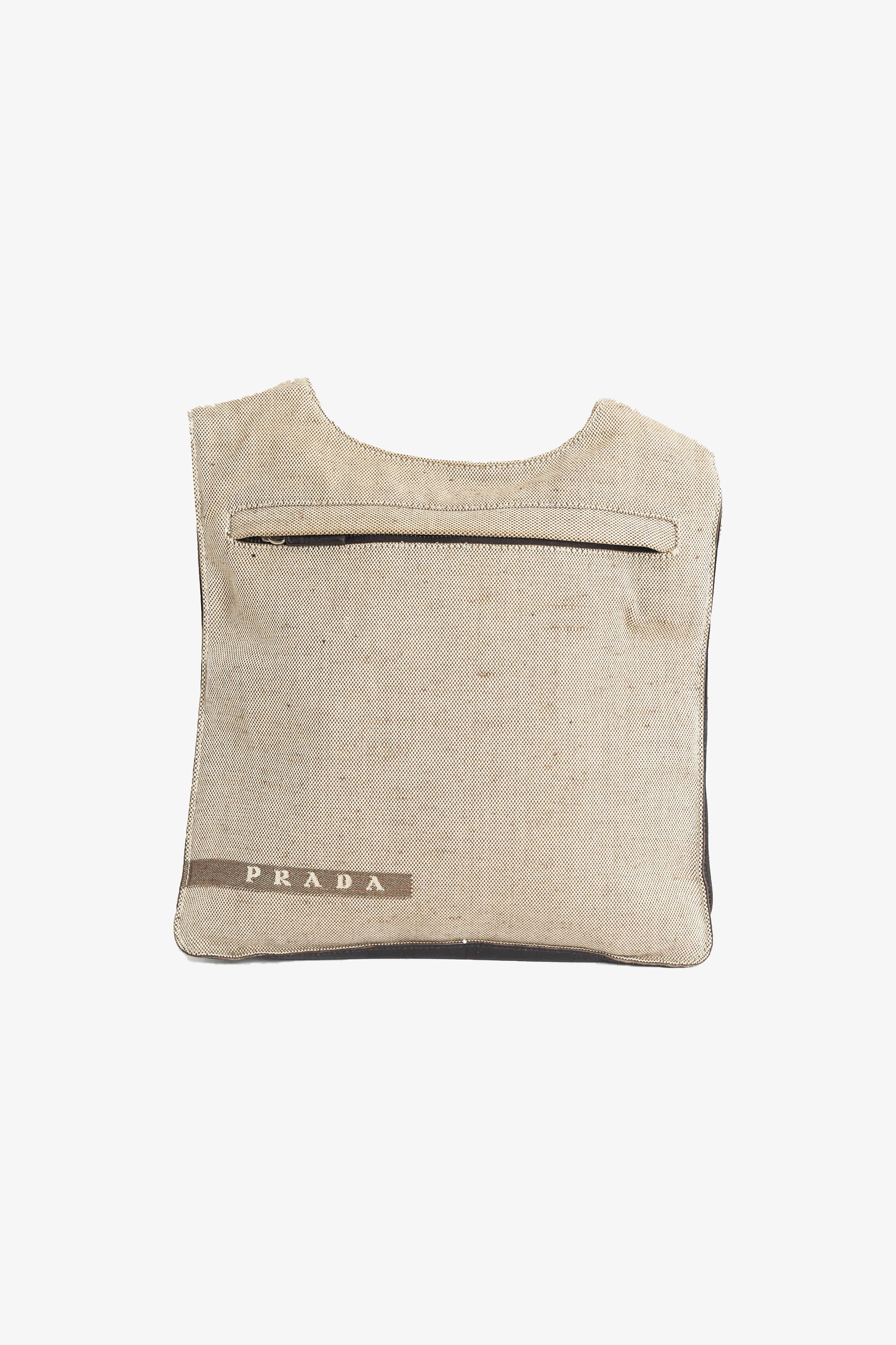 Prada Spring Summer 1999 chest rig beige backpack. Features woven Prada logo, velcro straps  and visible front zip. In great vintage condition, minor wear to the leather. As seen on the runway.