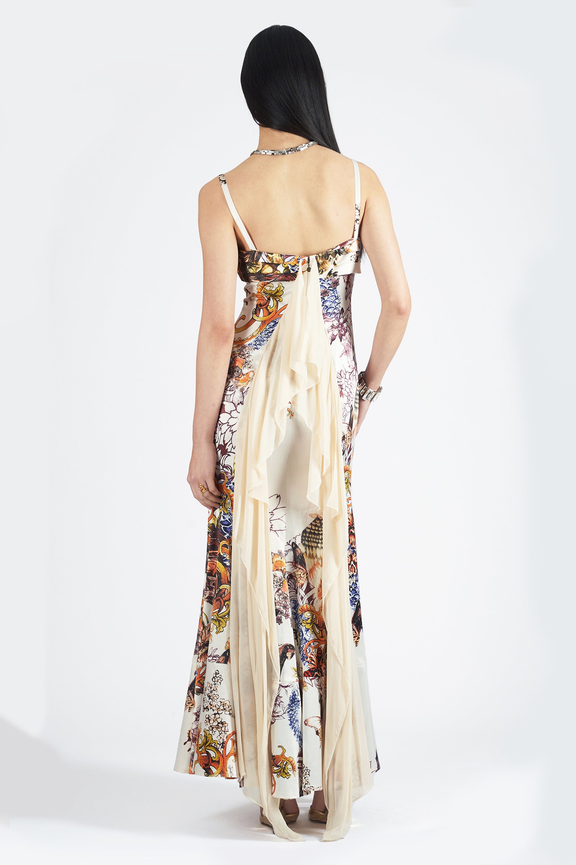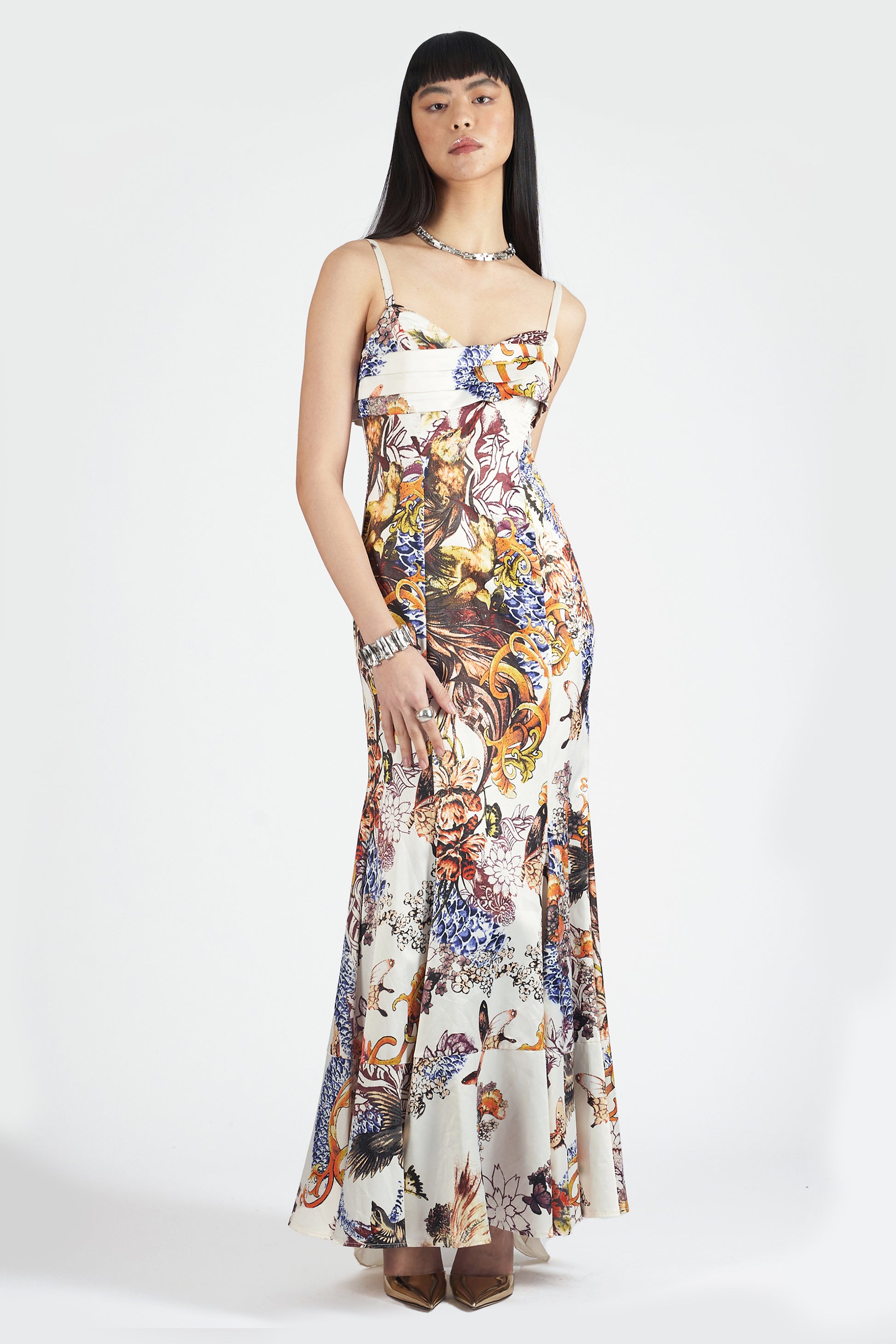 Roberto Cavalli Fall Winter 2000’s vintage fishtail hemline maxi dress. Features butterfly pattern, fishtail hemline, back zip closure and maxi length. In excellent vintage condition.