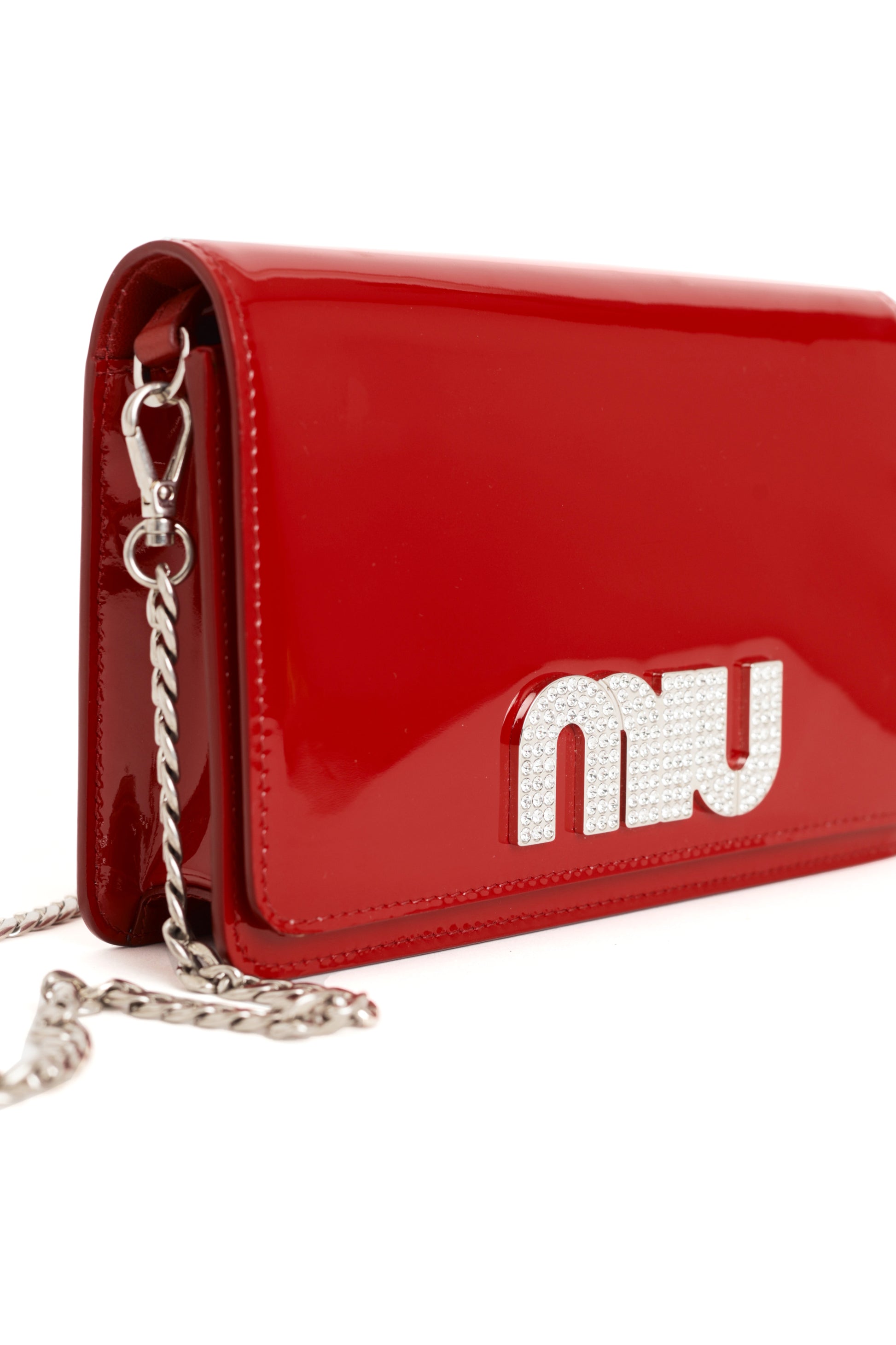 Miu Miu 2000’s red patent leather mini crystal embellished crossbody bag. Features silver removable chain strap, two inside compartments with a zip pocket and card compartments pocket. Pre-loved, in excellent vintage condition.