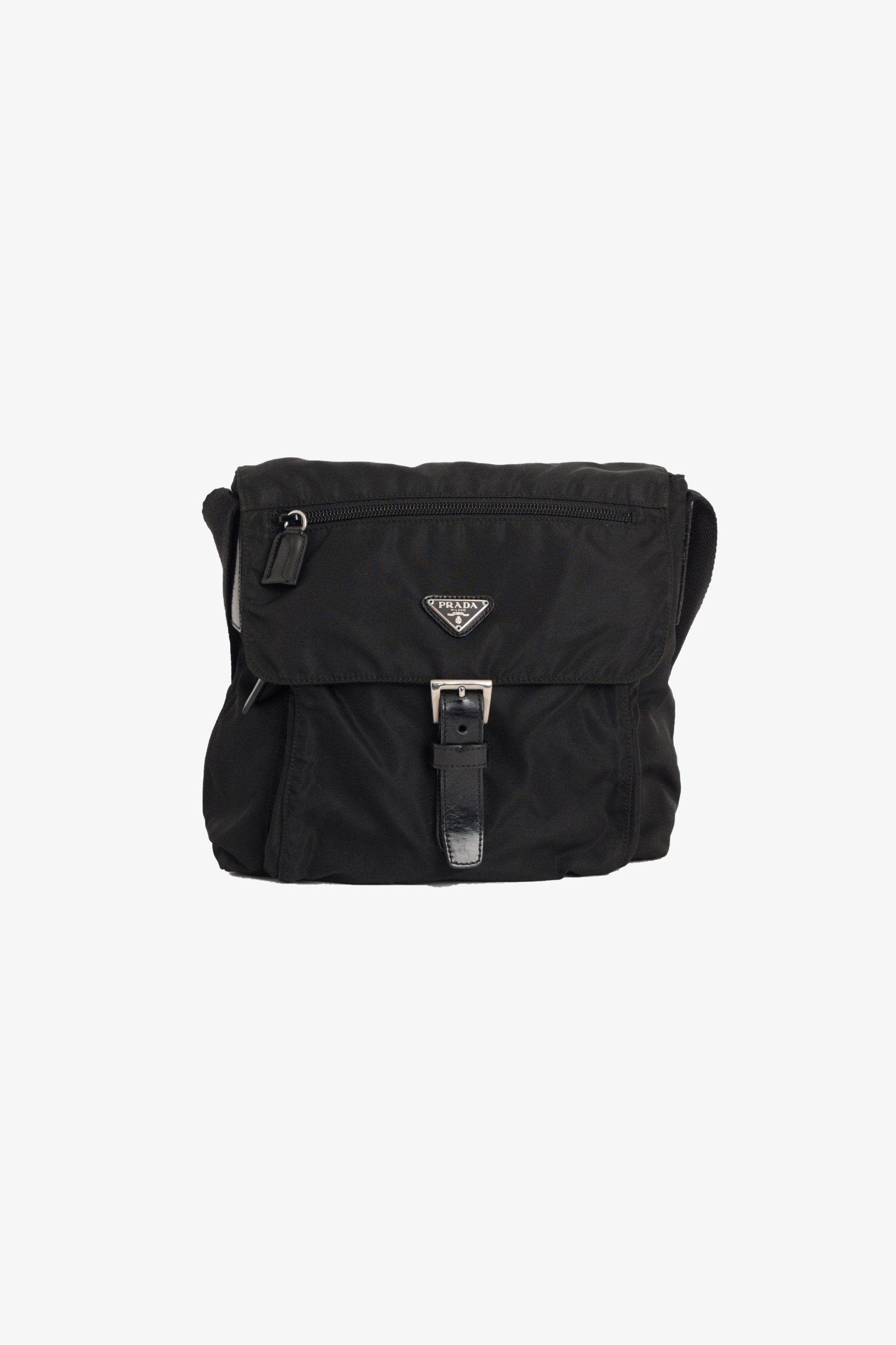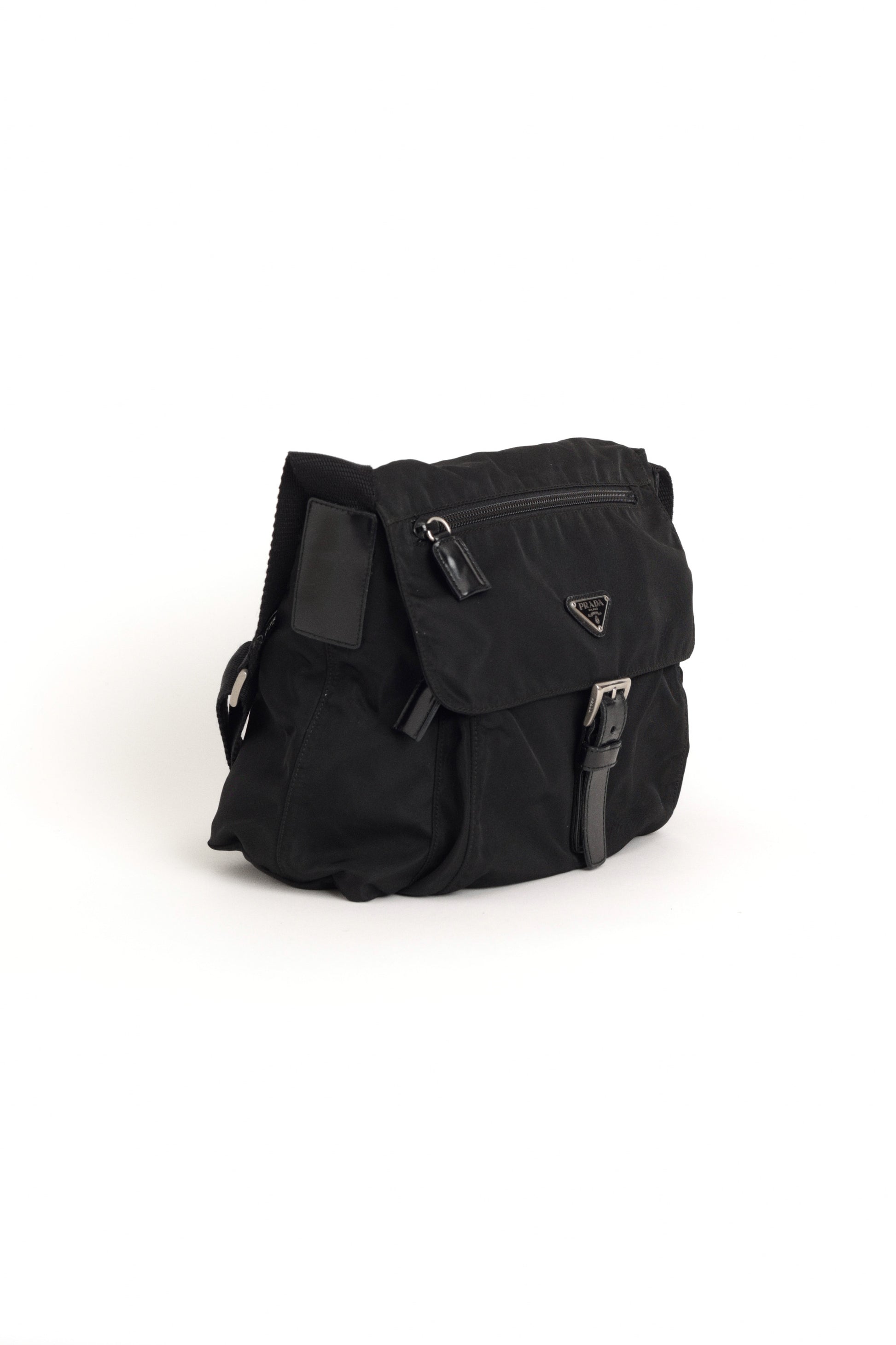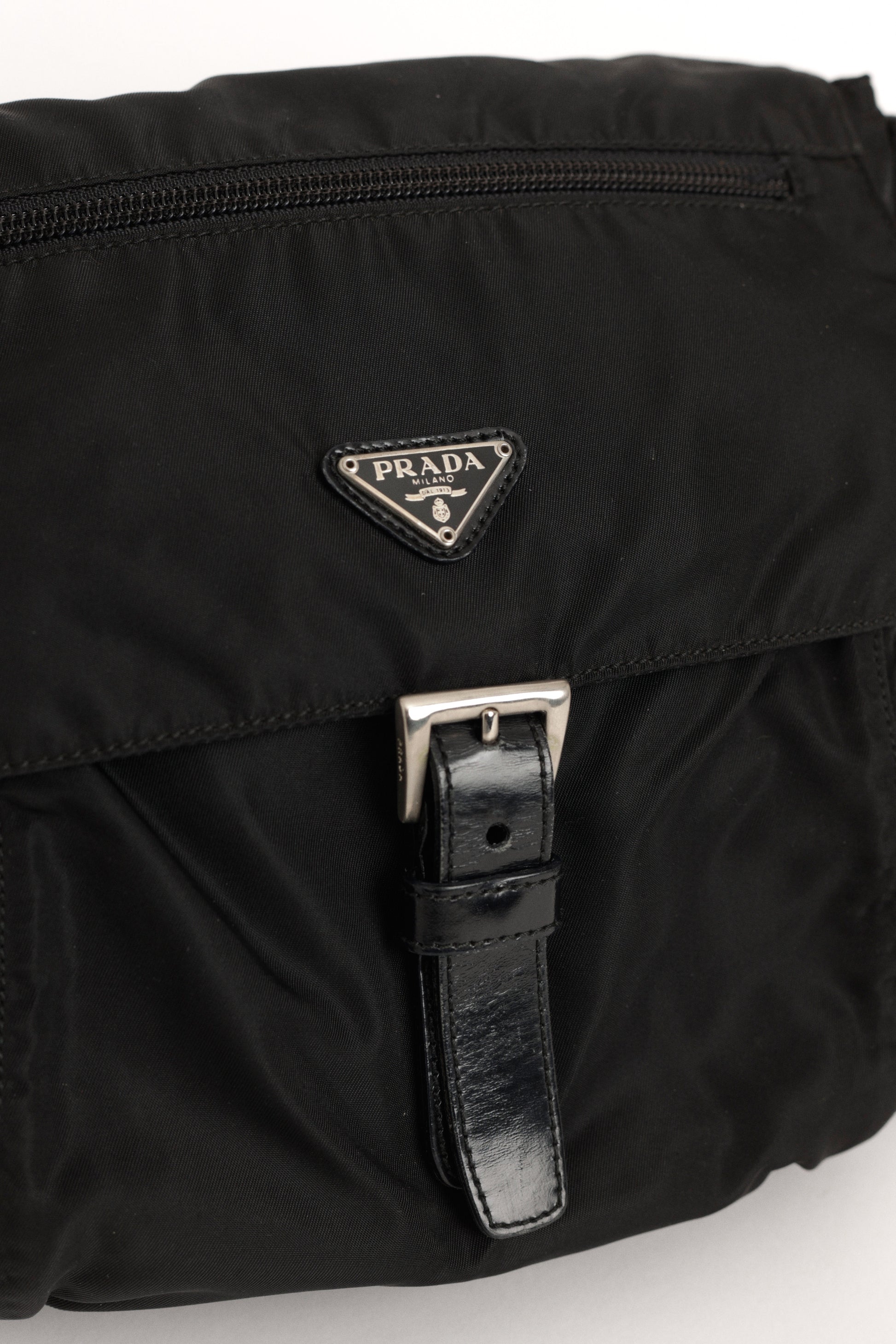 Prada 2000’s black tote bag. Features eyelet closure, Prada enamel triangle on the side and one zipped interior pocket. Pre-loved, in good vintage condition, with some loose threads inside.