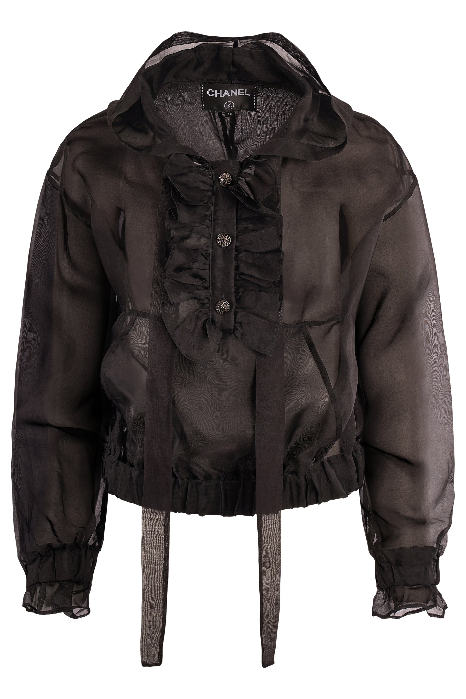 2000'S Chanel Silk Chiffon Ruffled Long Sleeve Blouse. This blouse features a semi transparent fabric throughout, with an elasticated waist band to cinch the waist and the cuffs. A pocket on the front and a hood reminiscent of a hoodie. With metal buttons with black crystal details and a ruffle front detailing. In excellent condition.