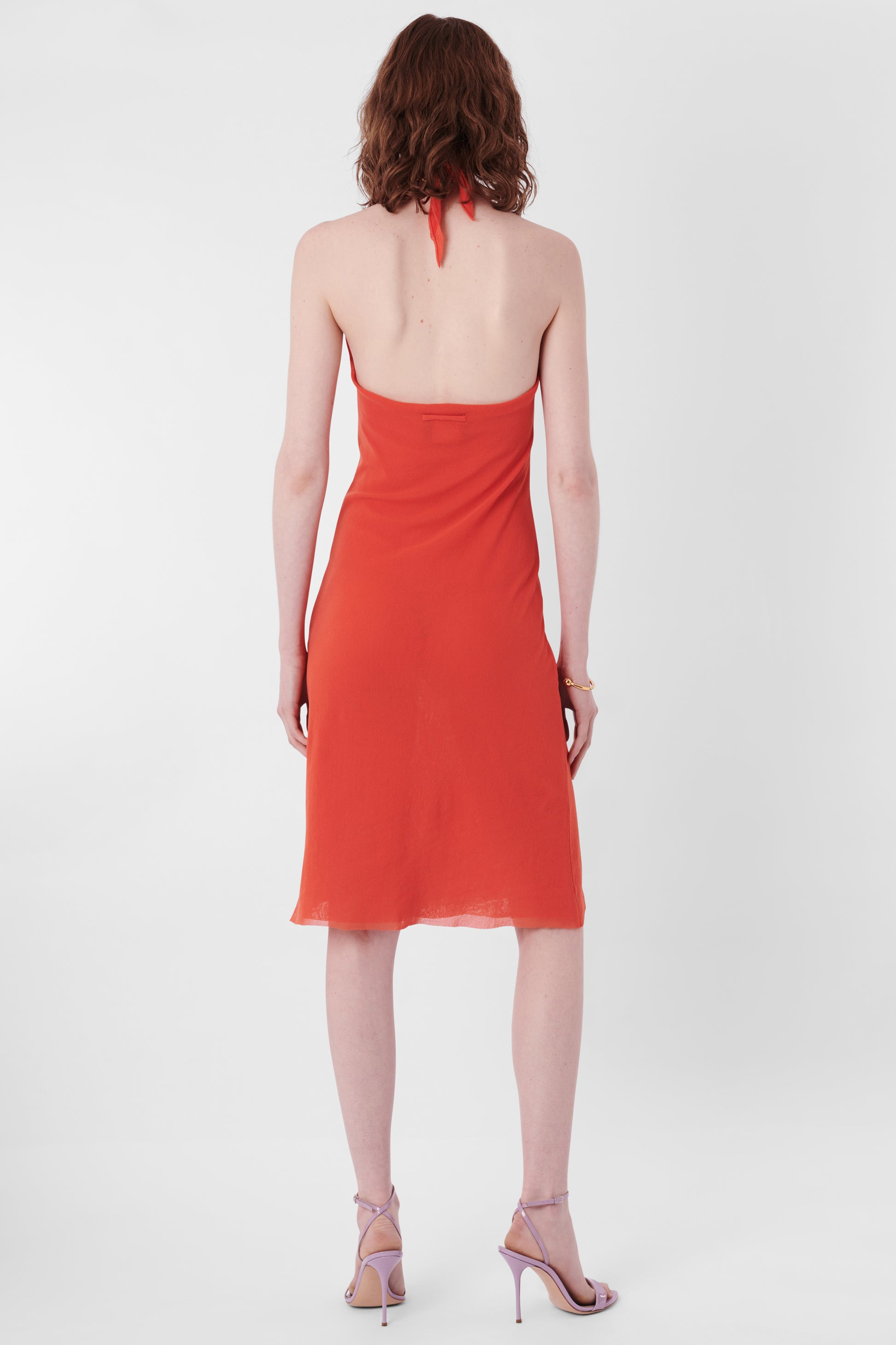 Vintage Jean Paul Gaultier 2000's Coral Halter Neck Mesh Dress. Features Halter neck design, straight fit in midi length. In excellent vintage condition.