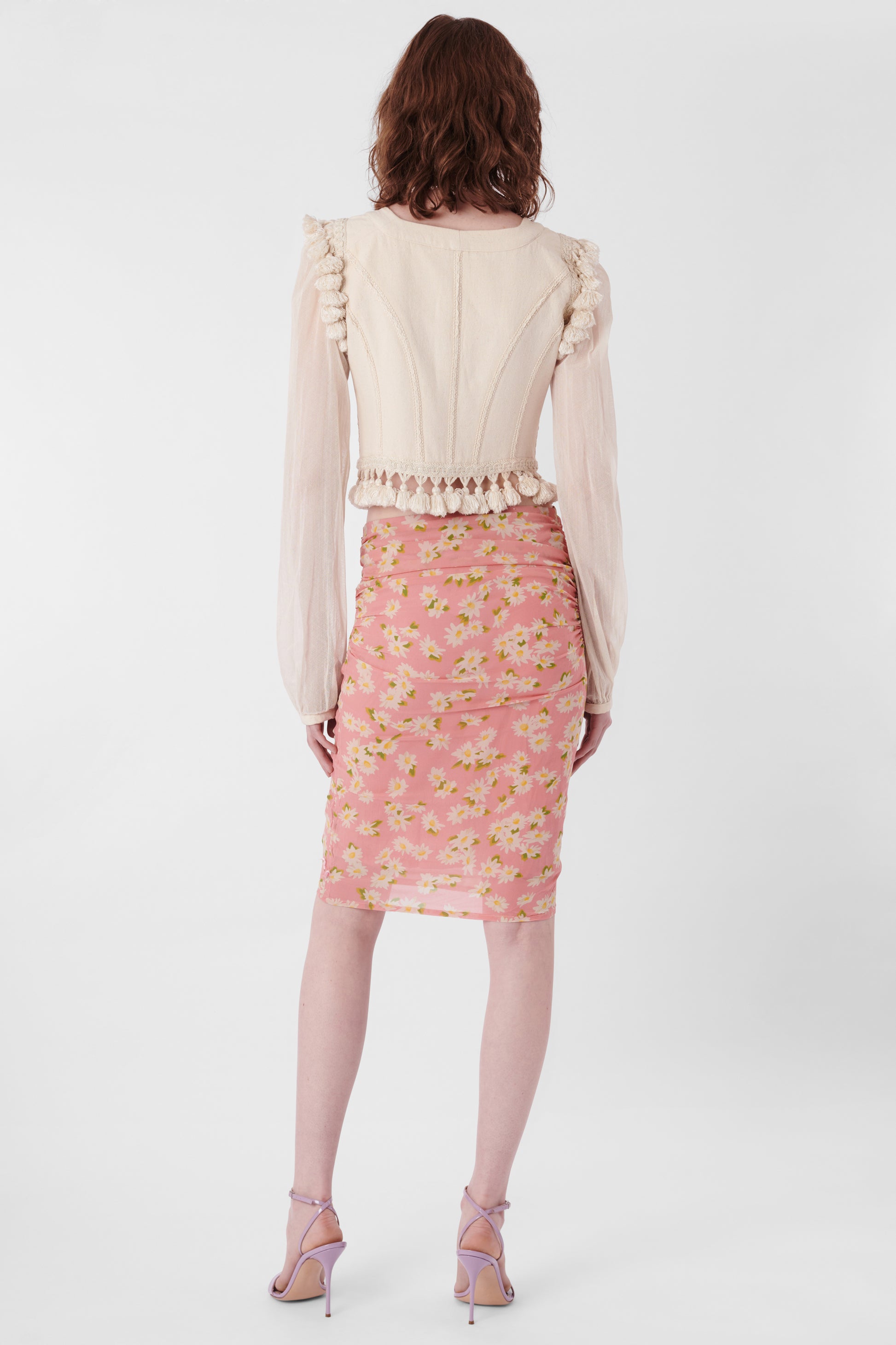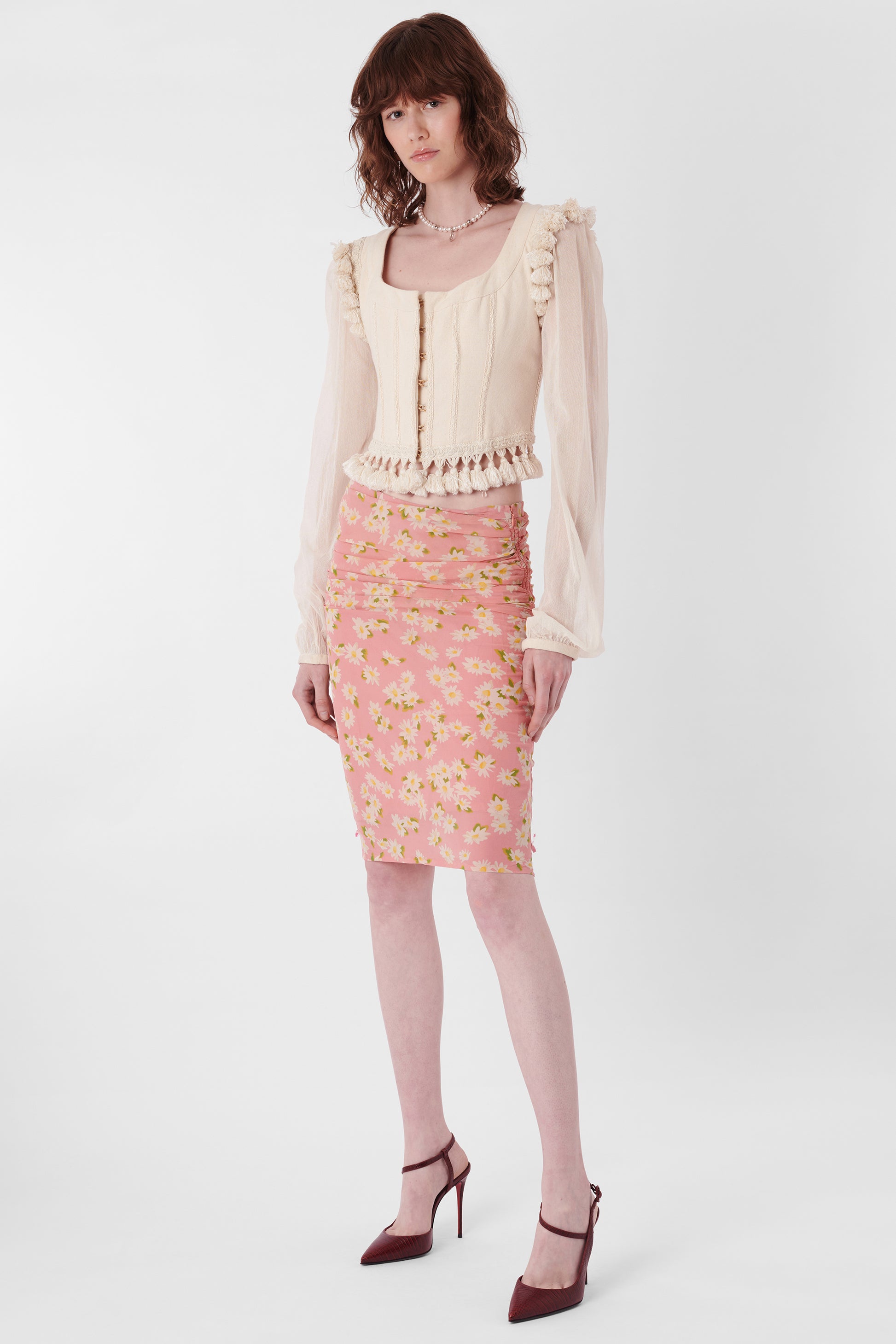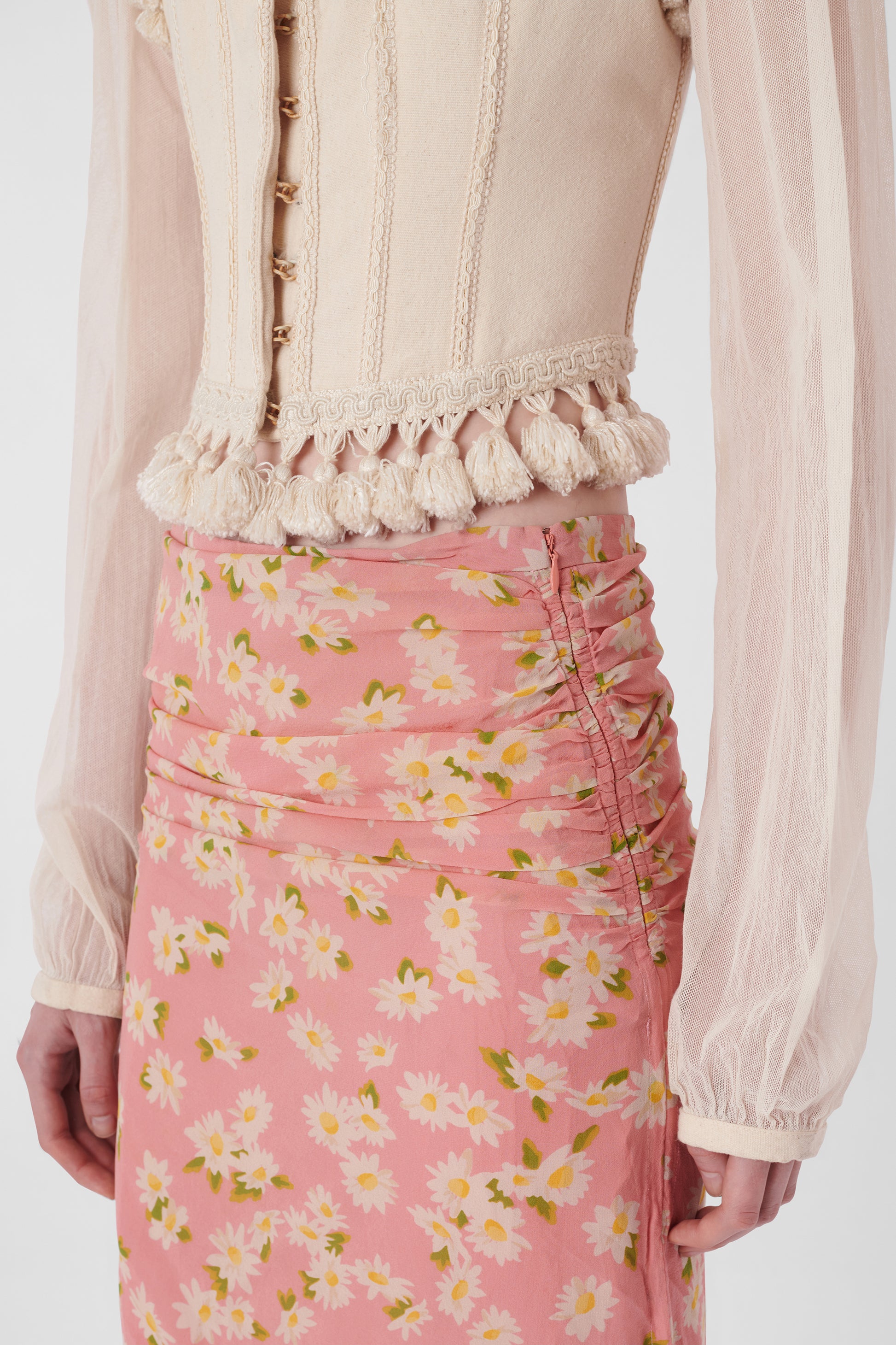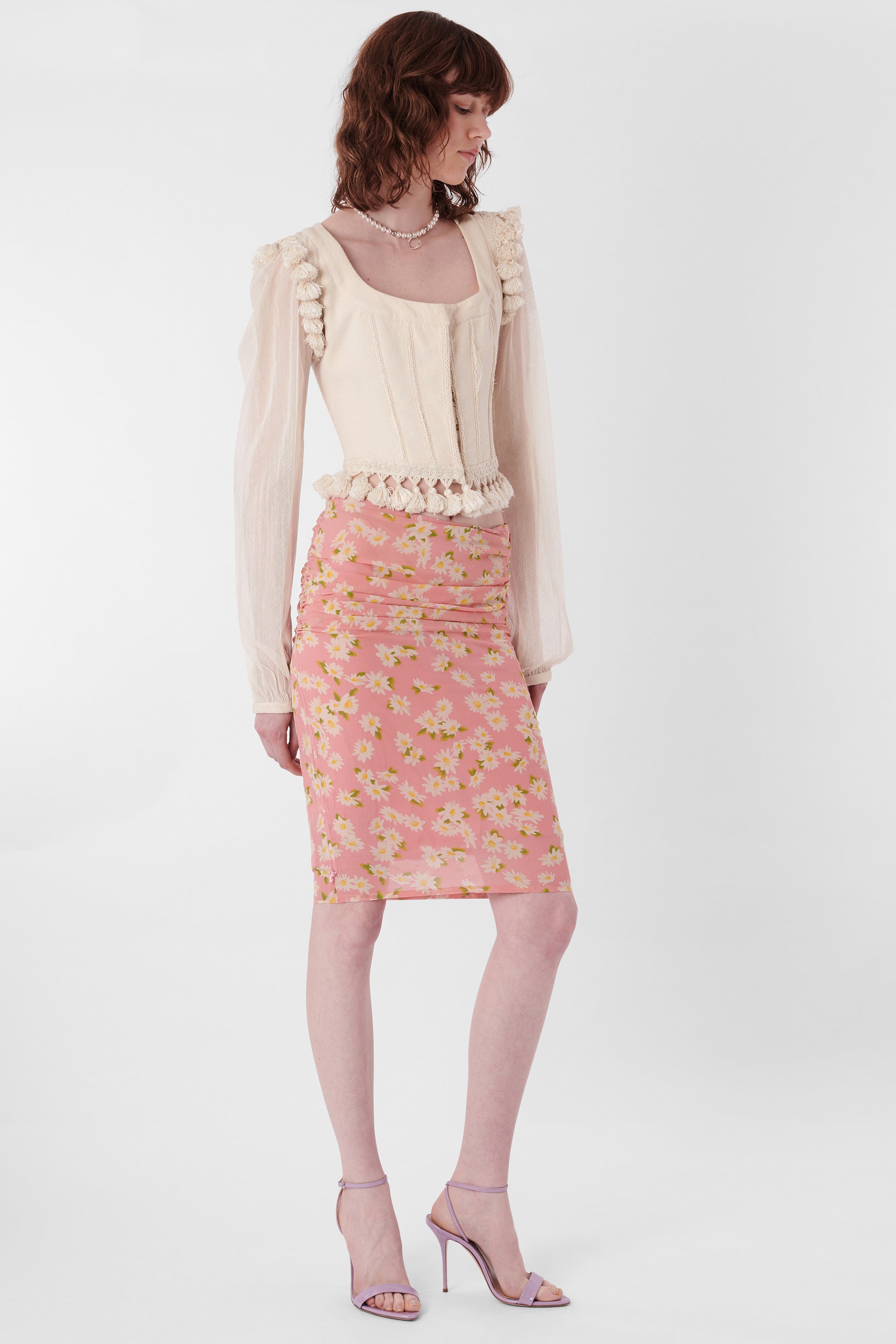 Moschino Cheap and Chic 2000's Ruched Floral Skirt. Features Slim fit low waisted ruched sides ,silk floral skirt in knee length. In excellent vintage condition.