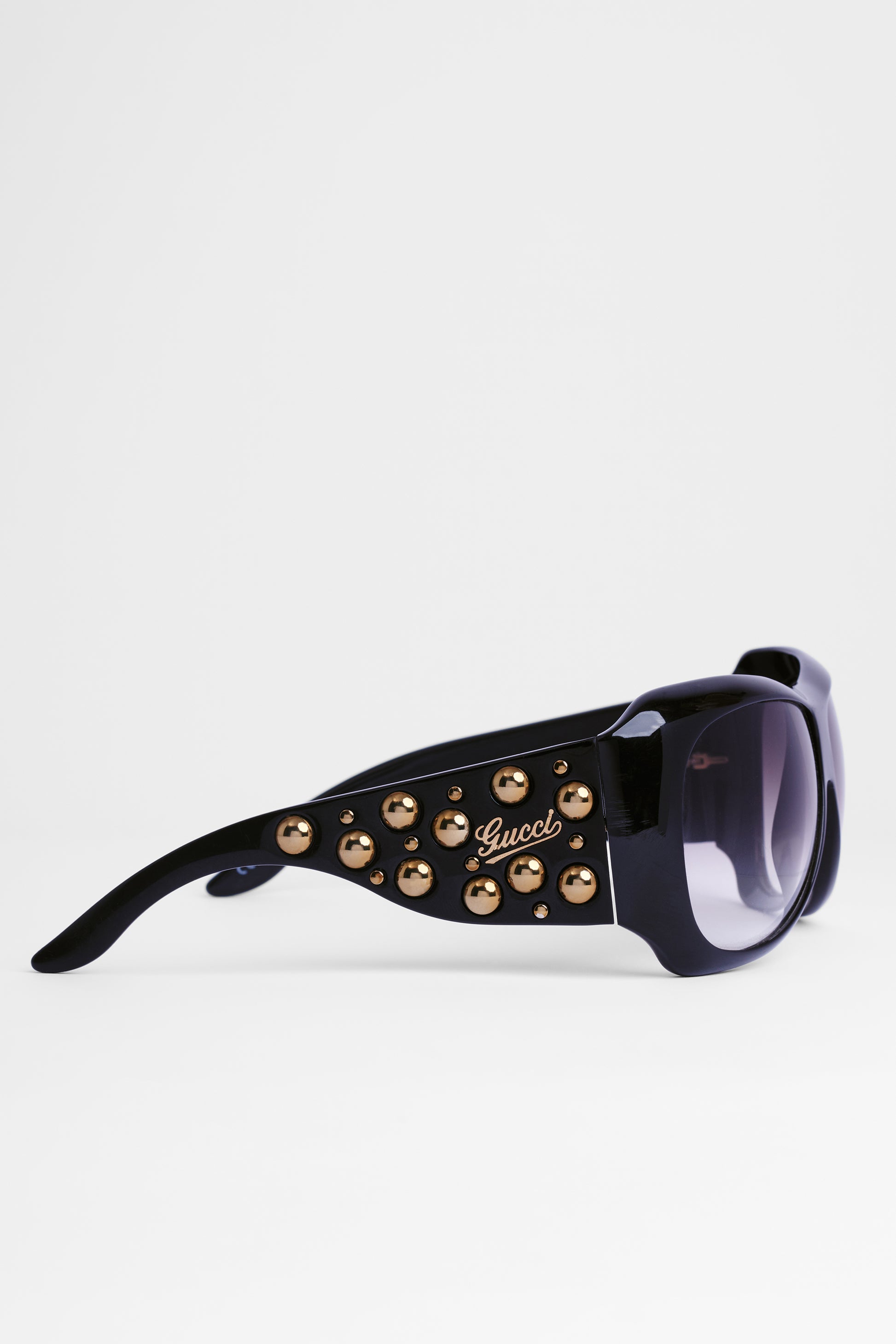 Deadstock Gucci 2000s studded shield sunglasses. Features dark lens, thick black frames and gold studded sides. Comes with the original case. Pre-loved, in excellent vintage condition.