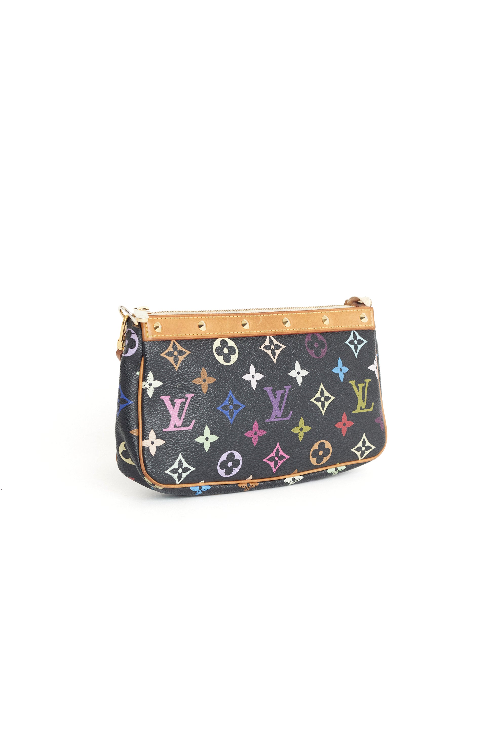 Louis Vuitton x Takashi Murakami 2003 black pochette bag. Features monogram print, zip closure and studding on the strap. In excellent vintage condition.