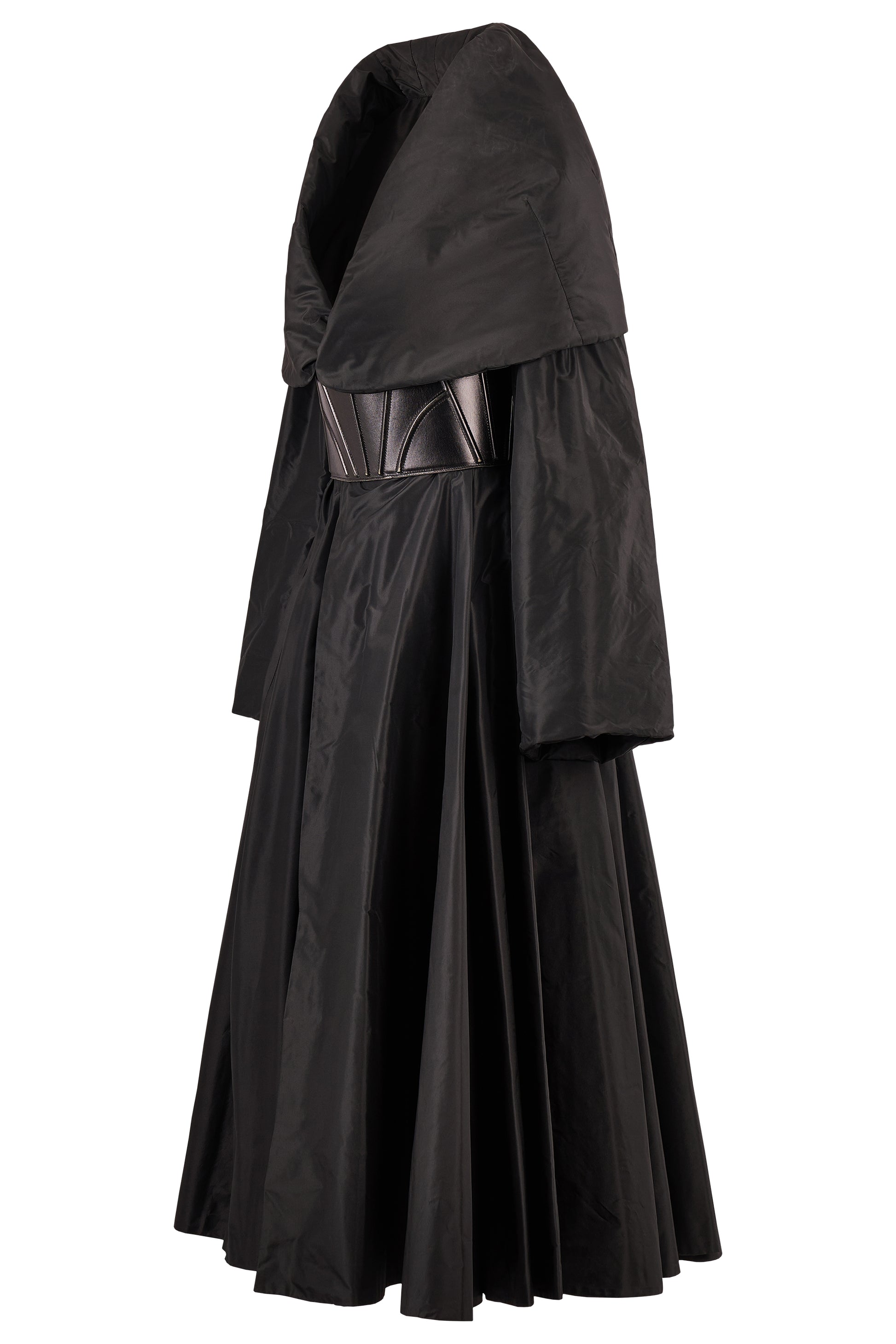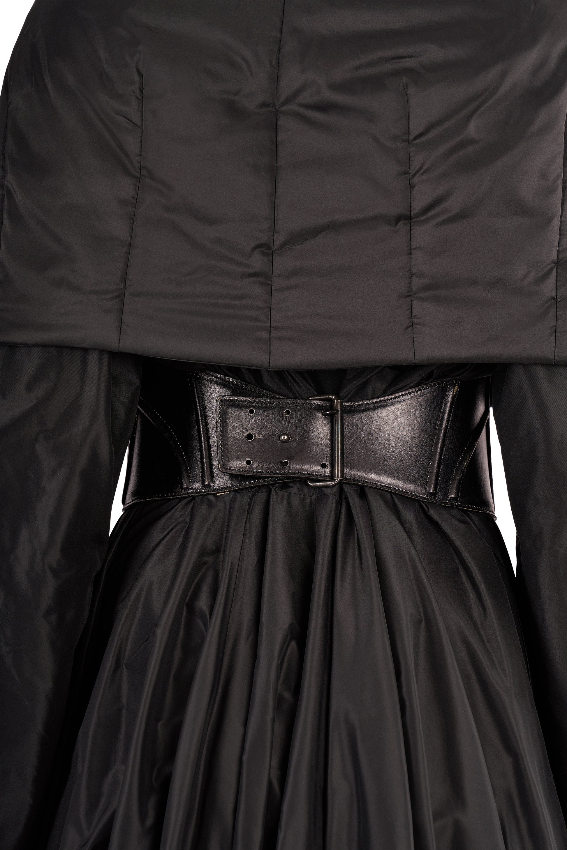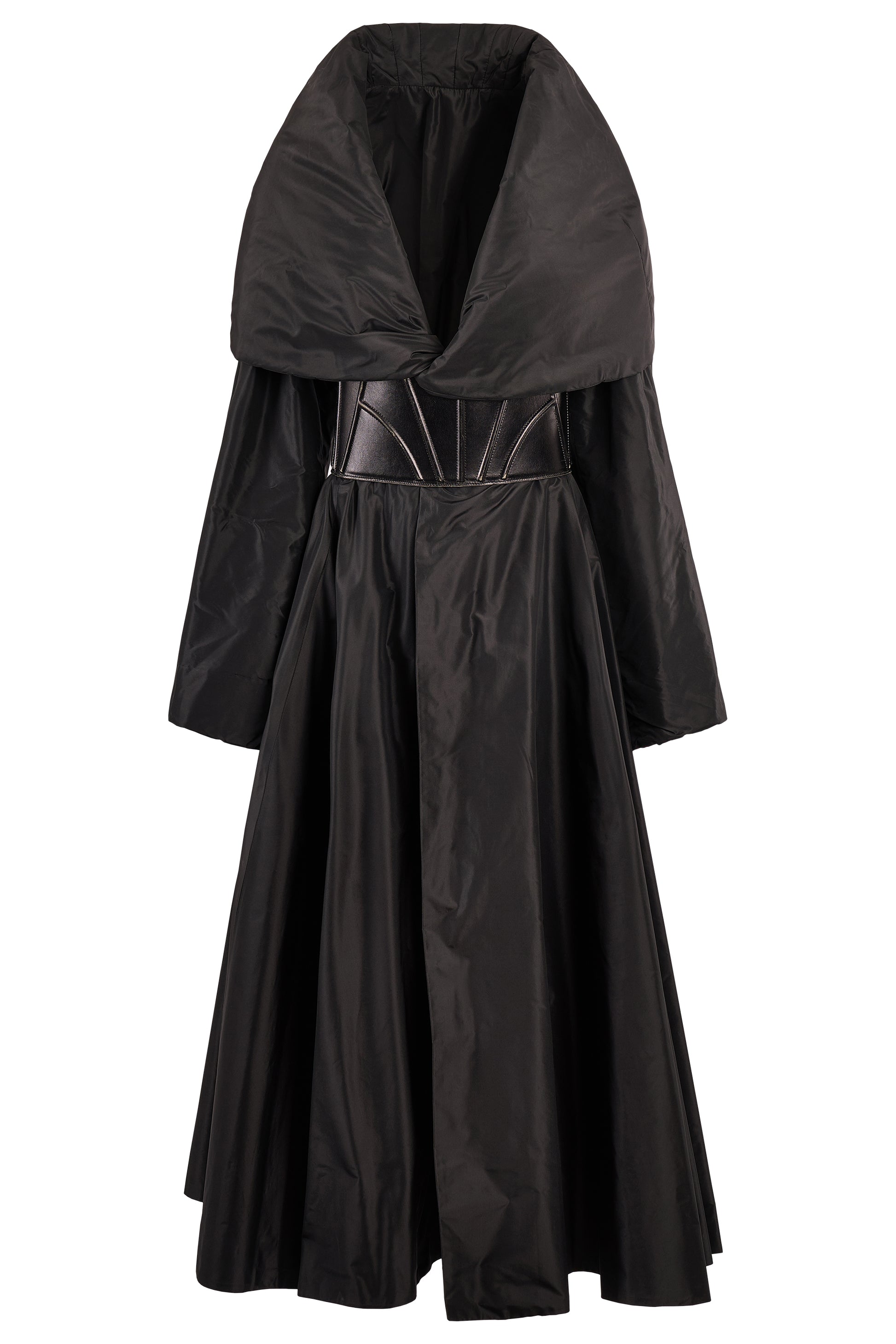 A vintage Azzedine Alaïa black padded long shawl coat with leather corset belt. This amazing coat features a dramatic volume with sculptural tailoring. Crafted in a lustrous black padded fabric, the design features an oversized shawl collar that cascades around the shoulders. Cinched at the waist with a striking black leather corset belt. The full-length cut flows into a voluminous skirt. In excellent vintage condition.