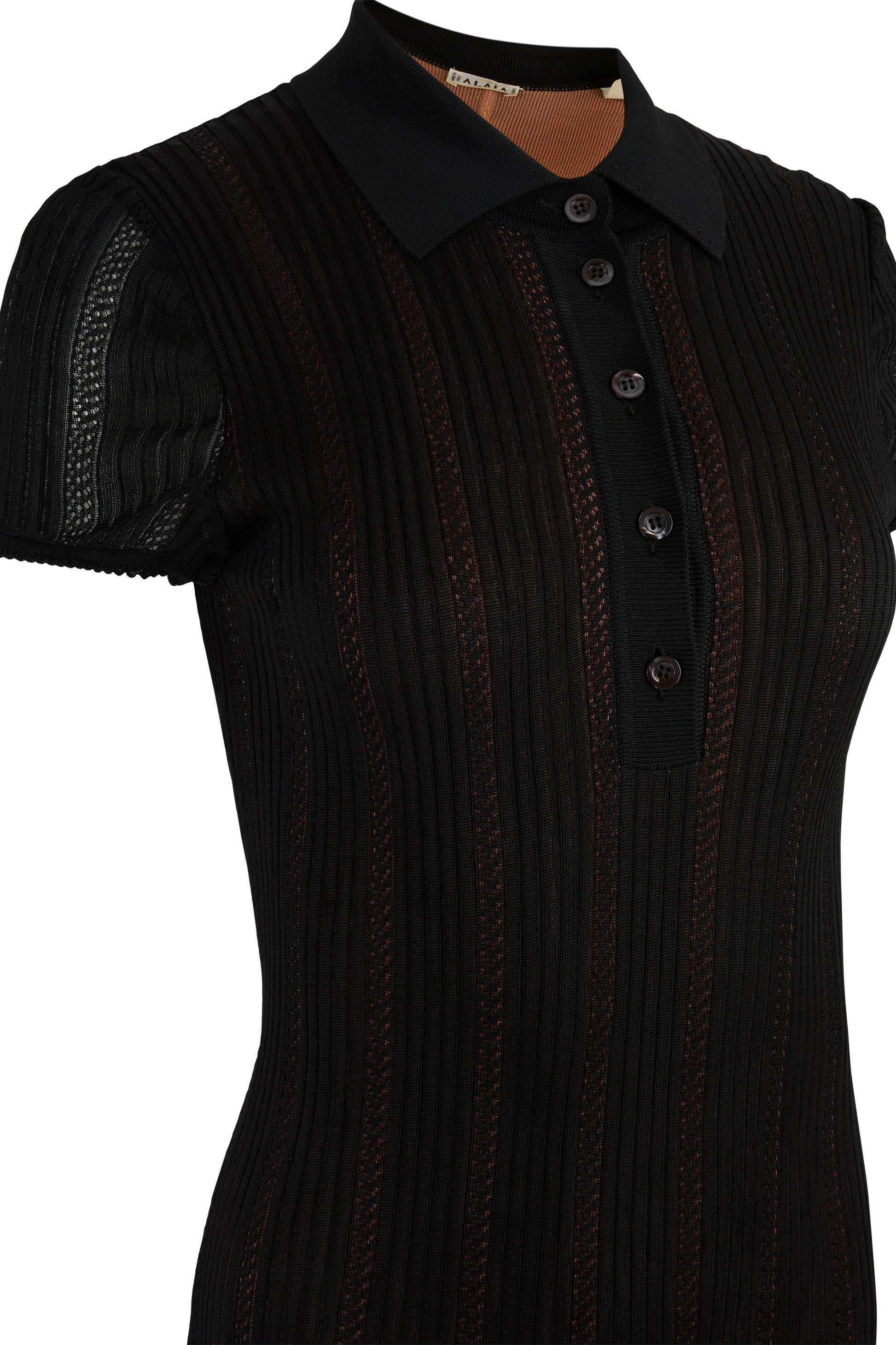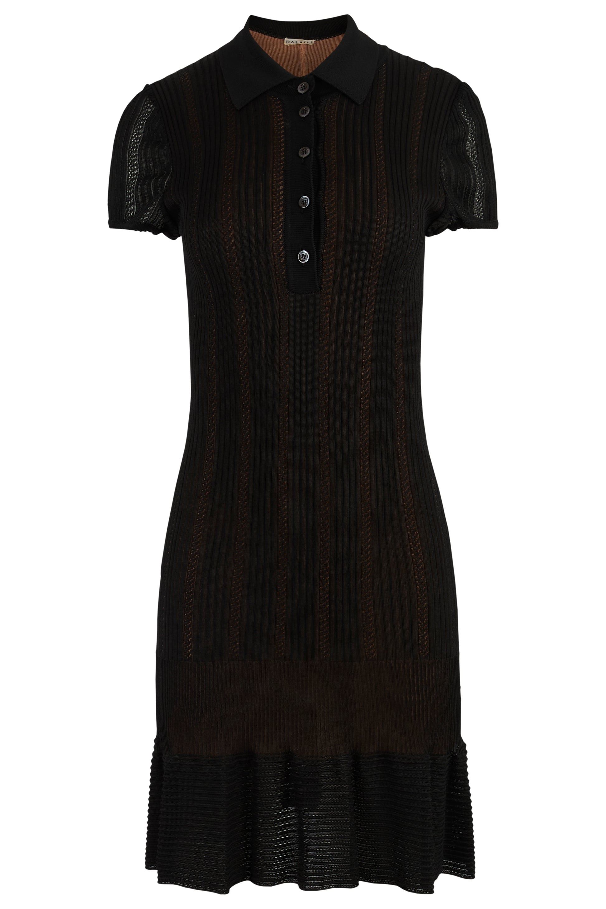 Alaïa black ribbed knit dress. Features vertical ribbing throughout that elongates the silhouette while offering subtle transparency and depth. Polo-style collar and a short buttoned placket. Short sleeves, flared hem and bodycon fit.