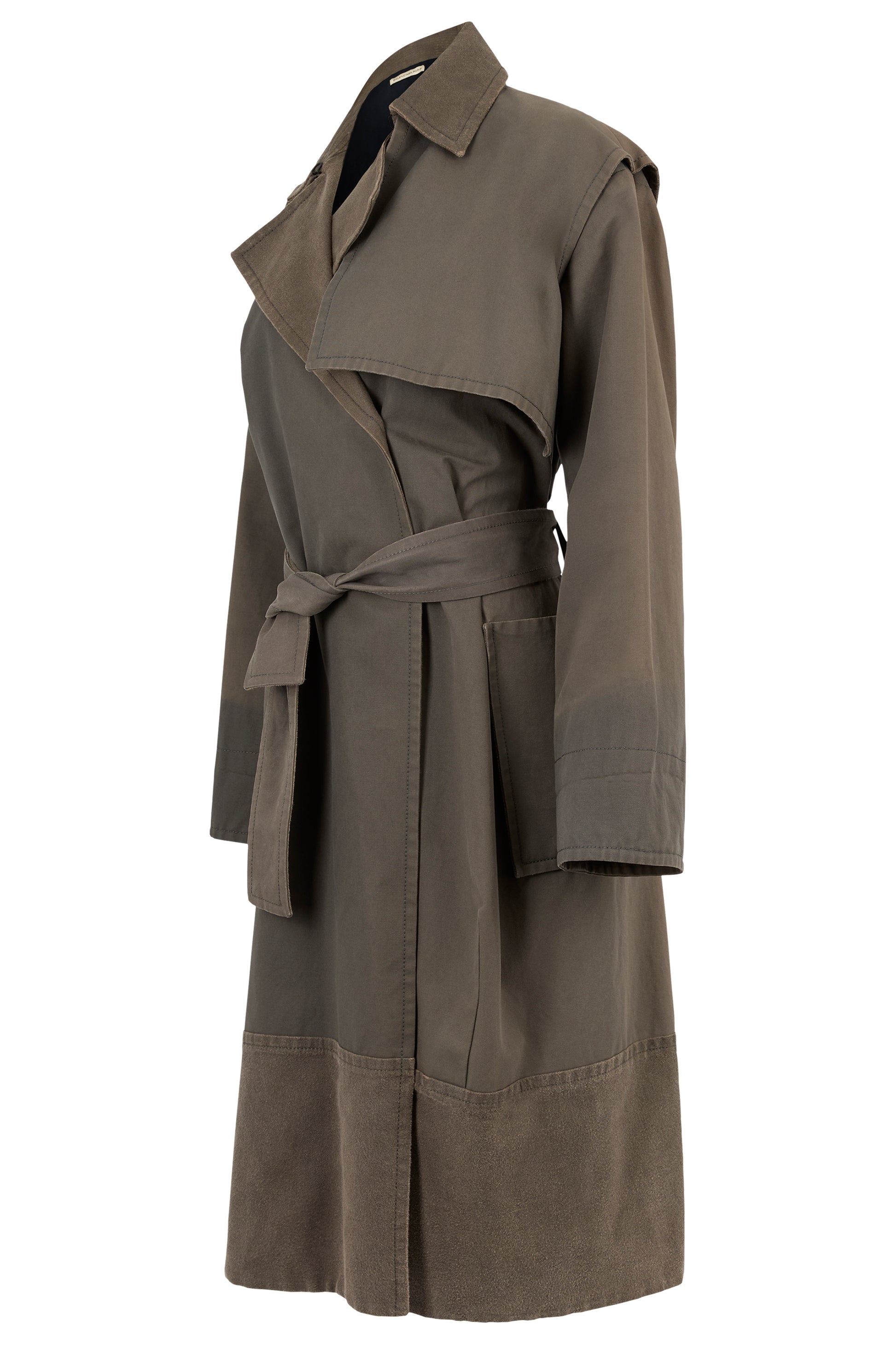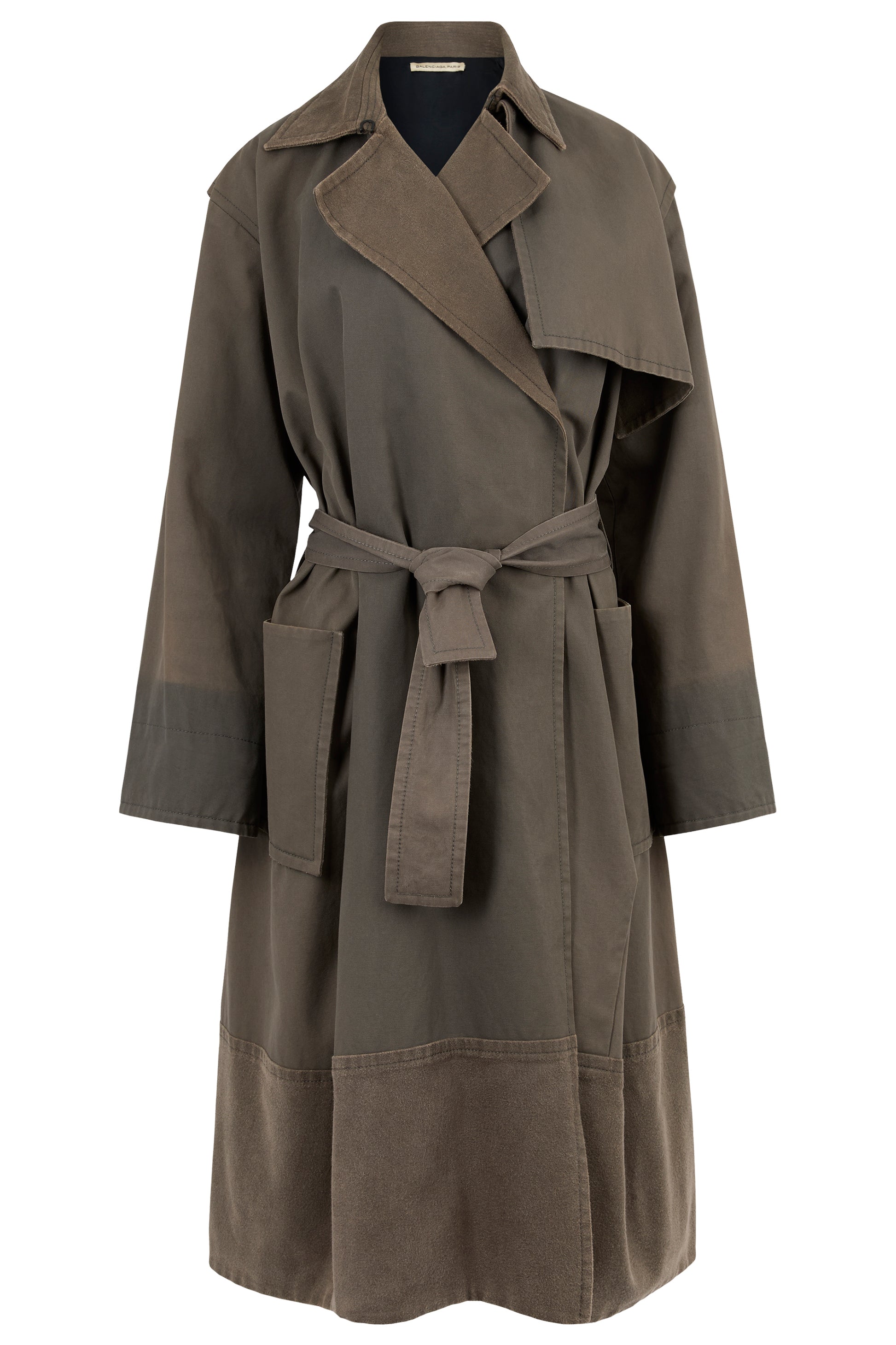 Balenciaga trench coat from the Pre Fall 2012 collection. Features a dark khaki green cotton blend body. Oversized silhouette with belted waist, lapel collar , dropped shoulders, two large front utility pockets. Double breasted style. Fastens with front buttons.