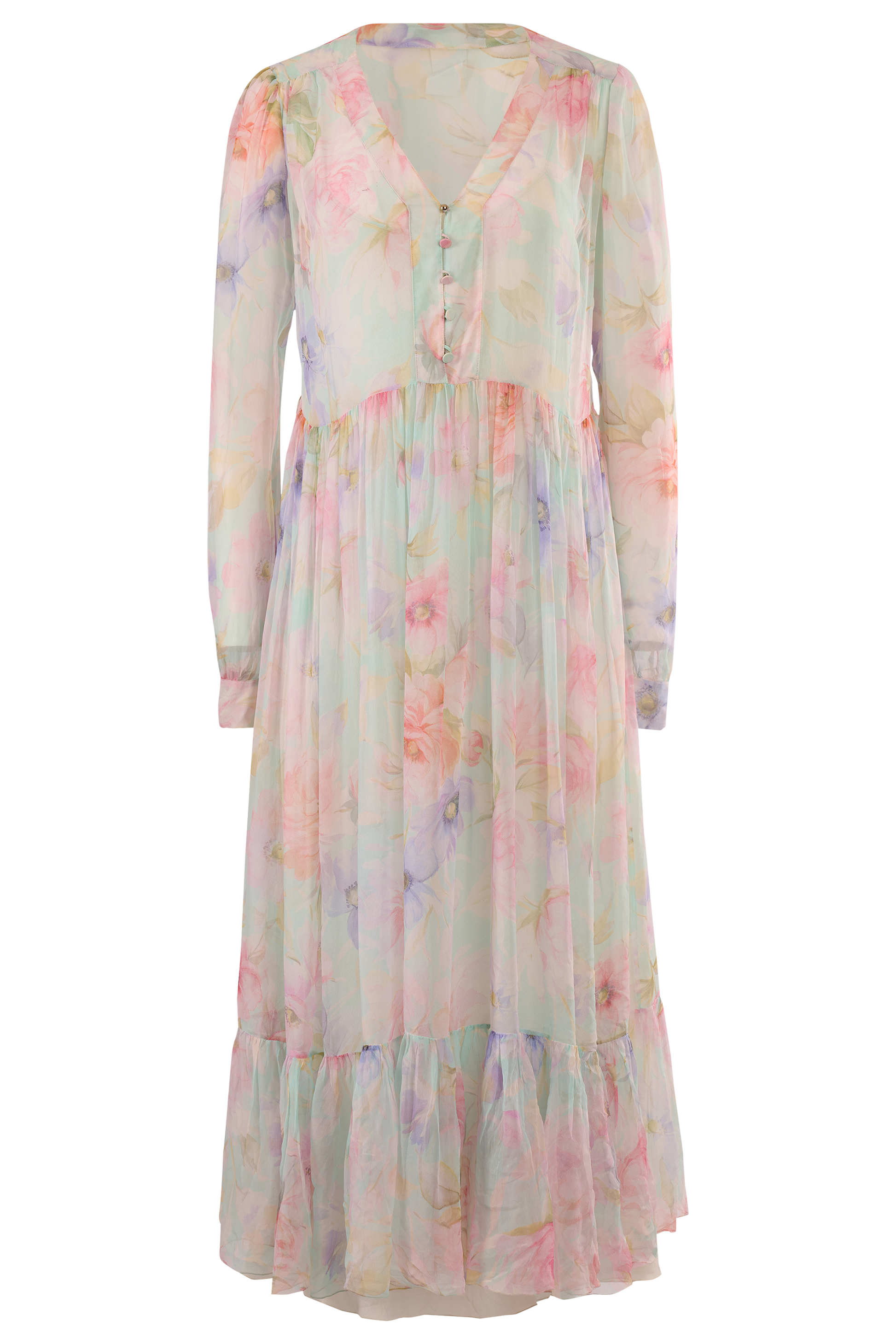 Vintage Blumarine floral maxi semi sheer dress. Features a delicate pastel floral print in soft pink, lavender, mint, and buttercream tones. Crafted from lightweight, semi-sheer chiffon, it features a flattering V-neckline with dainty button detailing, long sheer sleeves, and a gently gathered waist that flows into a voluminous tiered skirt. In excellent vintage condition.