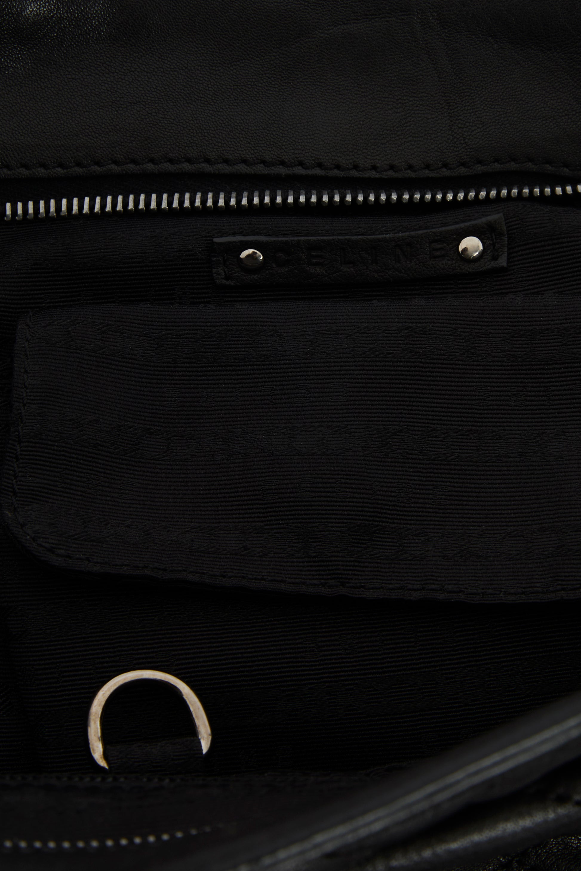 Vintage 2000's Celine leather bag. Features a black quilted leather, punctuated with discreet silver-tone Céline emblems, softly padded top handle secured by polished metal rings, lending both comfort and a sculptural edge. A drawstring-style leather tie with a small padlock detail, inside zip pocket and other small compartment. Fastens with a top zip closure .