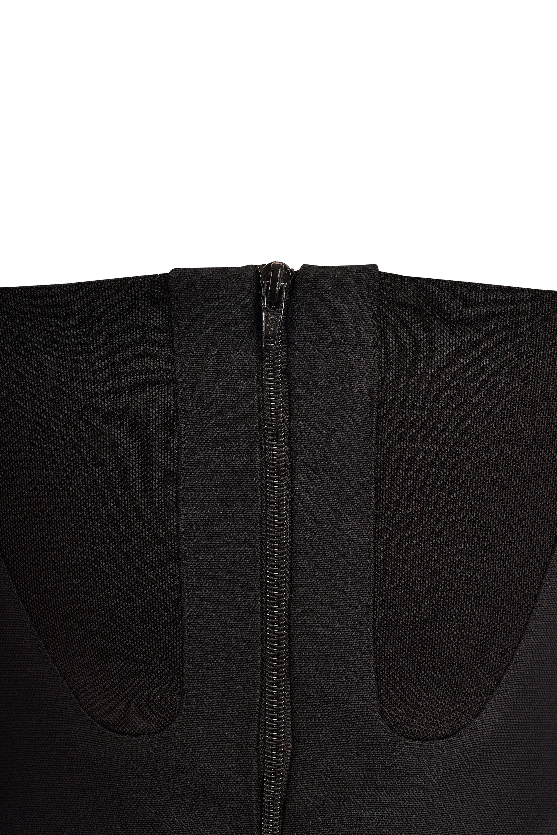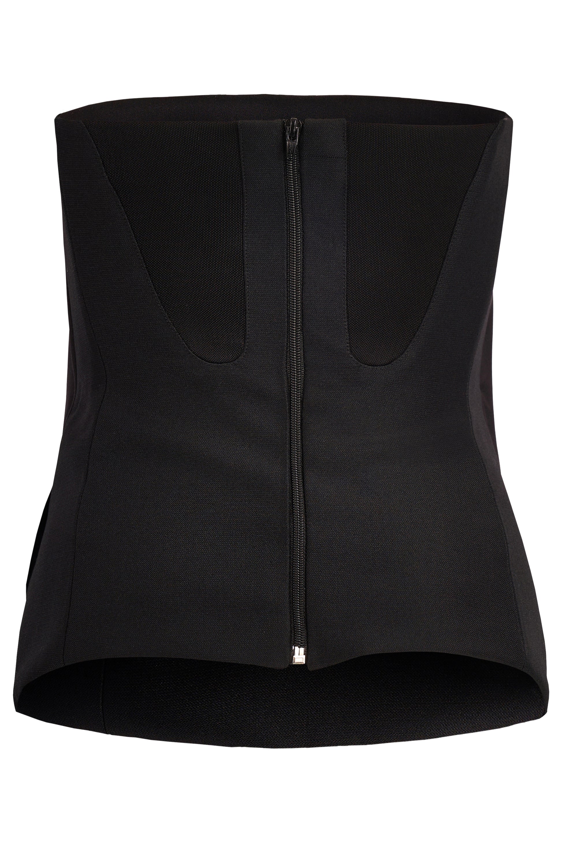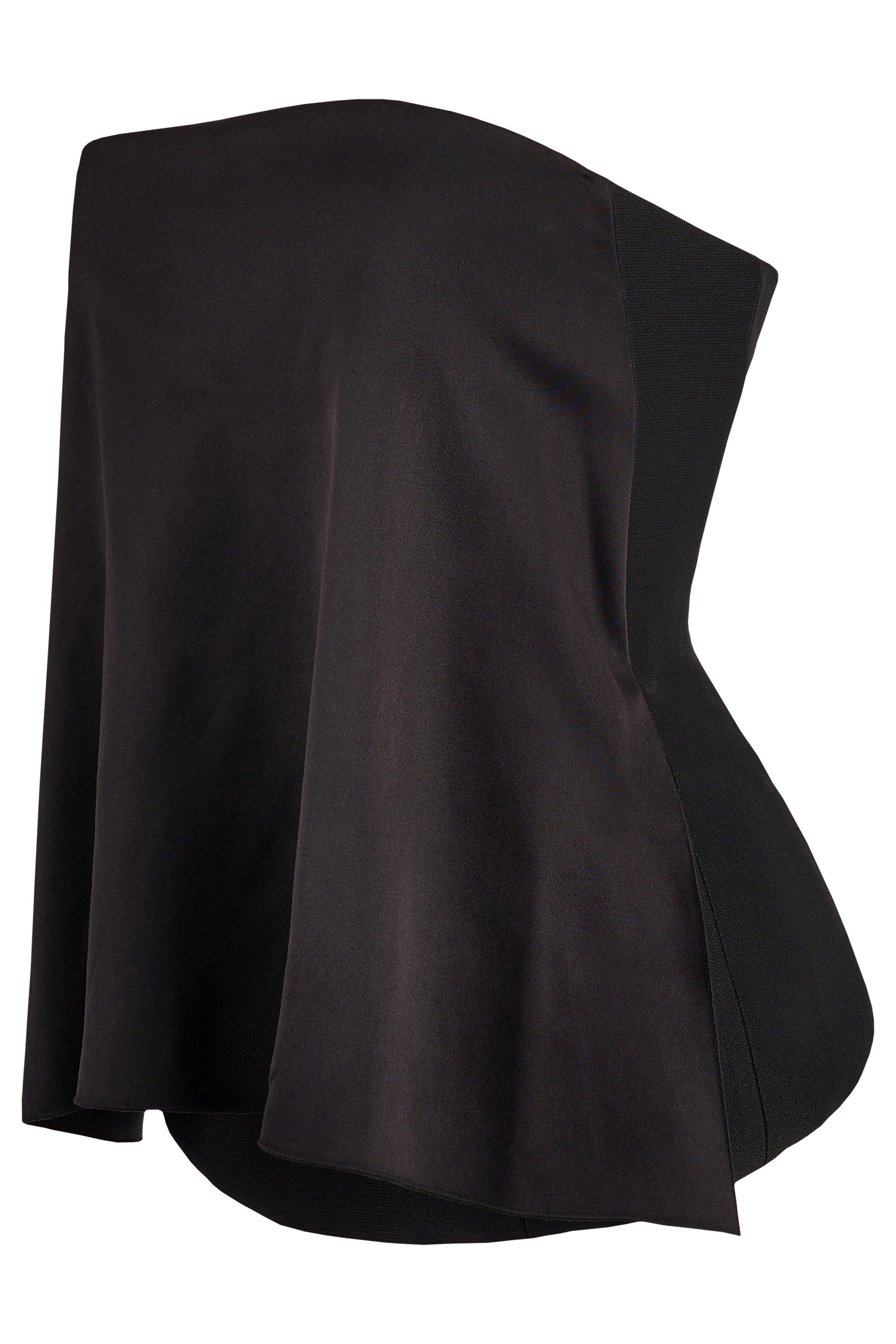 Celine silk corset top features a sculpted silhouette, a black silk fluid fabric at the front, strapless neckline, softly flared overlay that drapes beautifully over a structured knit corset base. Fastens with a back zip . In excellent condition.