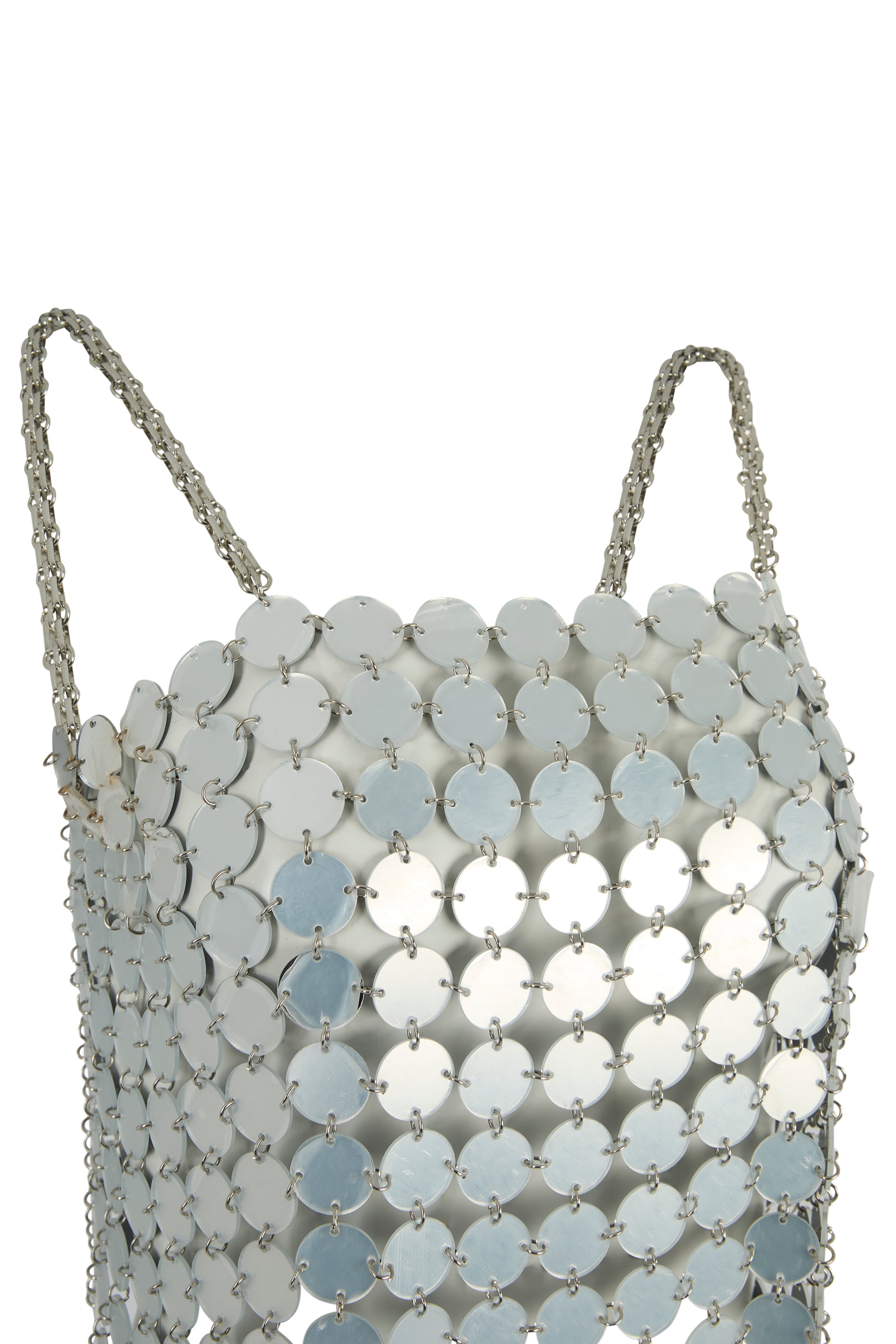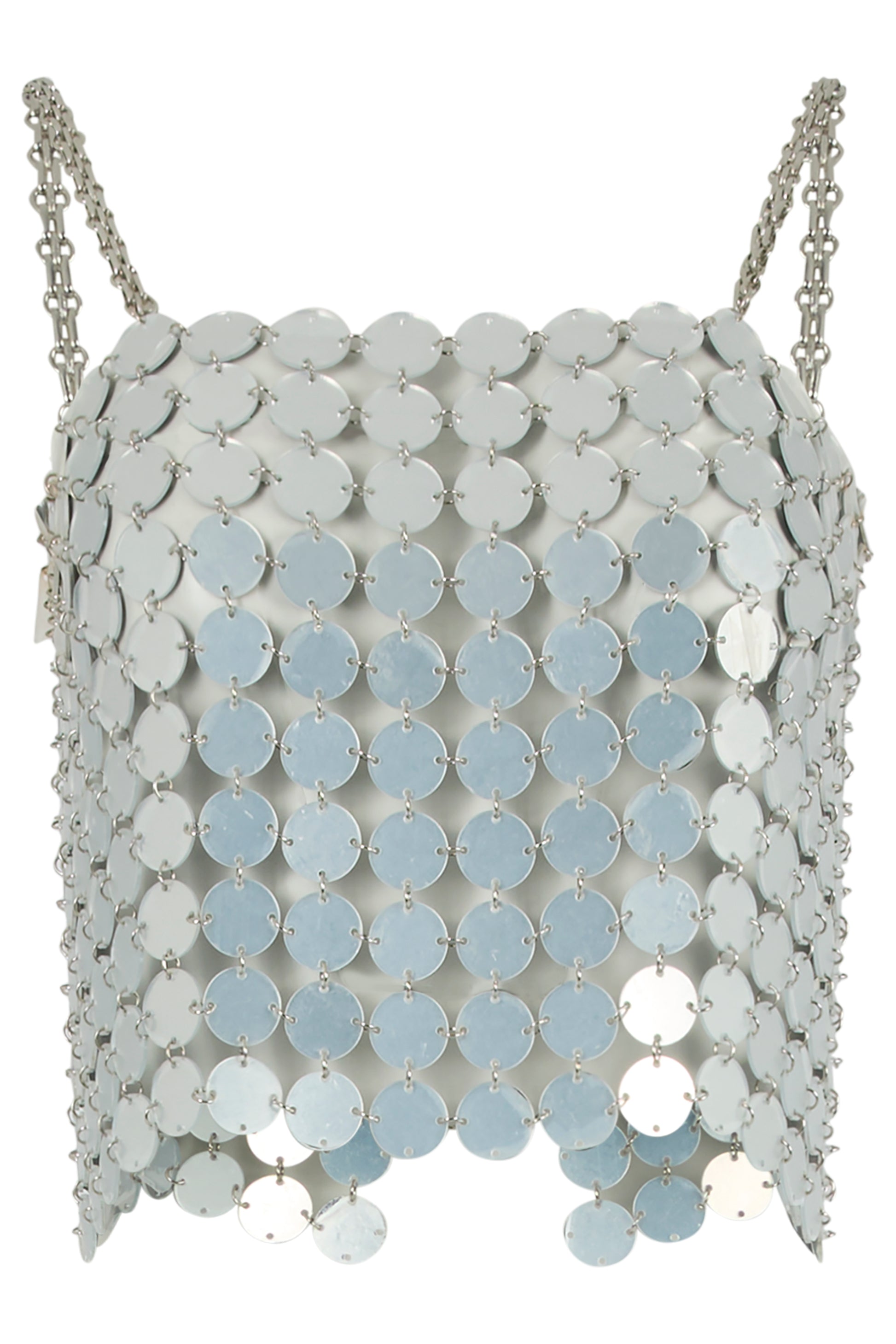 Vintage 1980's Pedro Rodriguez Chain Silver Top. Made with round acetate and metal chain mill. Mirror style reflective material. Chain straps. Front metal closure. In excellent vintage condition.