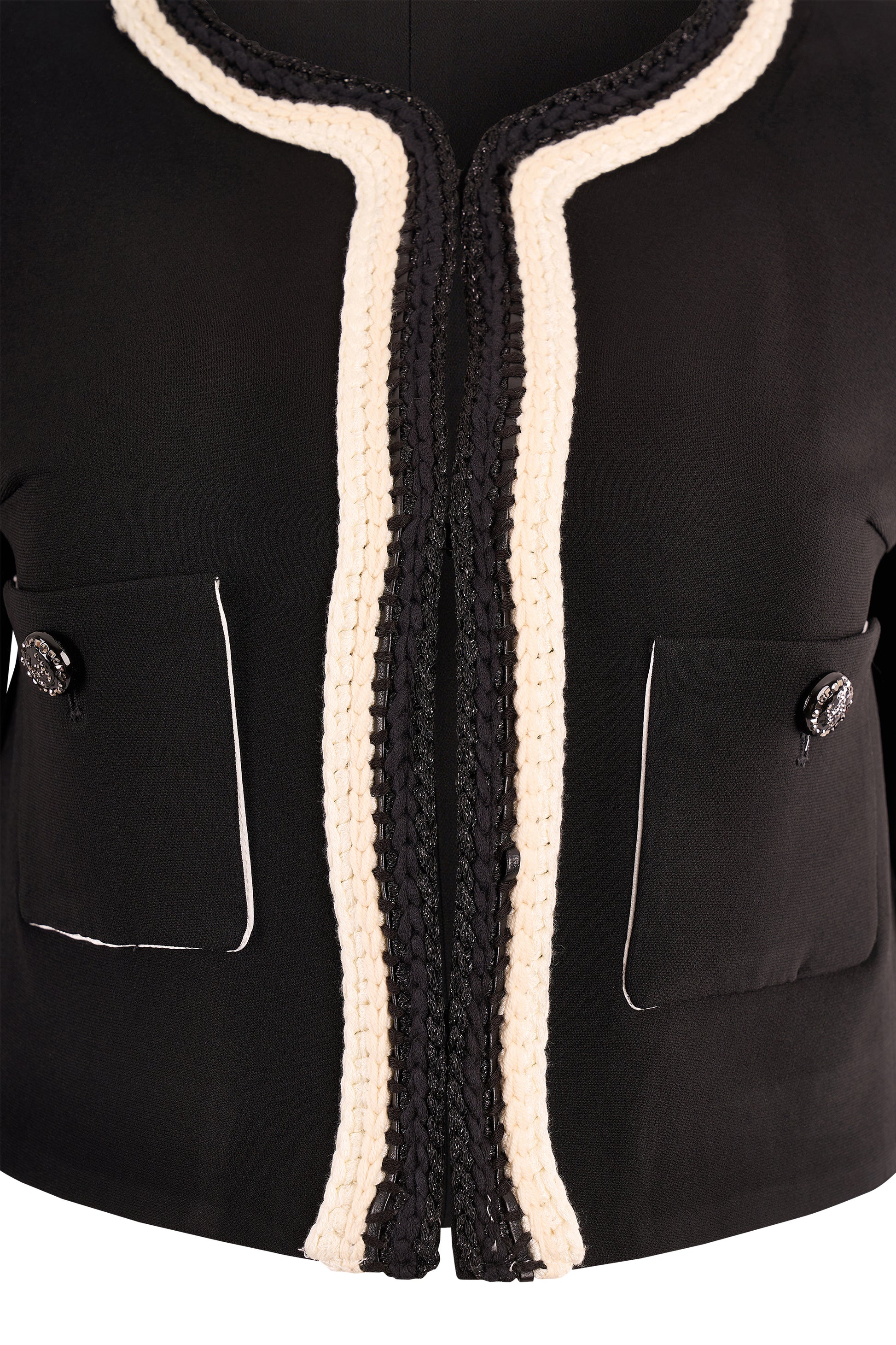 Chanel 2022 Cruise Black Braided Fitted Bolero Jacket. This Chanel is featured in the cruise 2022 show, being look 4 on the runway collection. This piece features a braided detailing as the trimming of the jacket, in a black and white colouring. Very typical of Chanel. With a silk lining. With crystal buttons on the front two pockets and the cuffs. In excellent Condition.