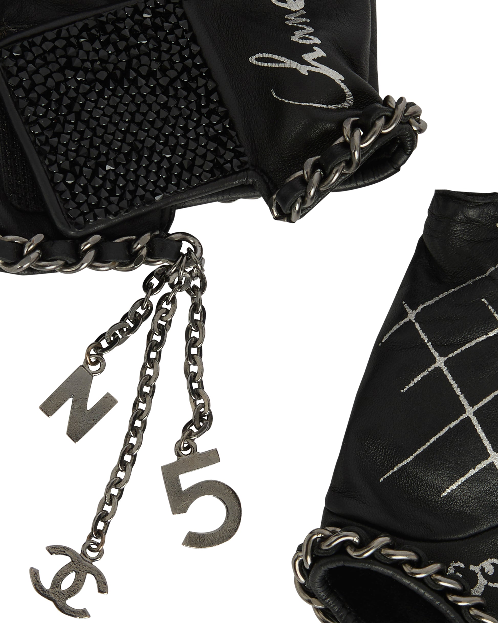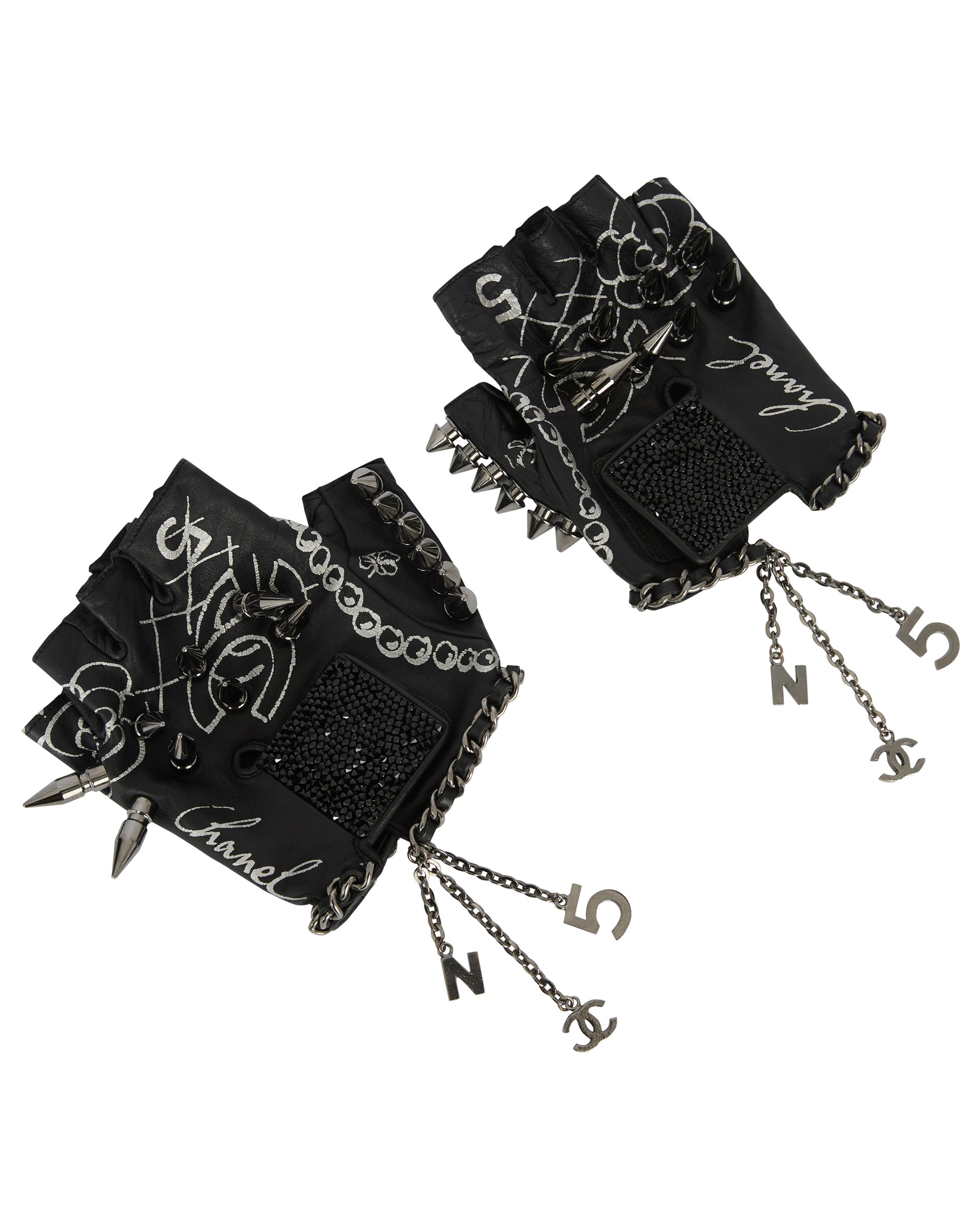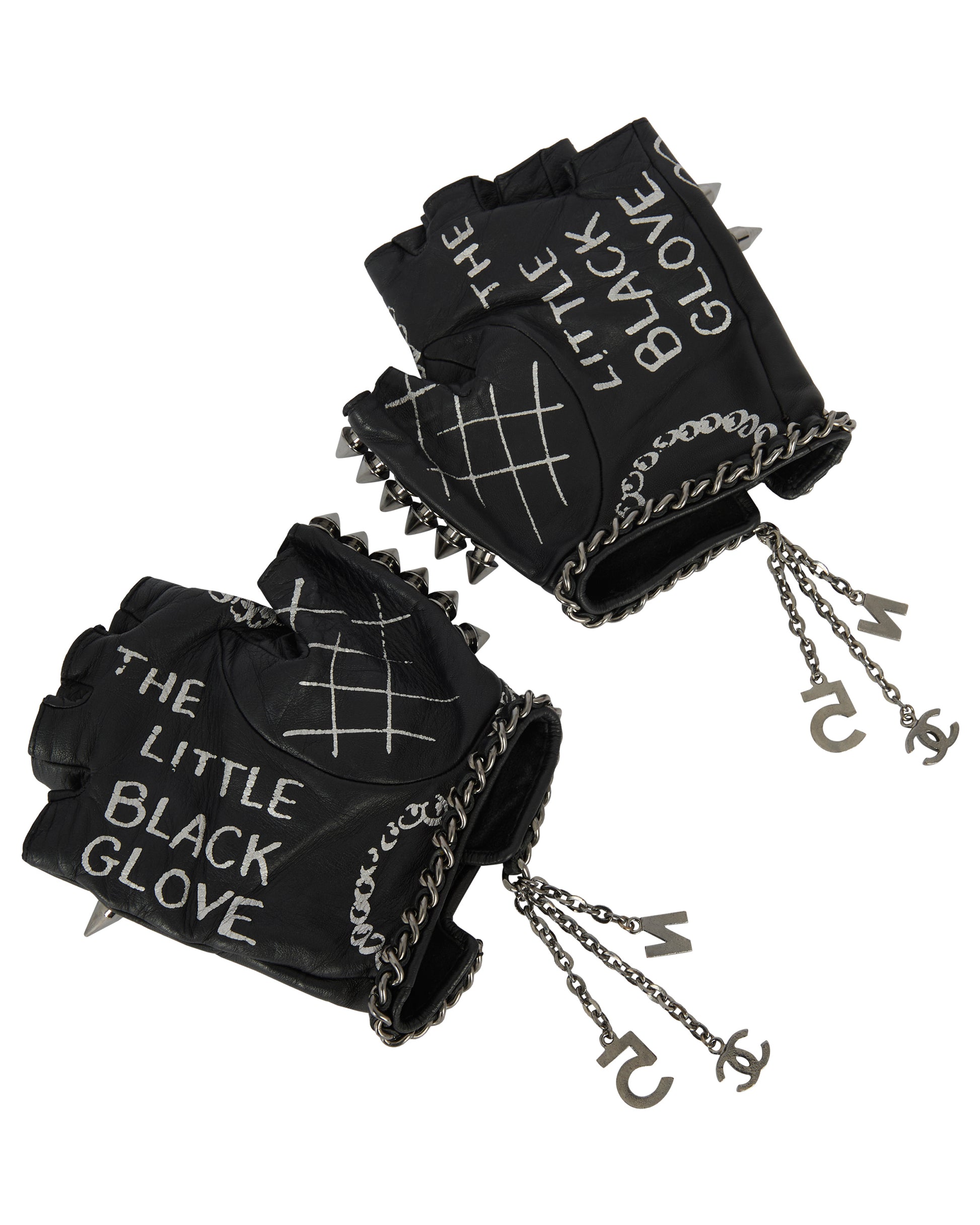 A powerful runway statement from Chanel Autumn/Winter 2013, these fingerless leather gloves by Karl Lagerfeld. Features a supple black leather, the gloves are boldly embellished with silver-tone spike studs, heavy chain detailing, and graphic hand-painted-style typography reading “The Little Black Glove”.
