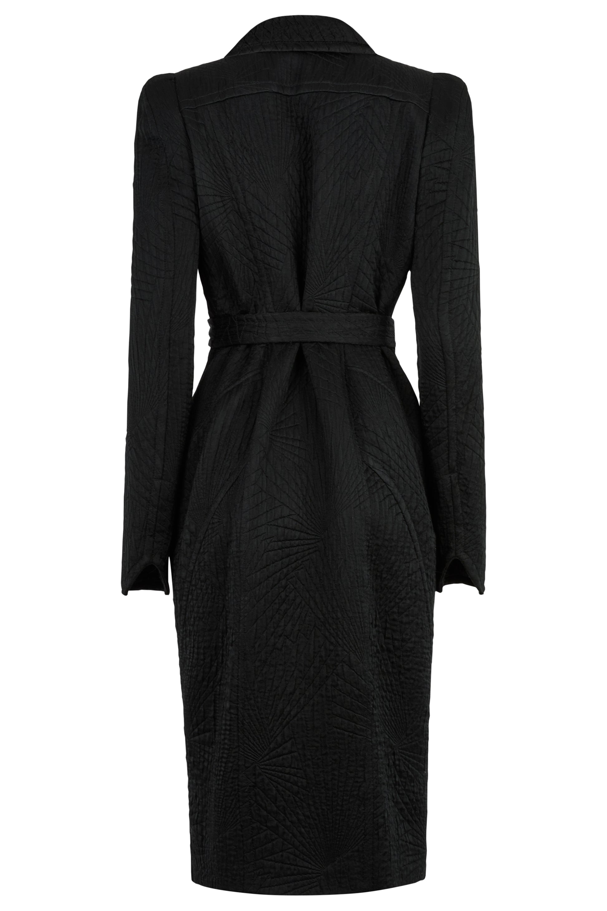 Vintage Yves Saint Laurent Fall/Winter 2004 collection, Features a structured longline fit, sculptural black jacquard with a subtle quilted texture. Tailored with a self-tie belt to define the waist and elegant velvet bow closures. In excellent vintage condition.