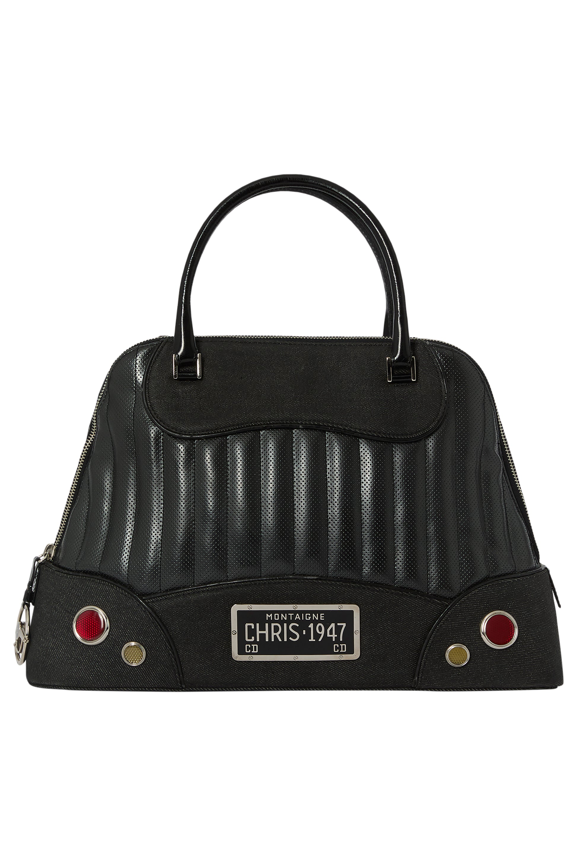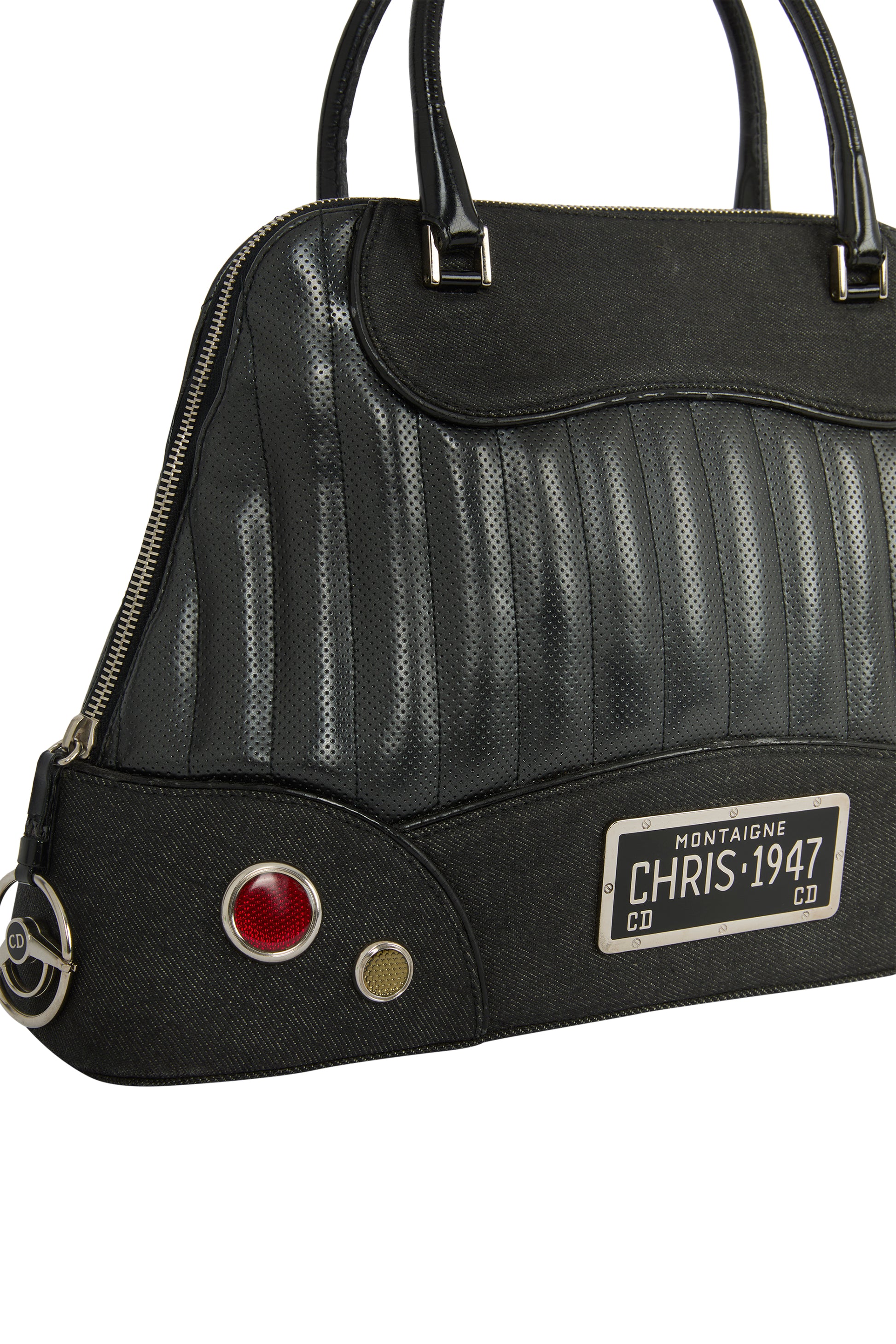 Vintage Christian Dior Montaigne bag from the Spring Summer 2001 collection. A reference to the legendary year of the House’s first haute-couture collection and the brand’s address at 30 Avenue Montaigne. This model features an automobile design, a motif that recurs on the offering with a metal licence-plate plaque inscribed “MONTAIGNE CHRIS 1947”, and circular red and gold accents evoking vehicle tail lights. black leather body and black denim details , leather black patent top handles, two inside pockets and one large main compartment. Fastens with a silver top zip closure.
