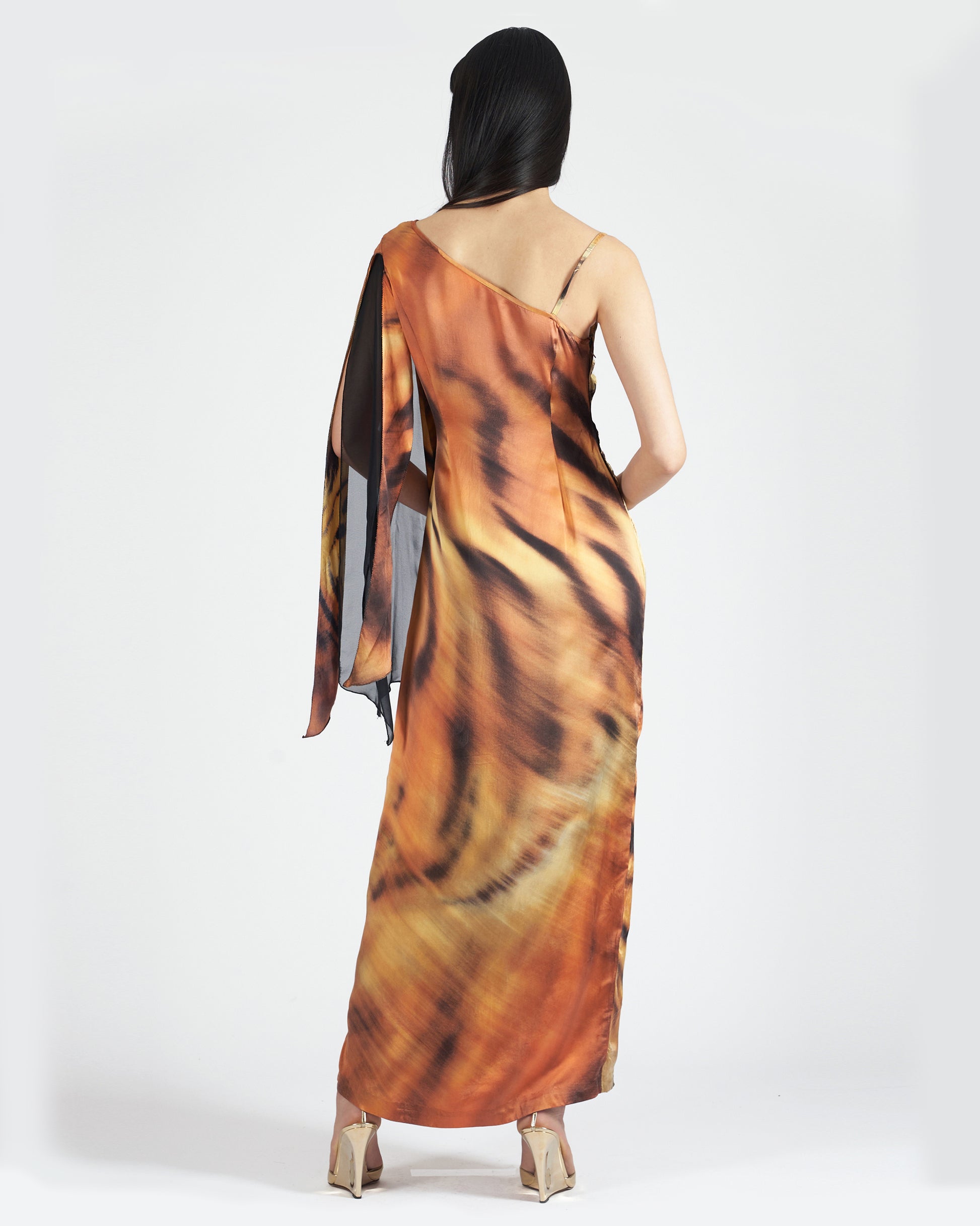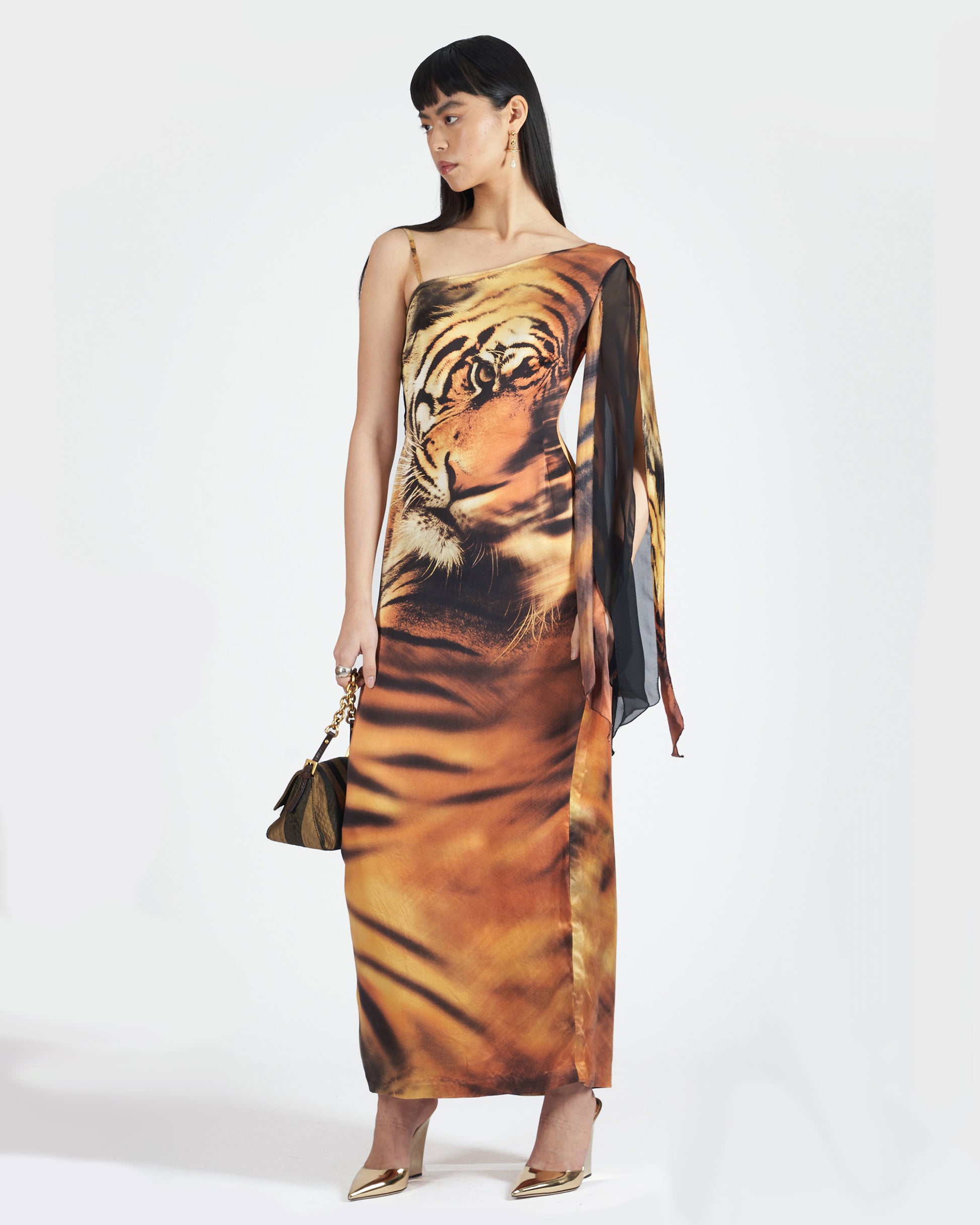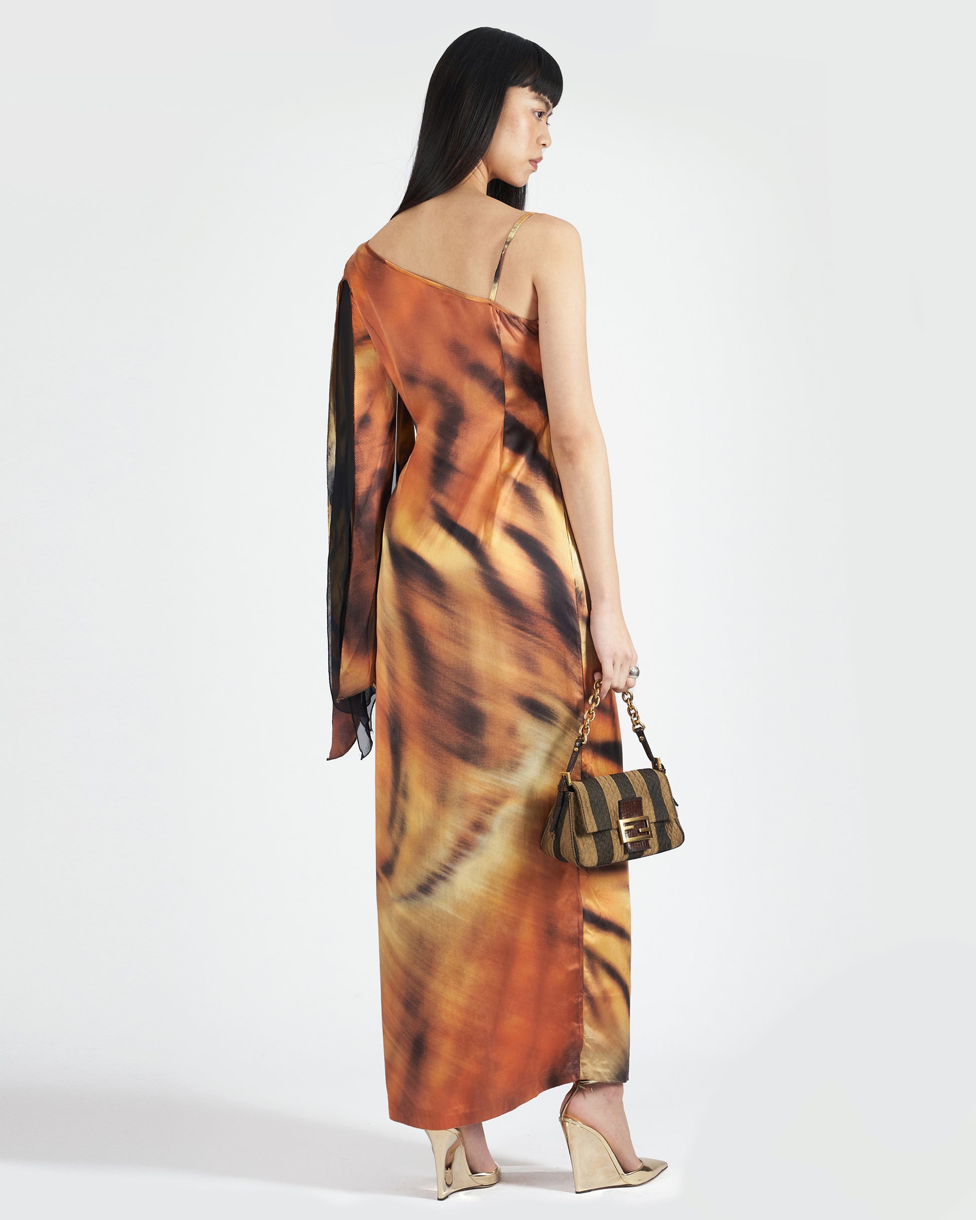 Roberto Cavalli Fall Winter 2000 reworked tiger print dress. Features asymmetrical straps, zip side closure and maxi length. In excellent vintage condition, a few stitching inconsistencies on the inside - not noticeable from the outside. As seen on the Kardashians.