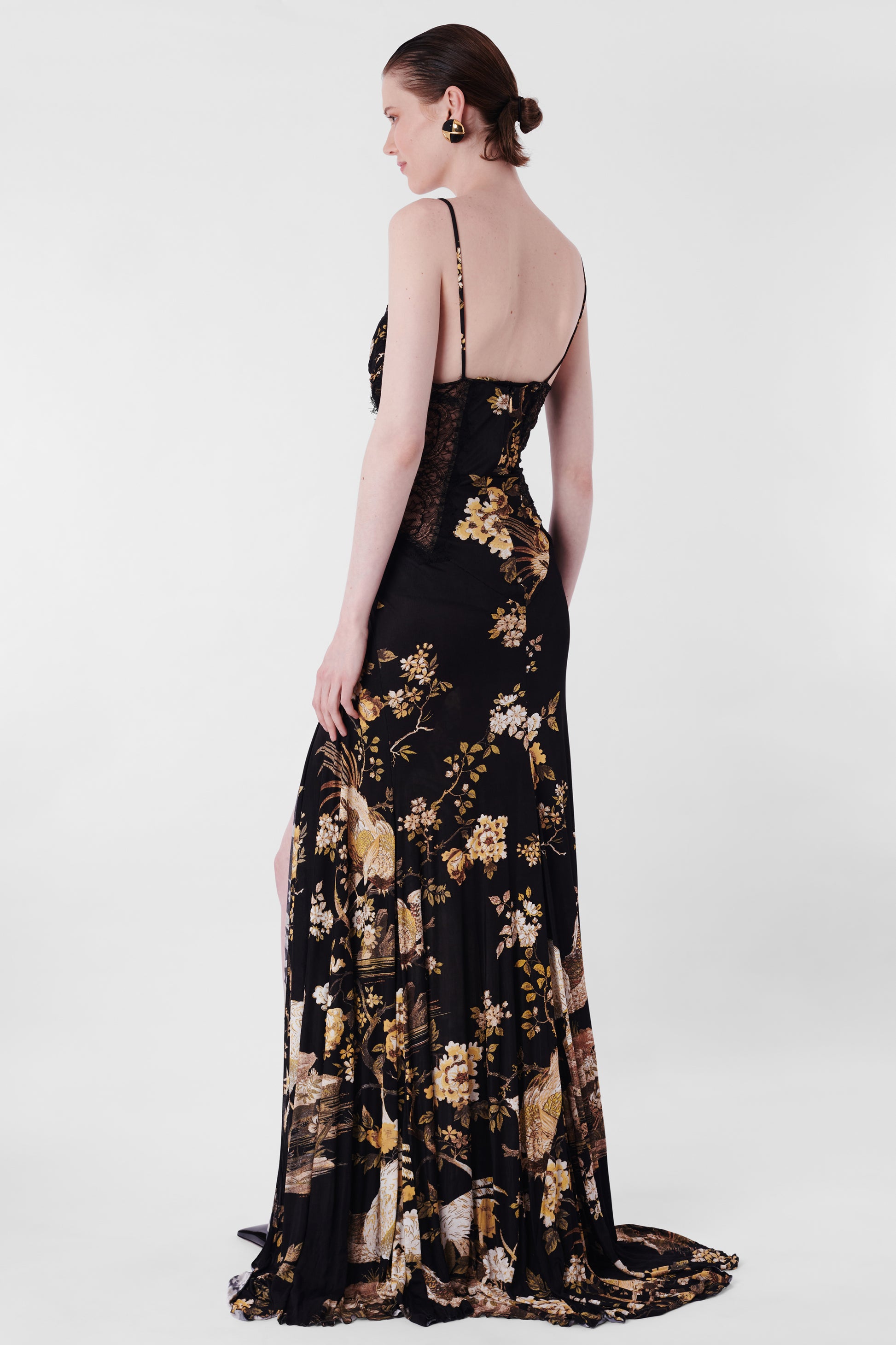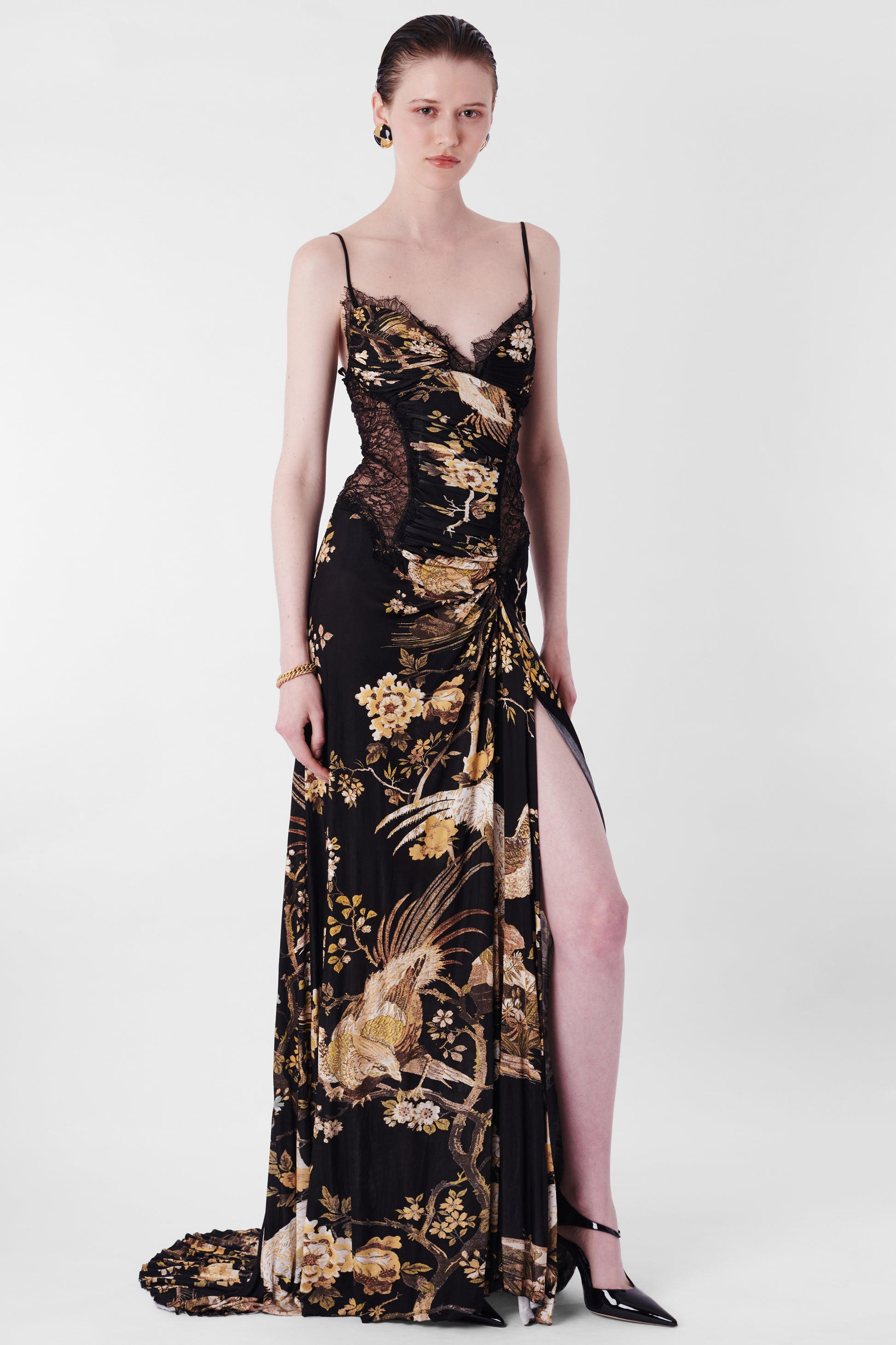 Vintage Roberto Cavalli F/W 2006 Floral And Lace Gown. Features padded cup, lace details on waist and neckline, high slit down side of leg and concealed back zipper. In excellent vintage condition.