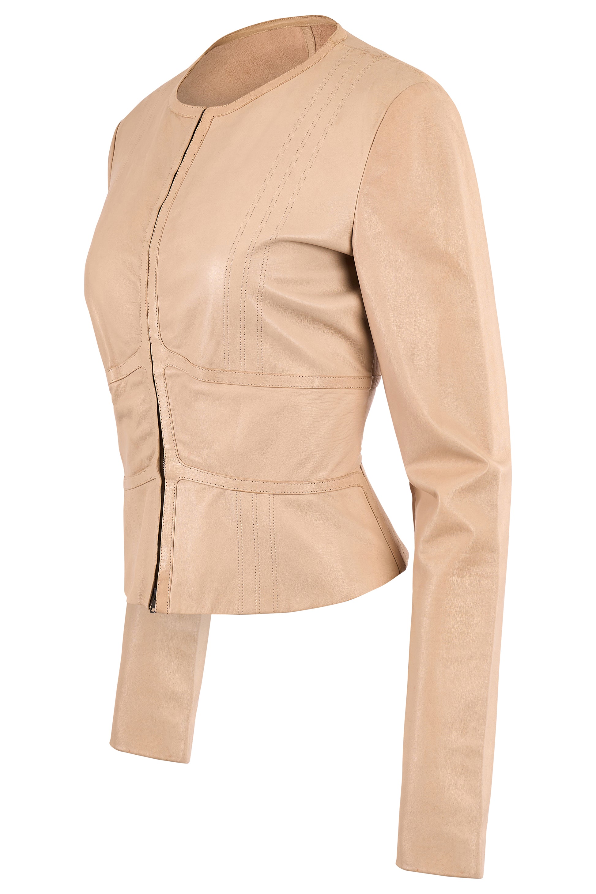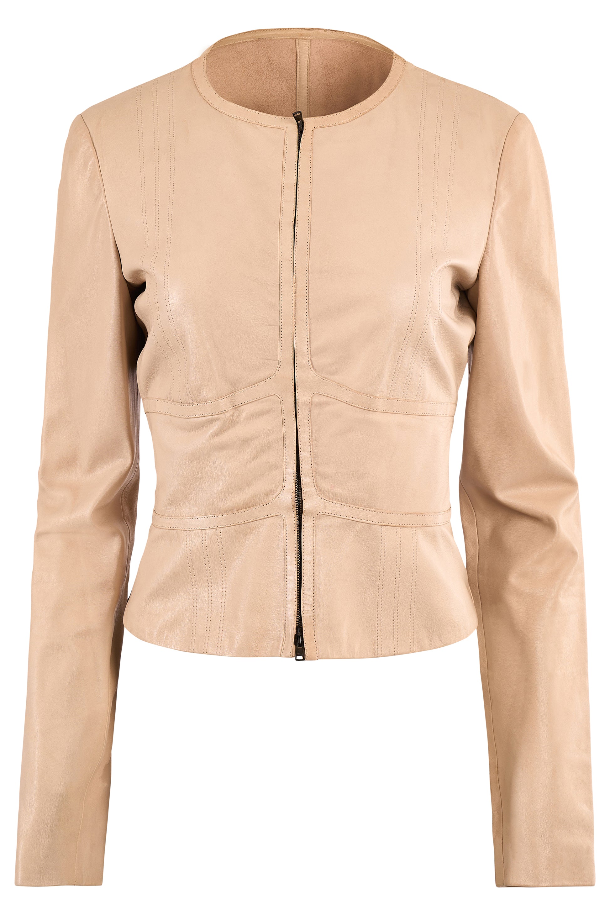 Gucci by Tom Ford leather jacket. Features a smooth nude leather with a refined minimalist silhouette, round neckline, subtle panel stitching that contours the body . The tailored fit flatters the waist, front double zip closure. In excellent vintage condition.