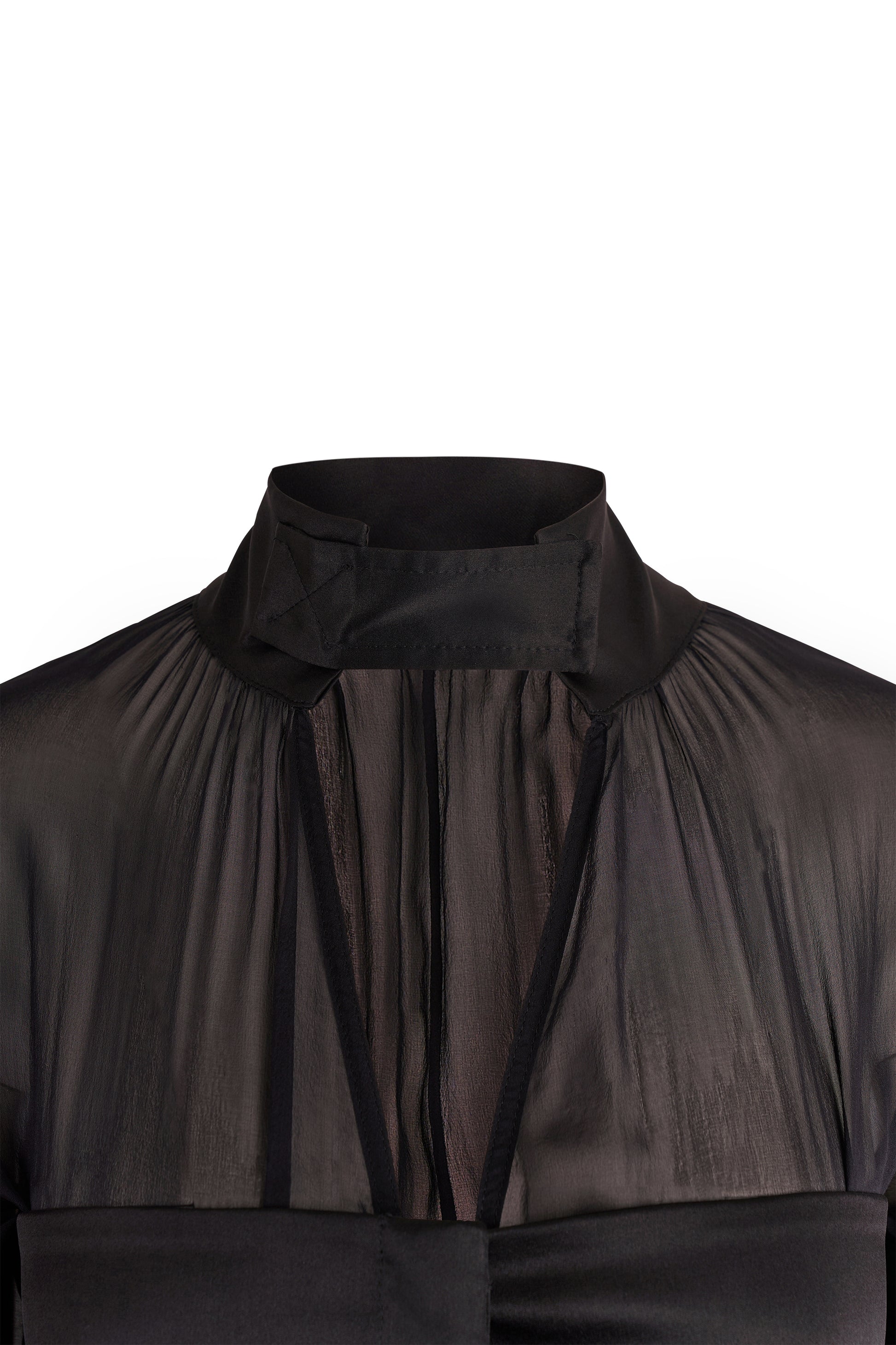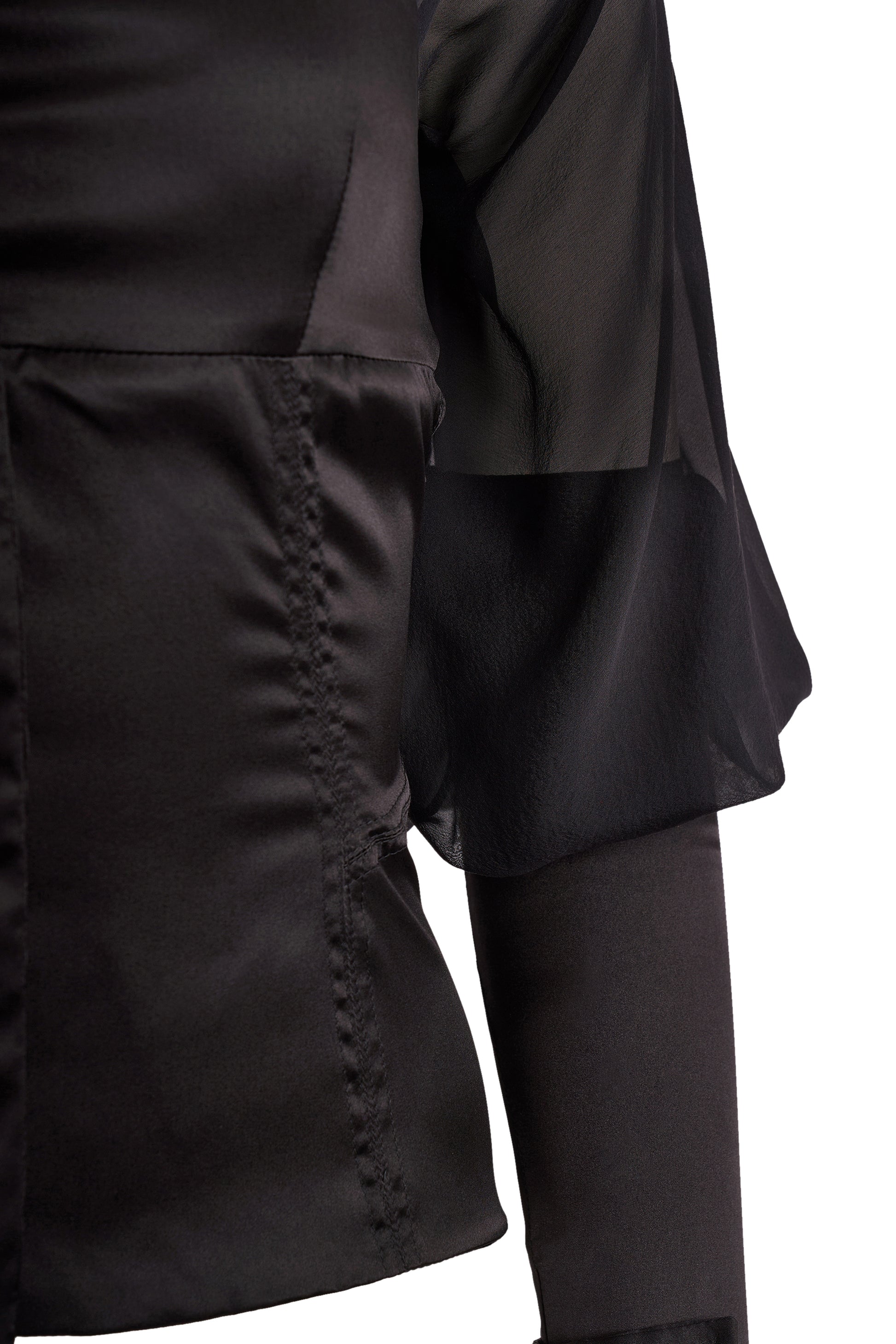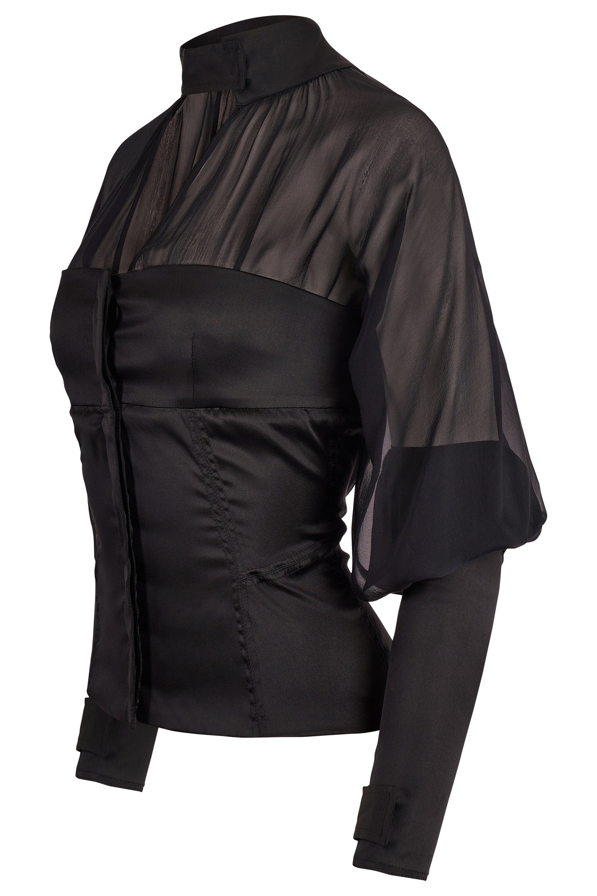 Gucci by Tom Ford Autumn/Winter 2003 black silk sheer blouse. Features a lightweight black silk chiffon ,fluid batwing sleeves, a structured satin bodice, and a dramatic V-cut neckline anchored by a high collar. Delicate ruching at the seams, fitted cuffs with zips and button tabs nod to Ford’s signature detail-driven approach. It fastens with hidden front buttons. In excellent vintage condition.