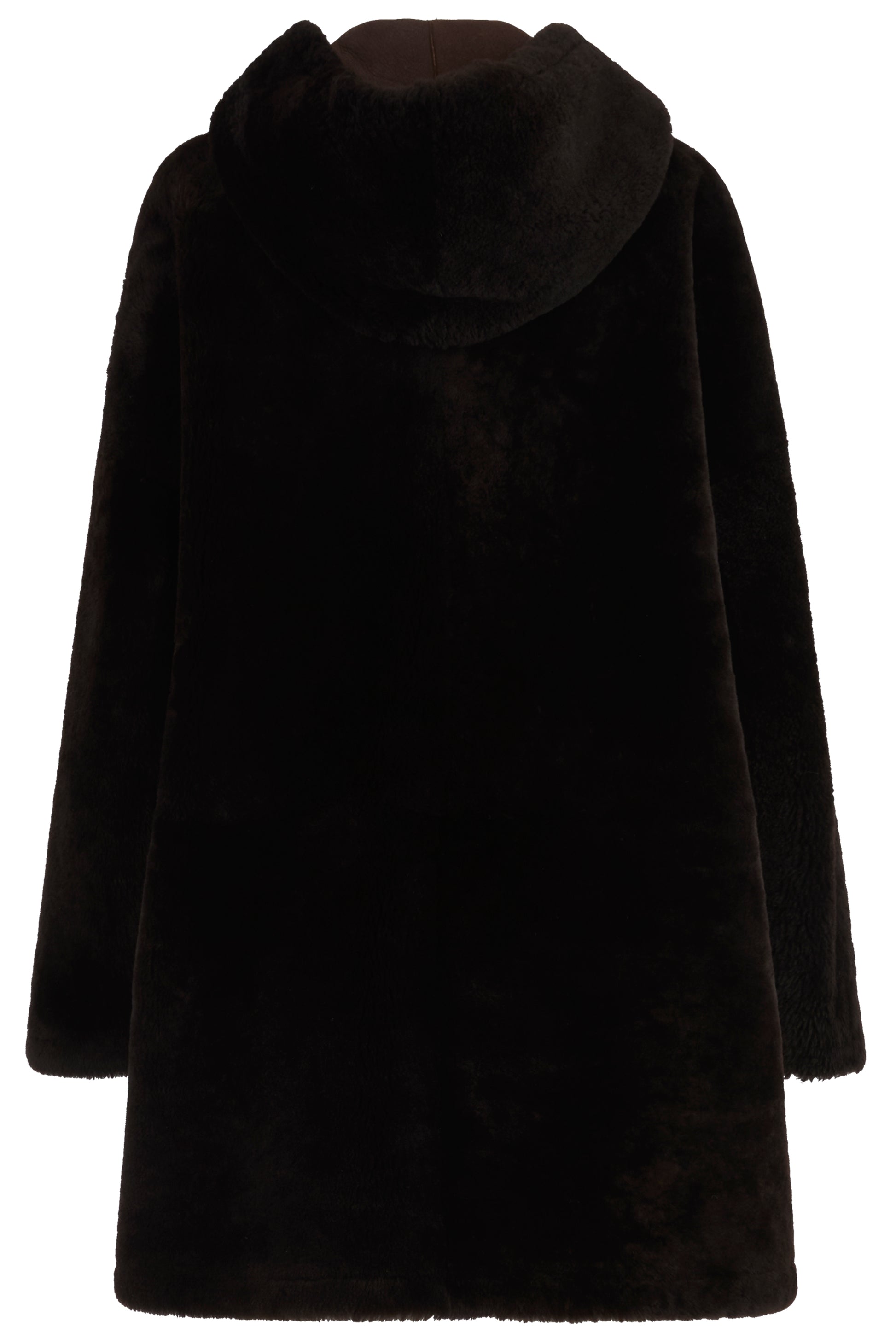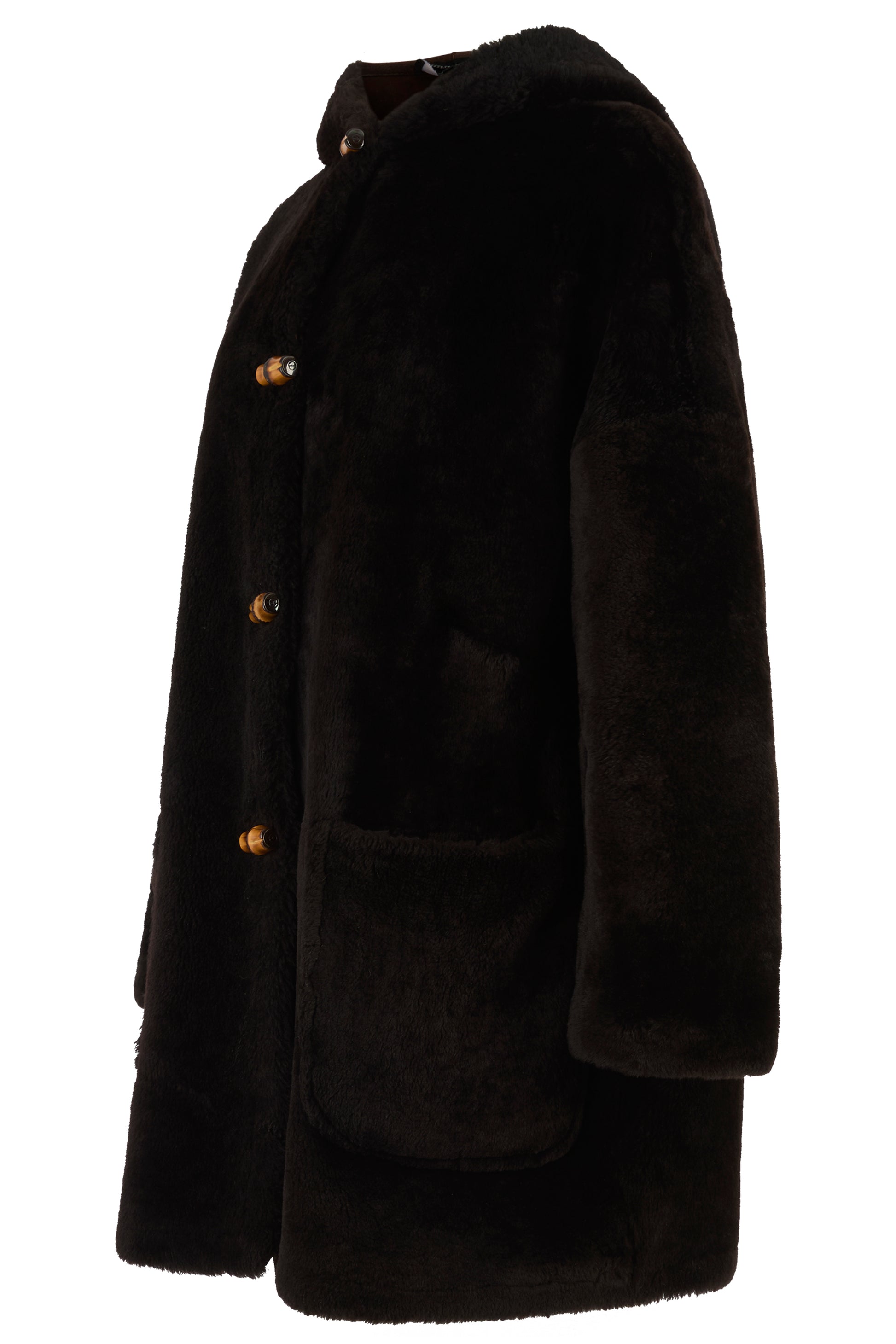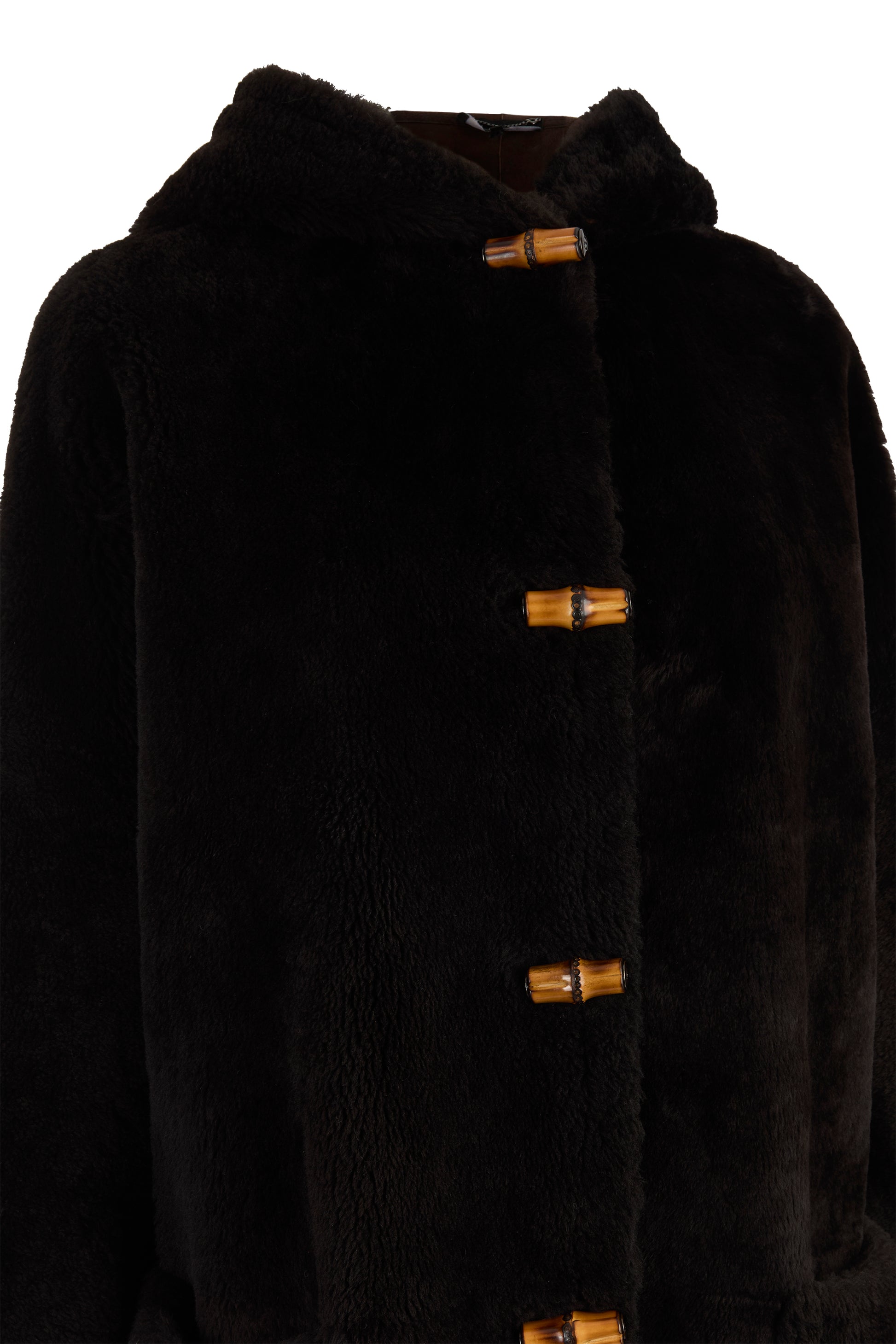 Vintage Gucci by Tom Ford 1996 mid-cut length shearling coat. Designed with a relaxed fit and generously sized patch pockets. Hooded silhouette finished with authentic bamboo toggle closures.