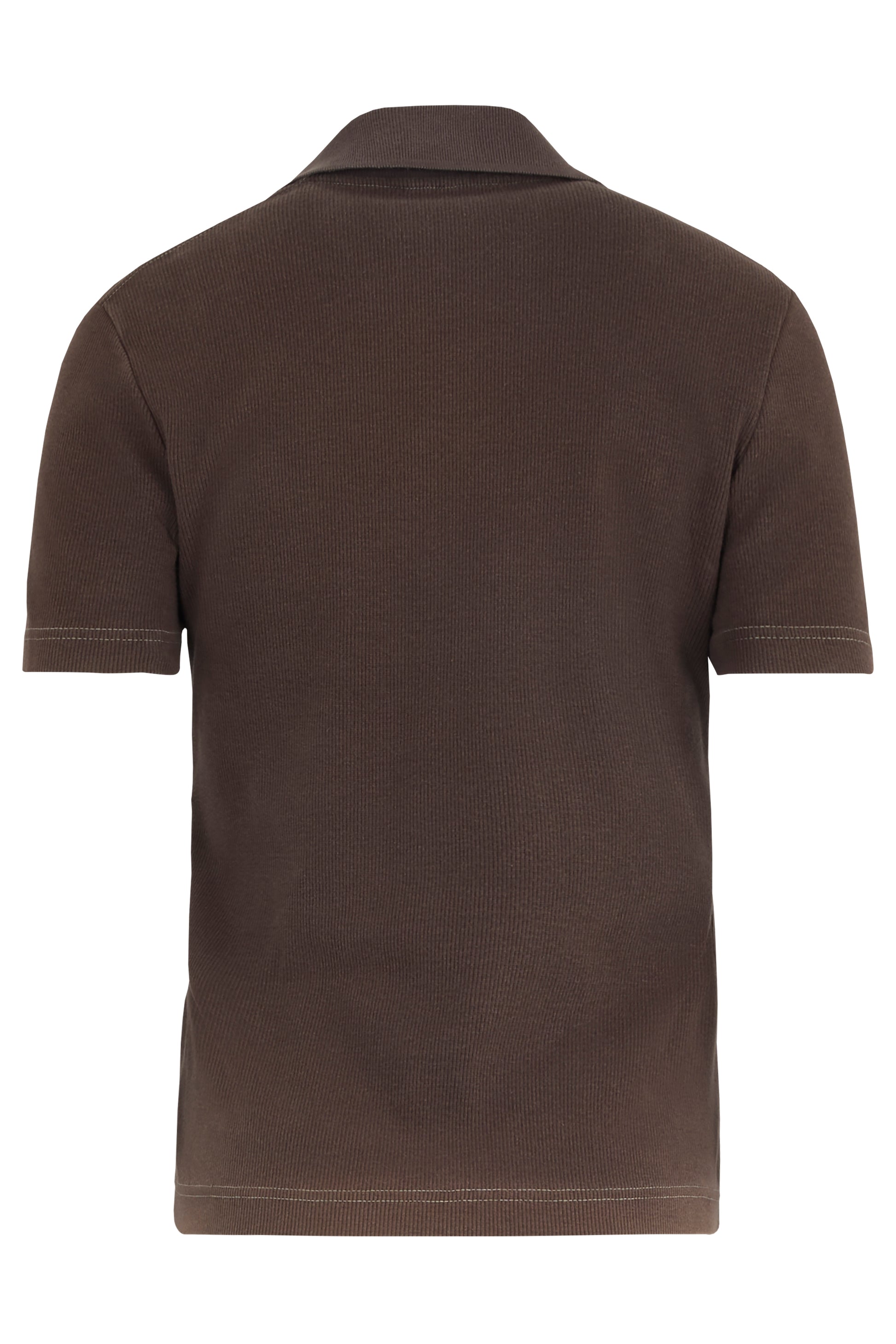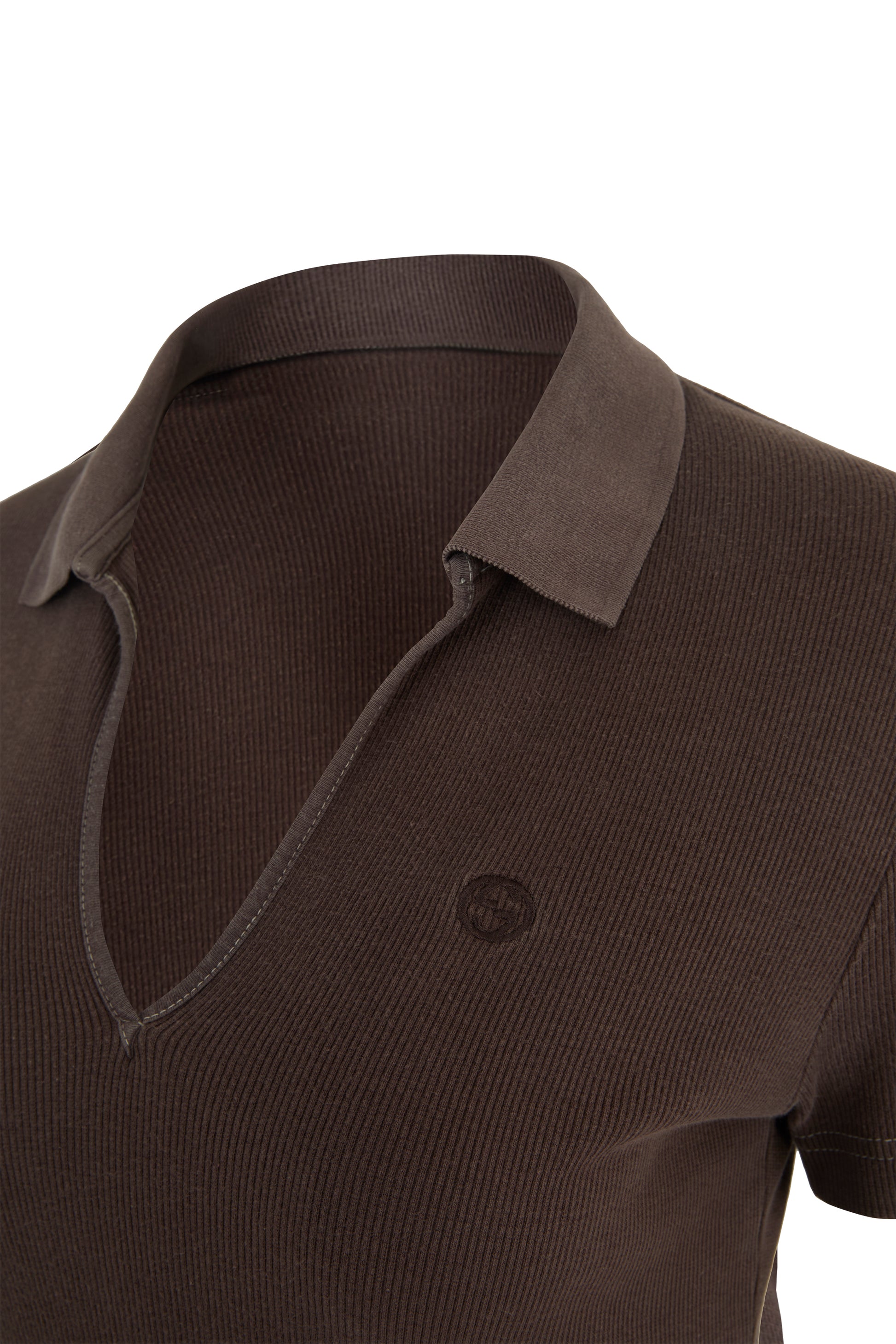 Vintage 1997 Gucci brown polo top . Features a soft ribbed cotton in a deep chocolate brown tone. Open V-neckline and a structured collar, subtle contrast stitching and an embroidered interlocking G logo at the chest.