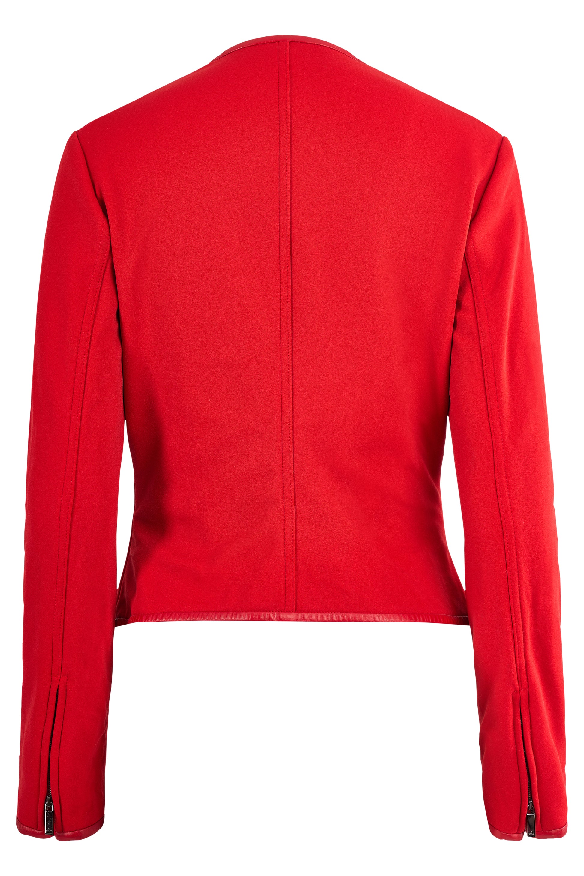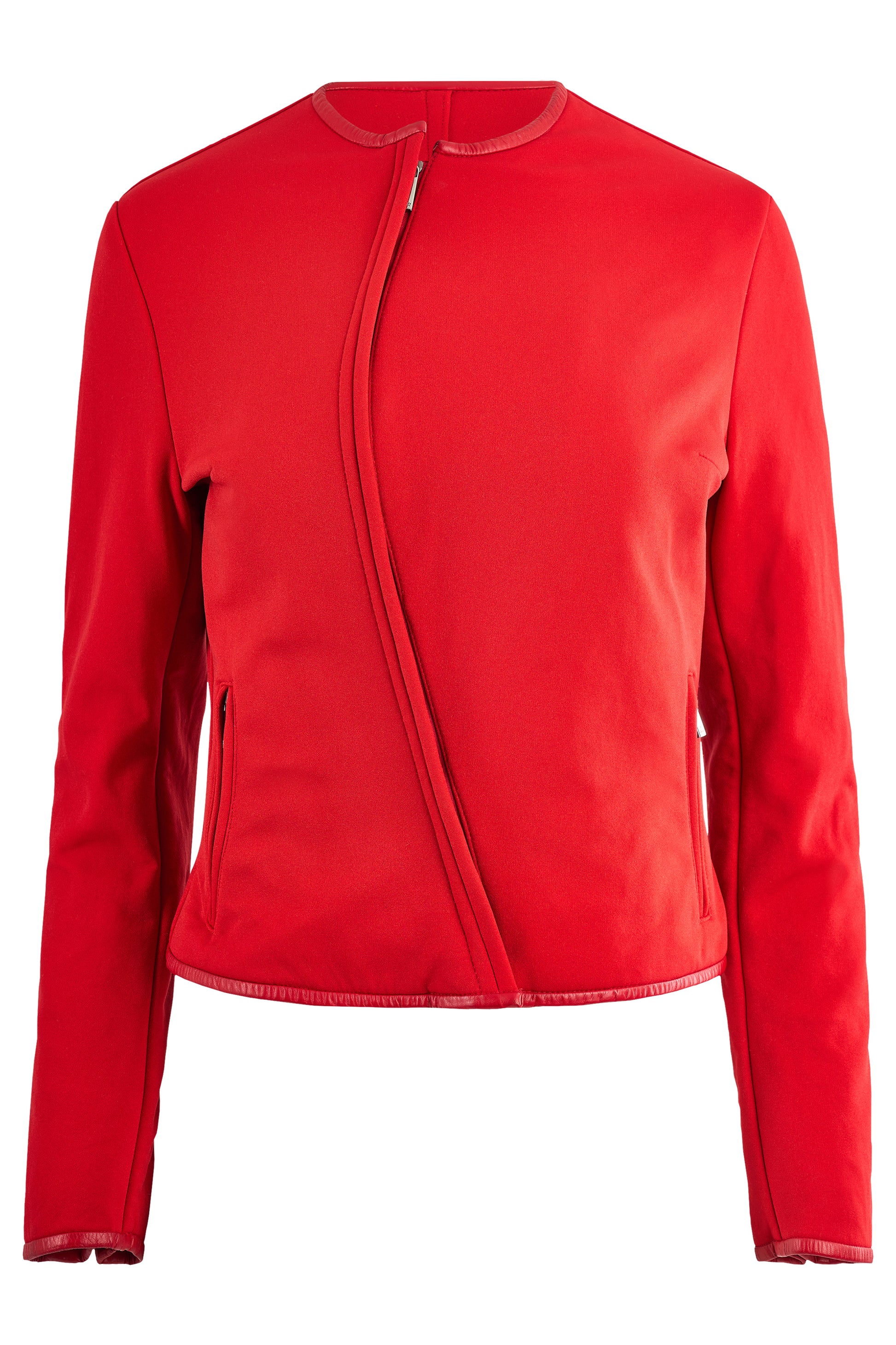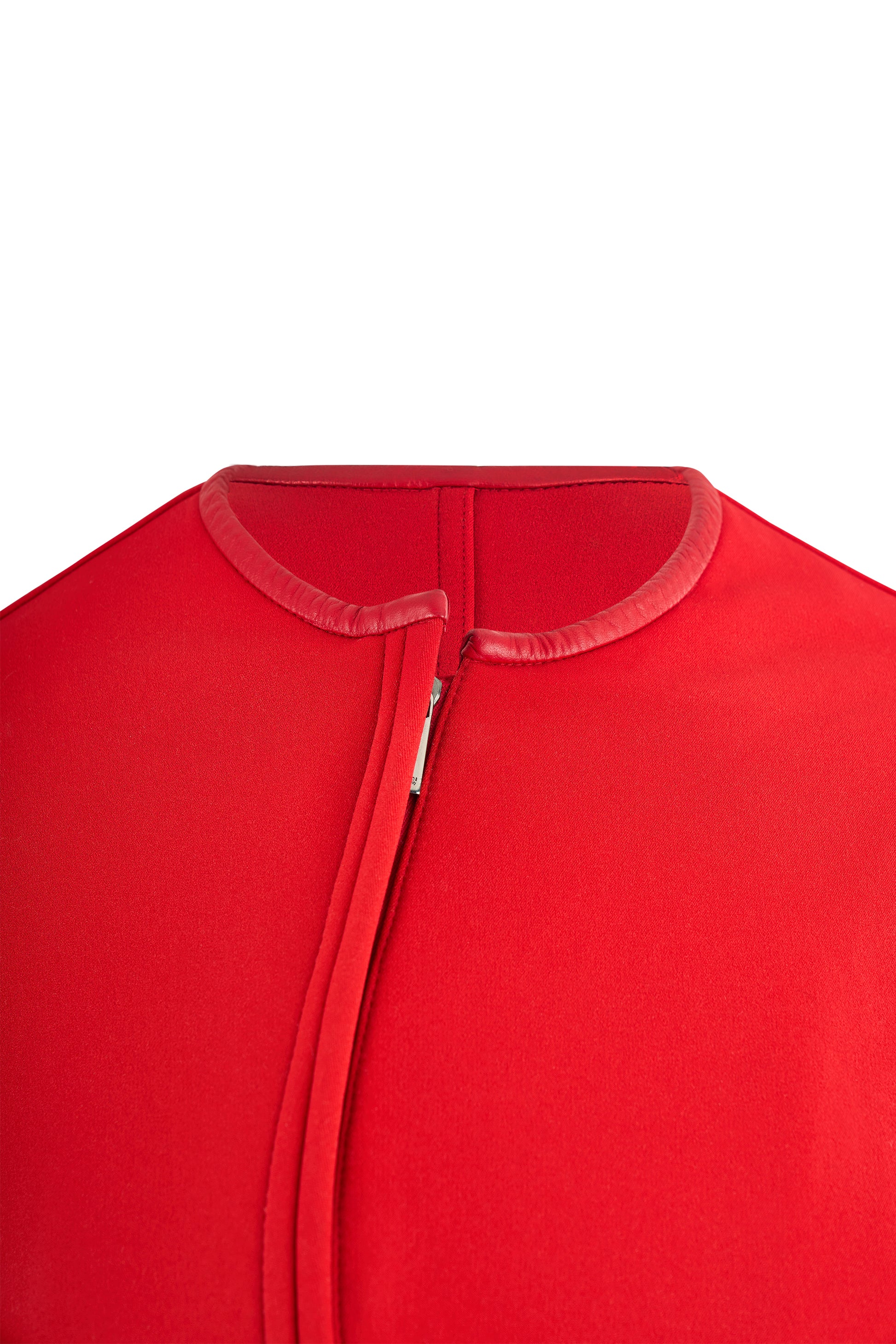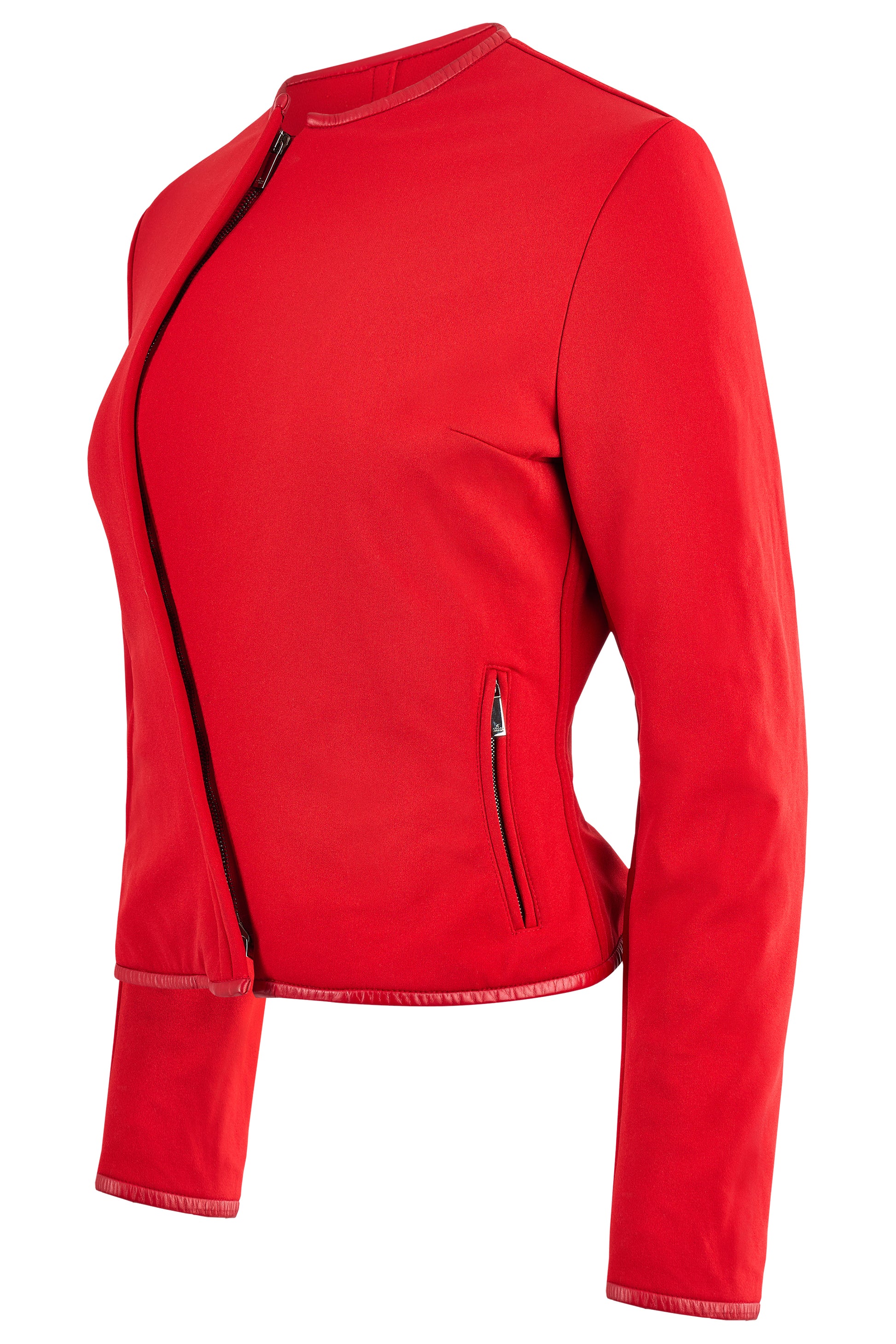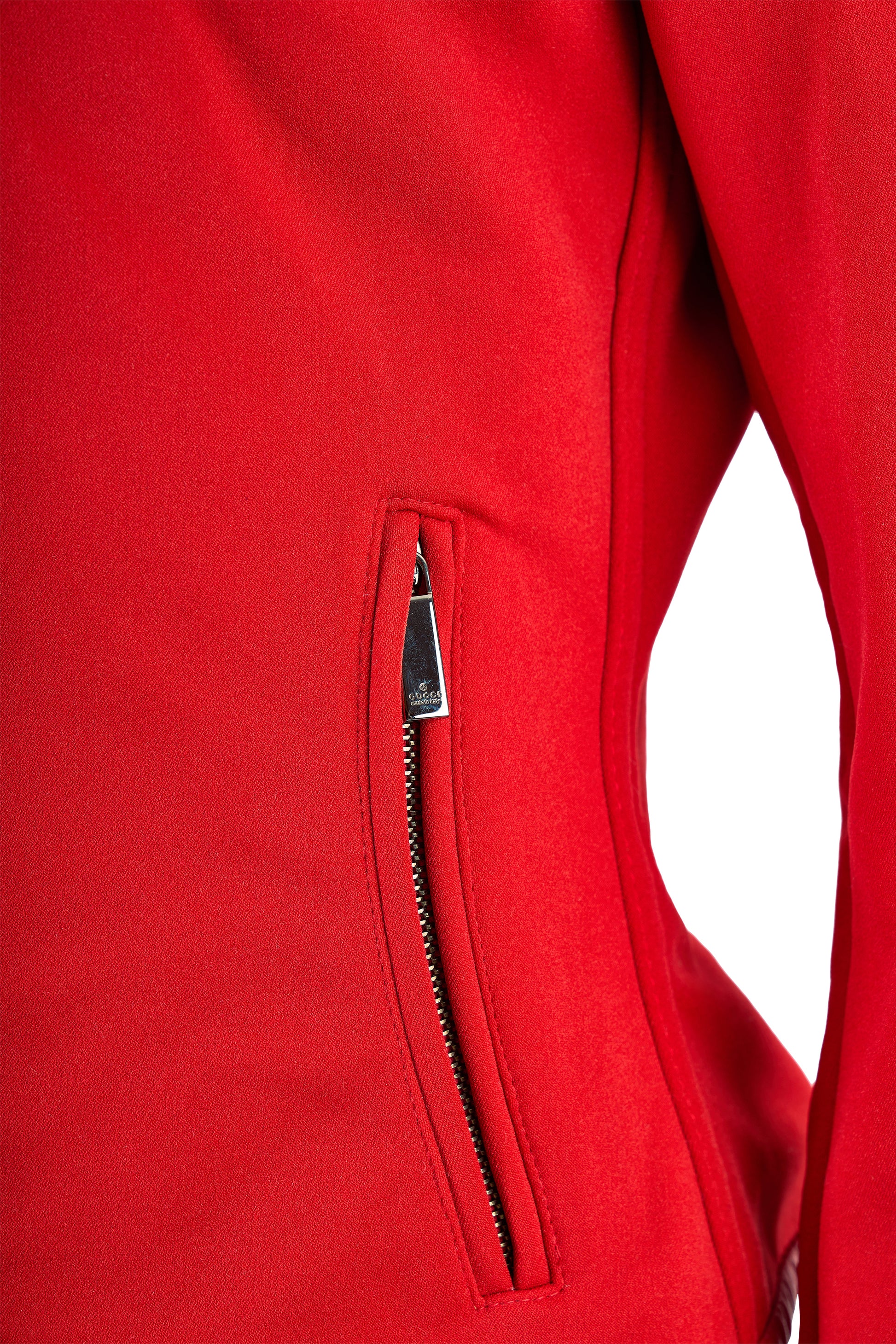 Gucci by Tom Ford Autumn/Winter 199 collection , Features a red wool fabric Cut in a sharp and tailored silhouette, asymmetrical front double zip closure, structure and a futuristic edge. Two side zip pockets, subtle leather piping details along the neckline, cuffs, and hem. In excellent vintage condition.