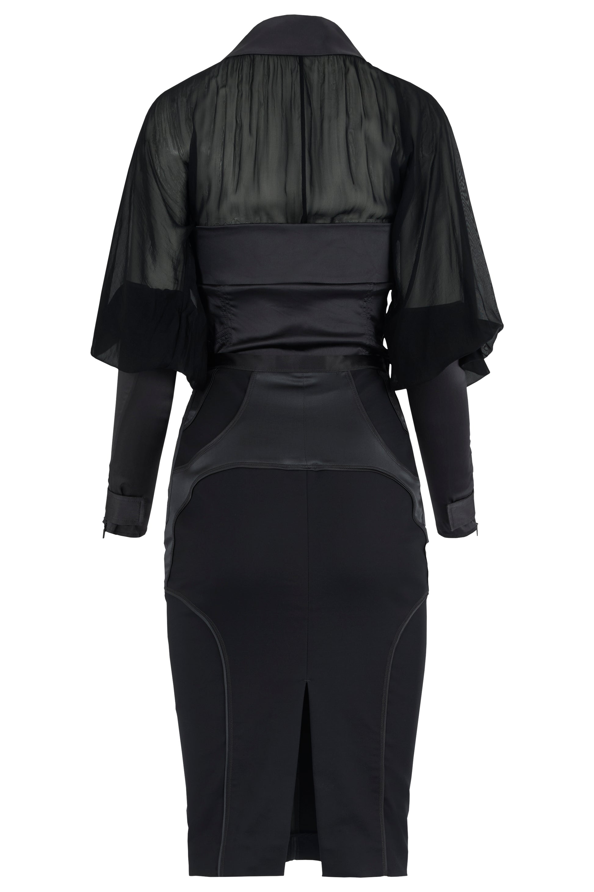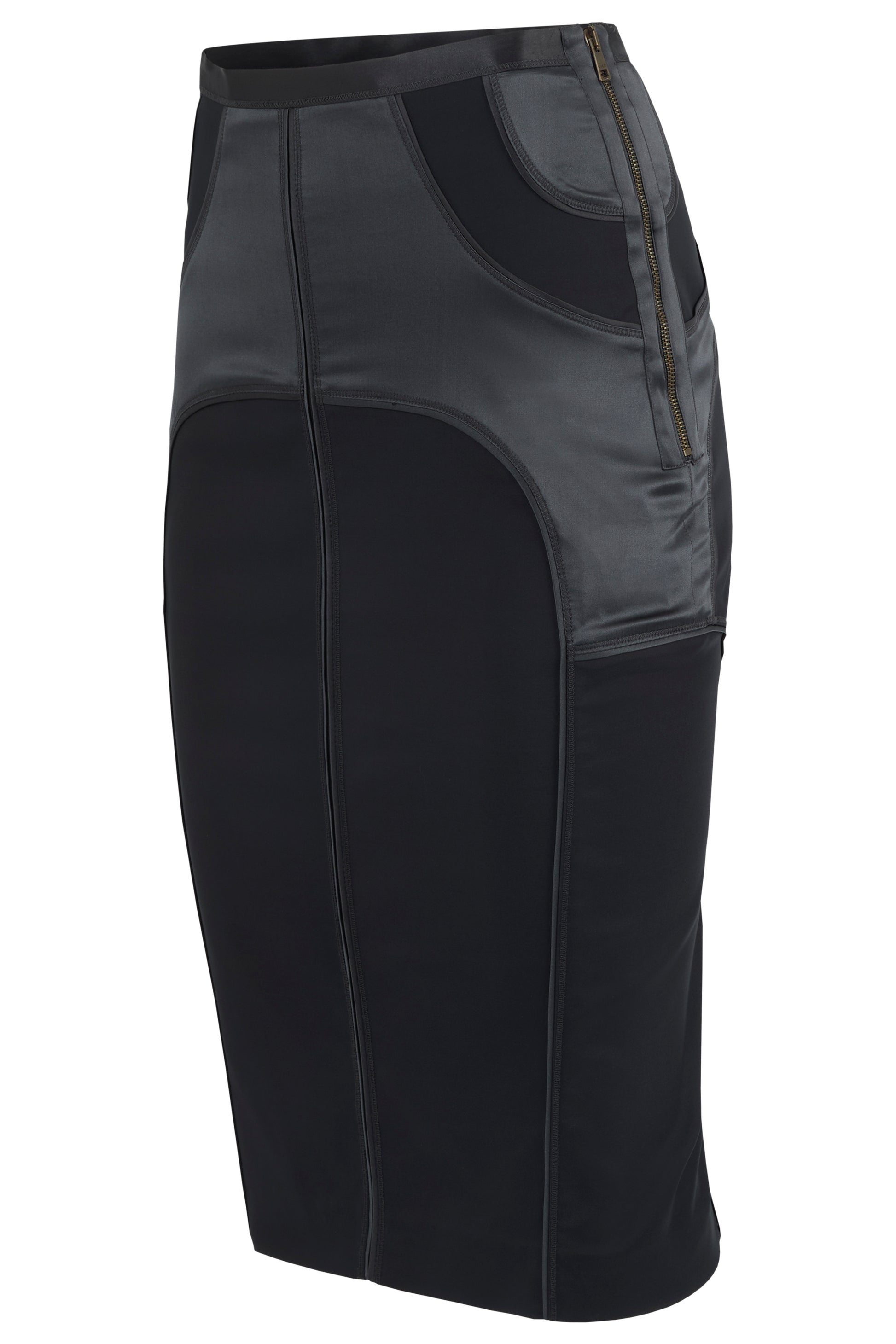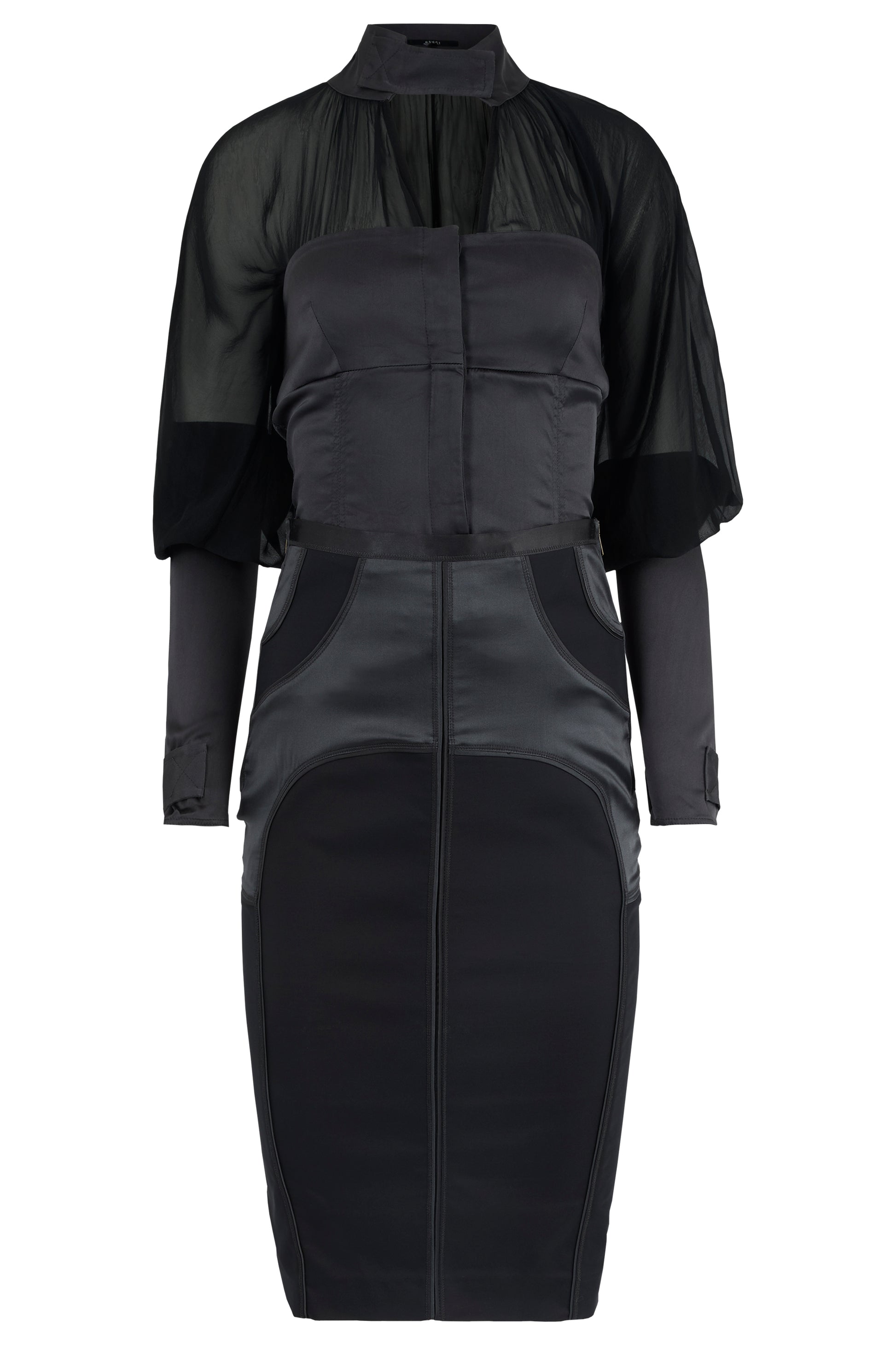 Vintage Gucci F/W 2003 By Tom Ford satin silk grey Co-ord set skirt. Feature a grey silk satin tone, deep plunging neckline with a keyhole cut-out under a structured collar. Long sleeves and waist with a small peplum panel fit, skirt is mid length and fastens with two  side zips .