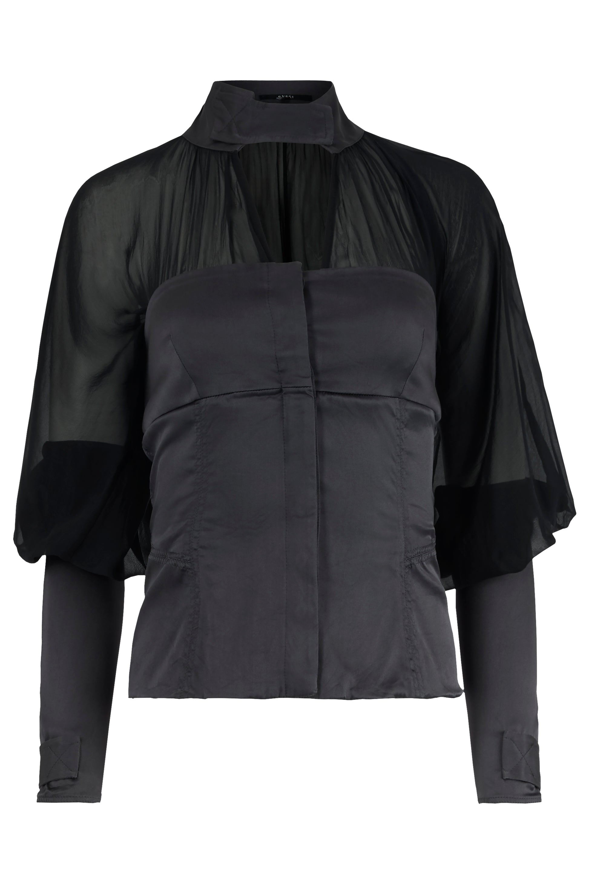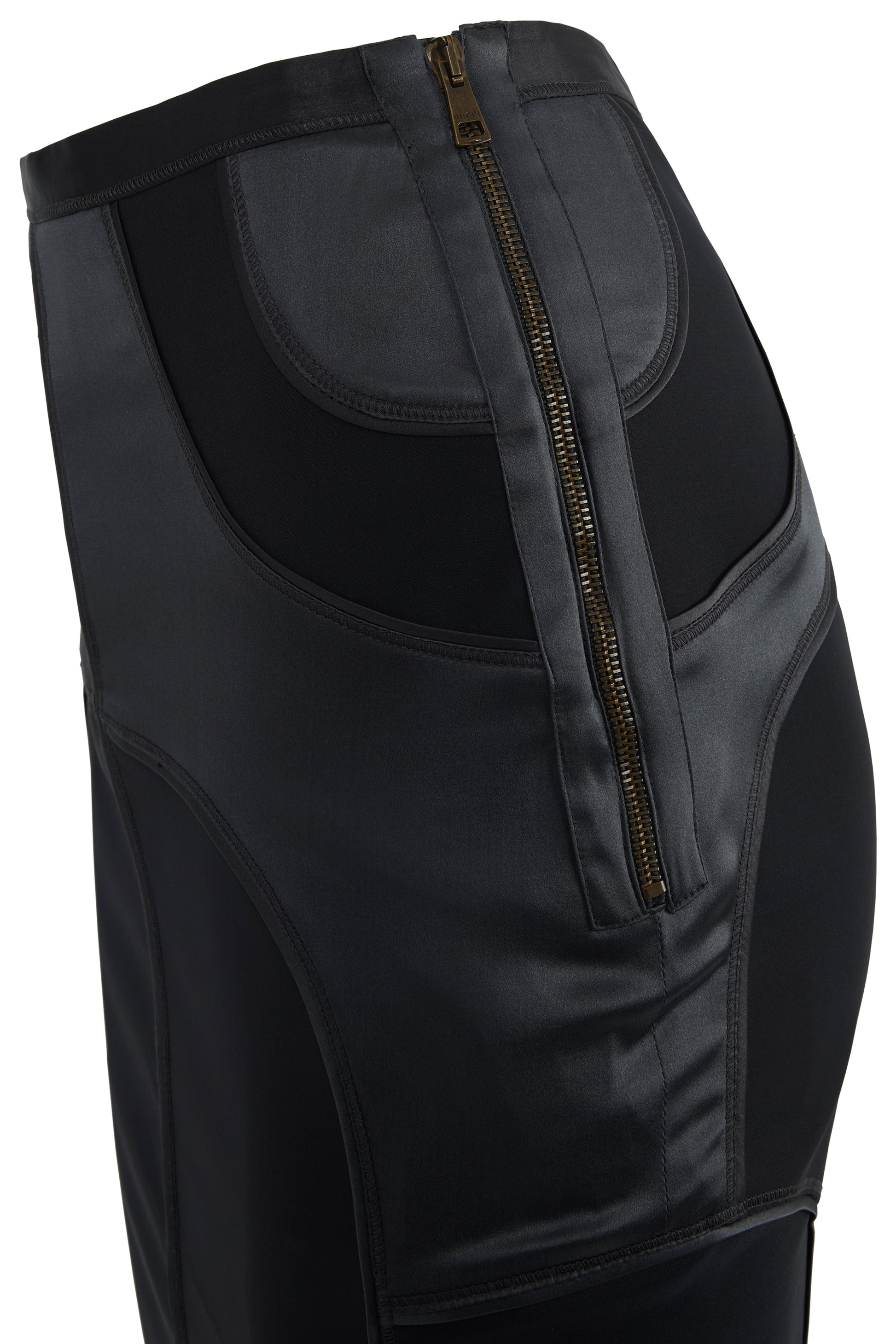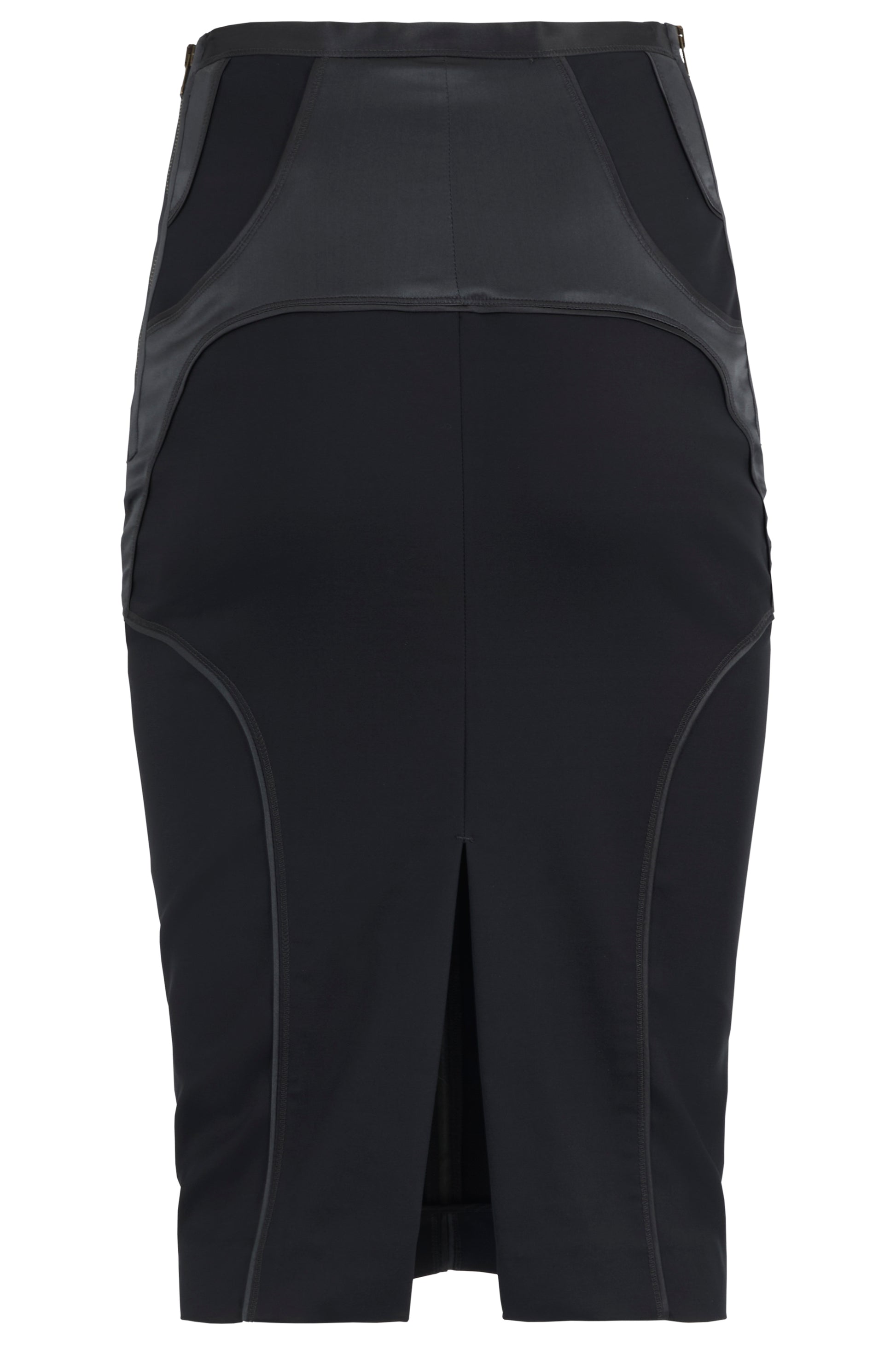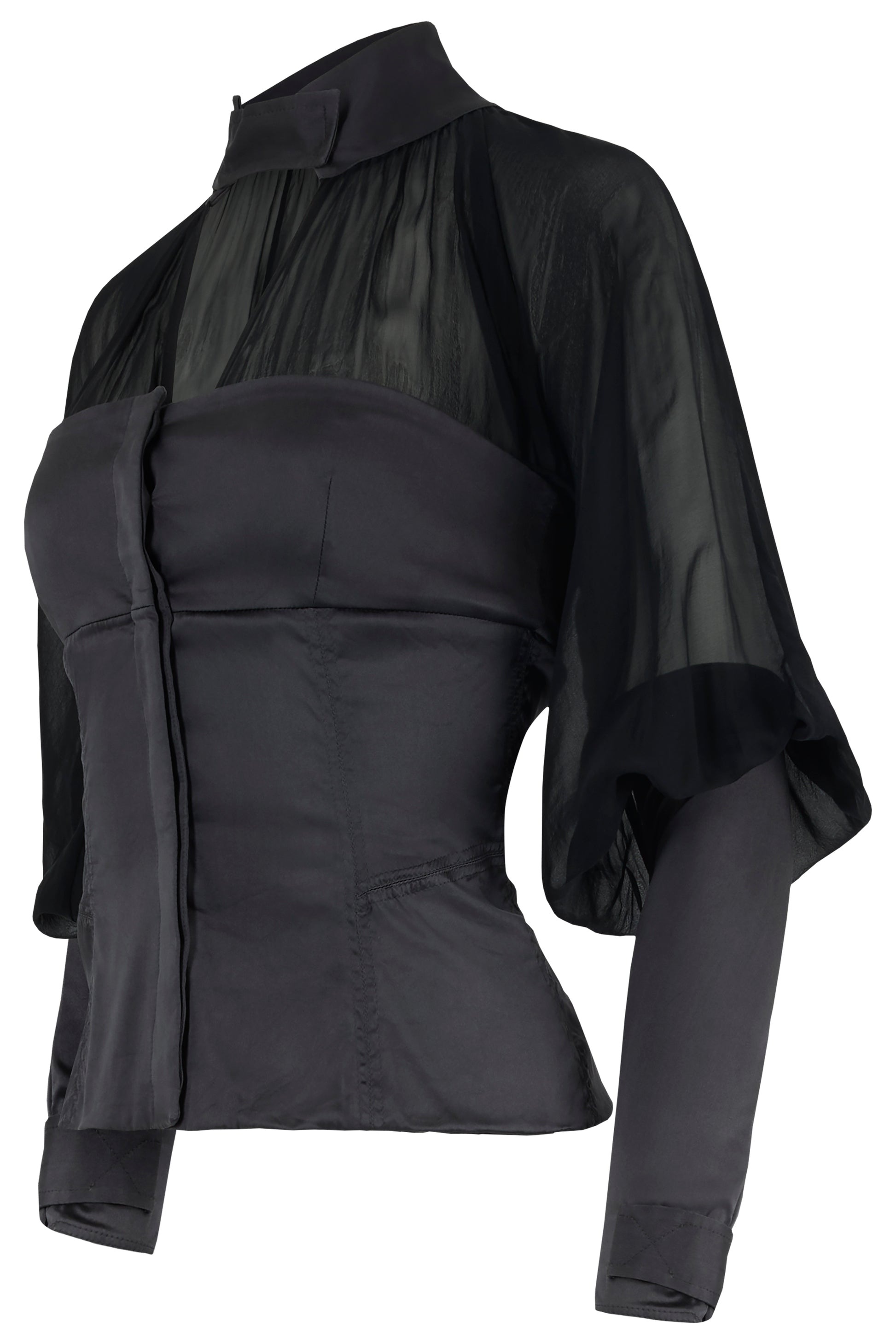 Vintage Gucci F/W 2003 By Tom Ford satin silk grey Co-ord set skirt. Feature a grey silk satin tone, deep plunging neckline with a keyhole cut-out under a structured collar. Long sleeves and waist with a small peplum panel fit, skirt is mid length and fastens with two  side zips .