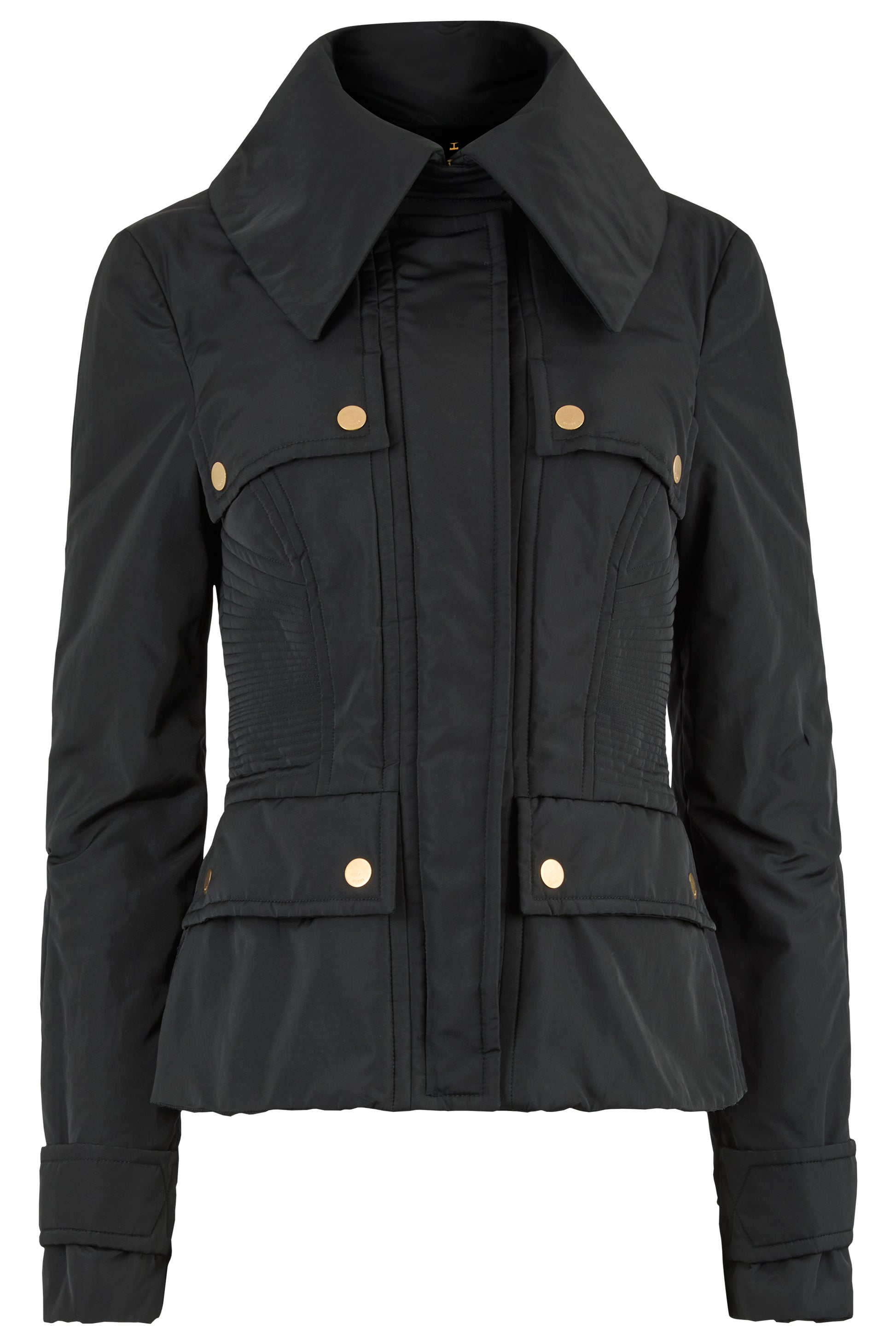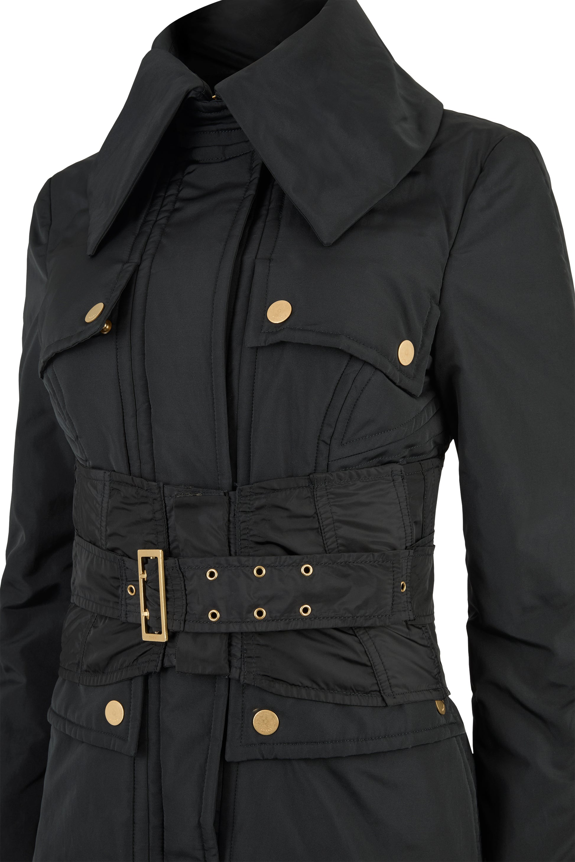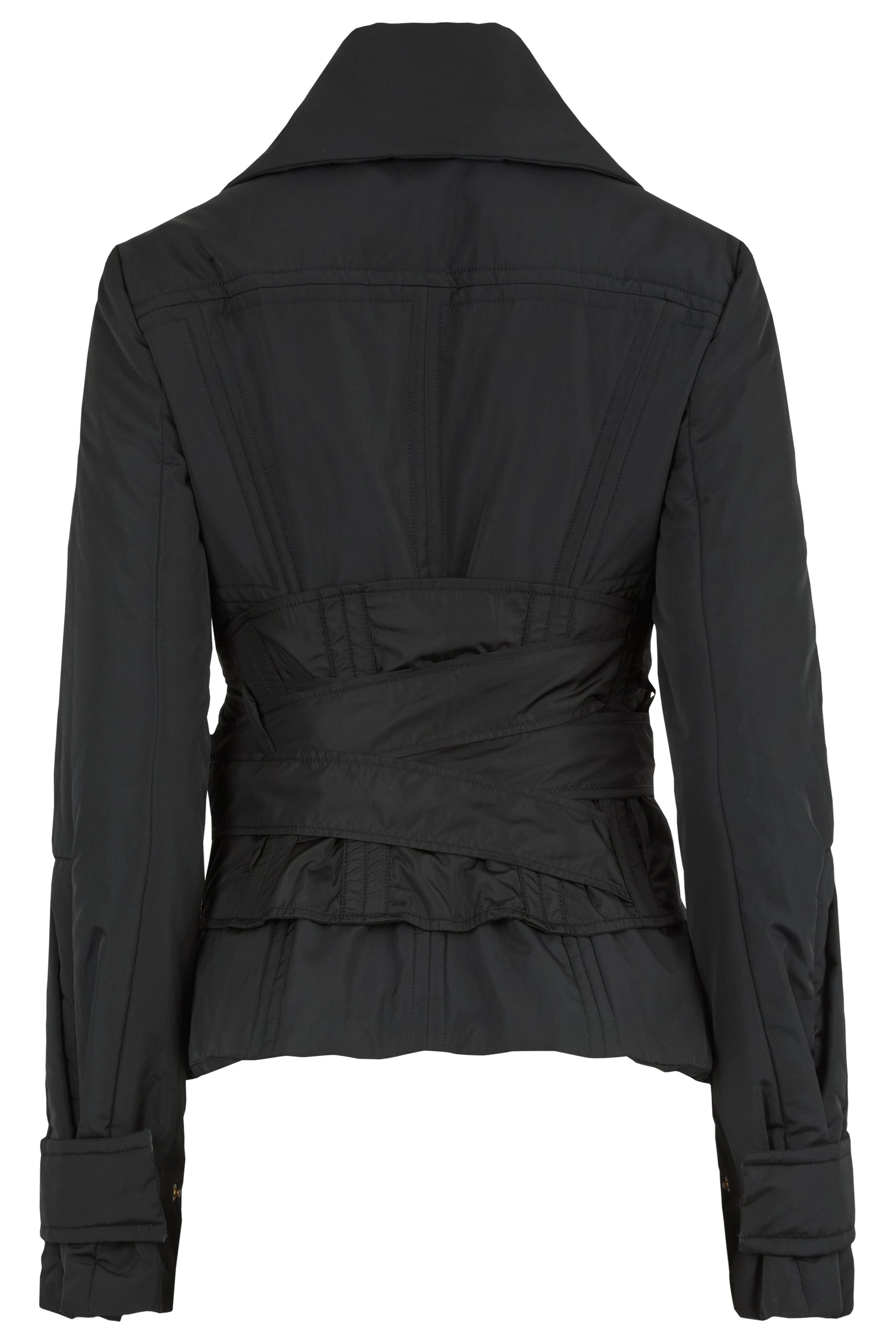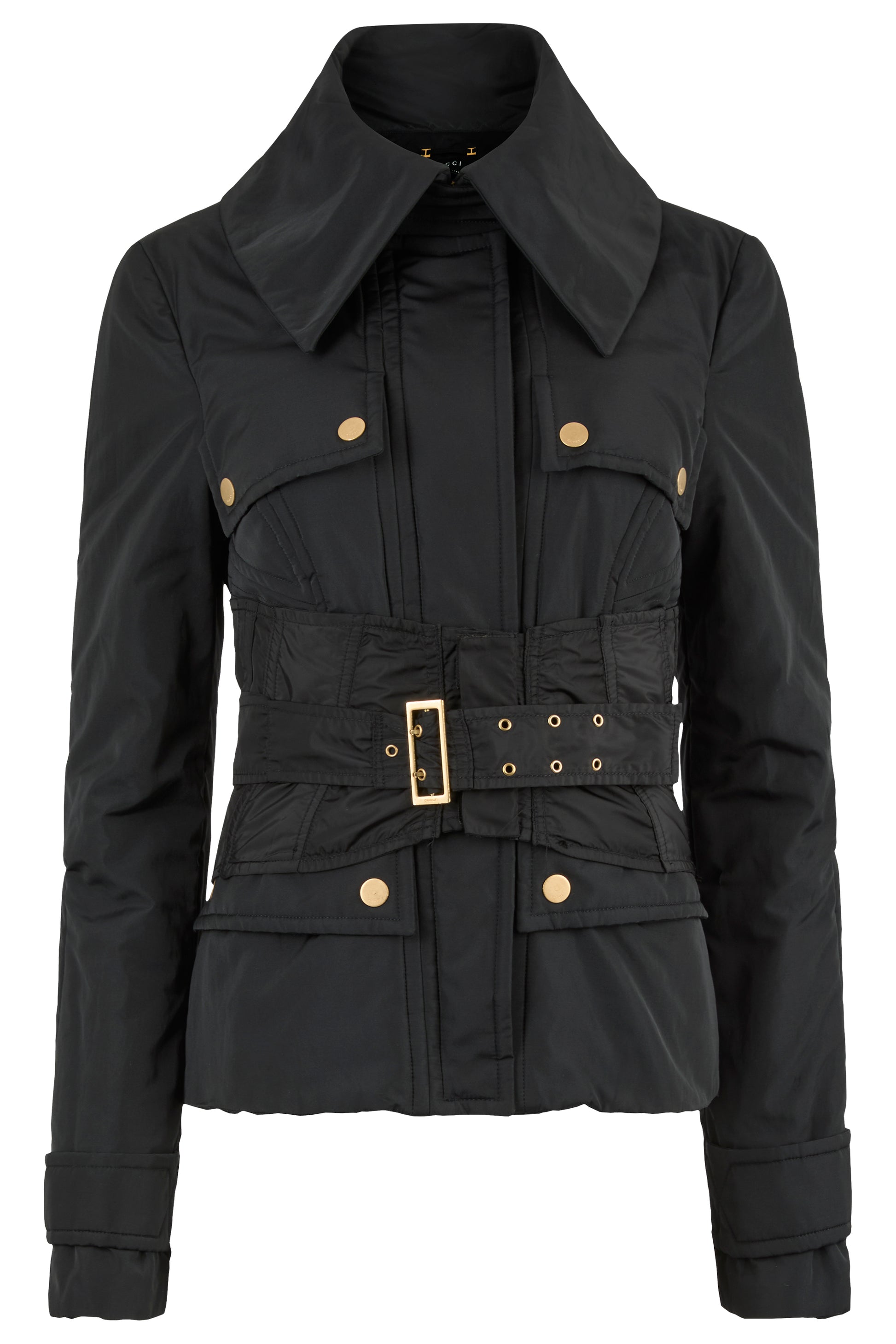 Vintage Gucci Fall winter 2003 black corseted jacket. Crafted from a sleek technical fabric, the design features a sharp silhouette with exaggerated lapels, sculpted seams, and statement gold tone hardware. The detachable corset belt cinches the waist, four flap front pockets and fastens with a hidden double zip closure .