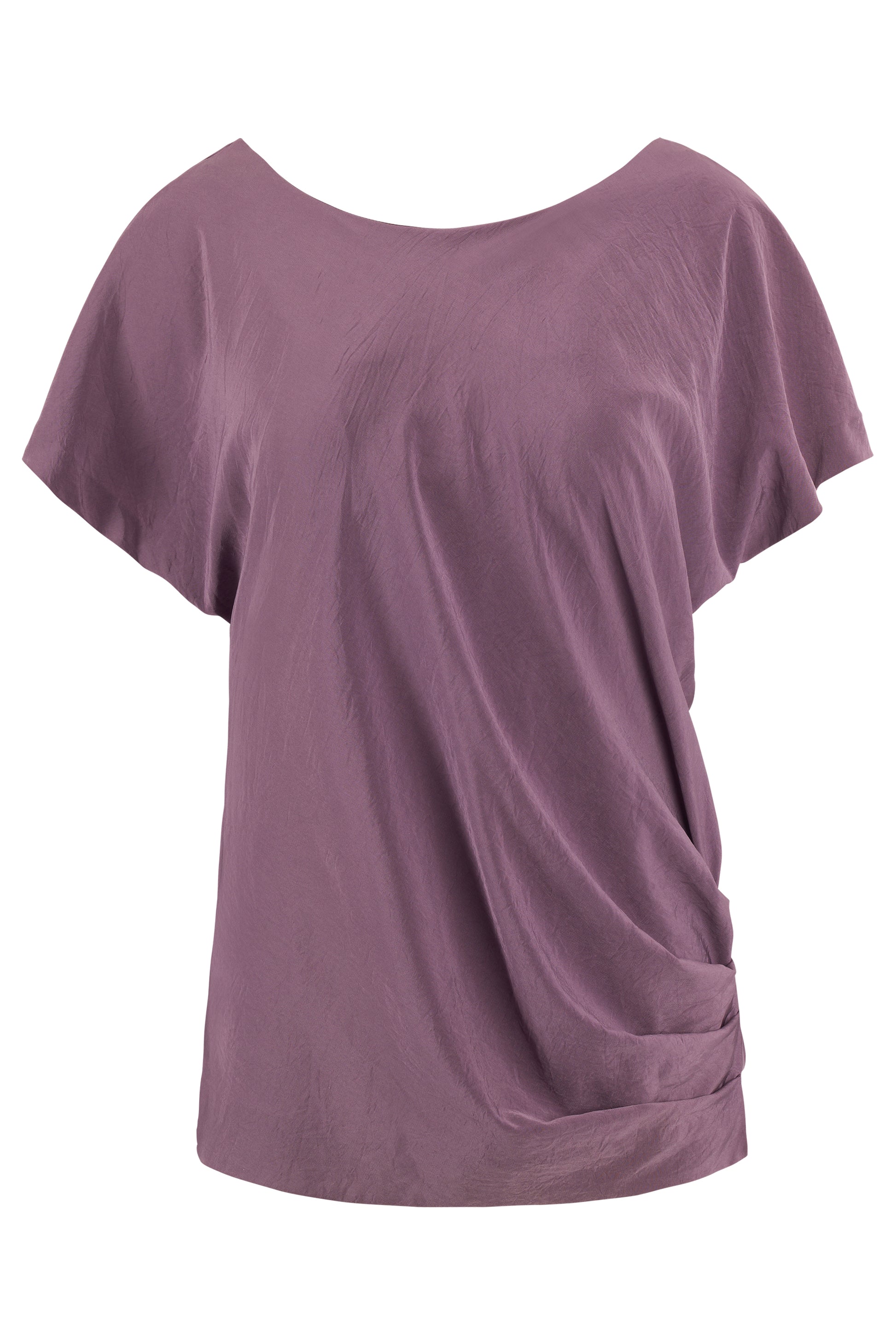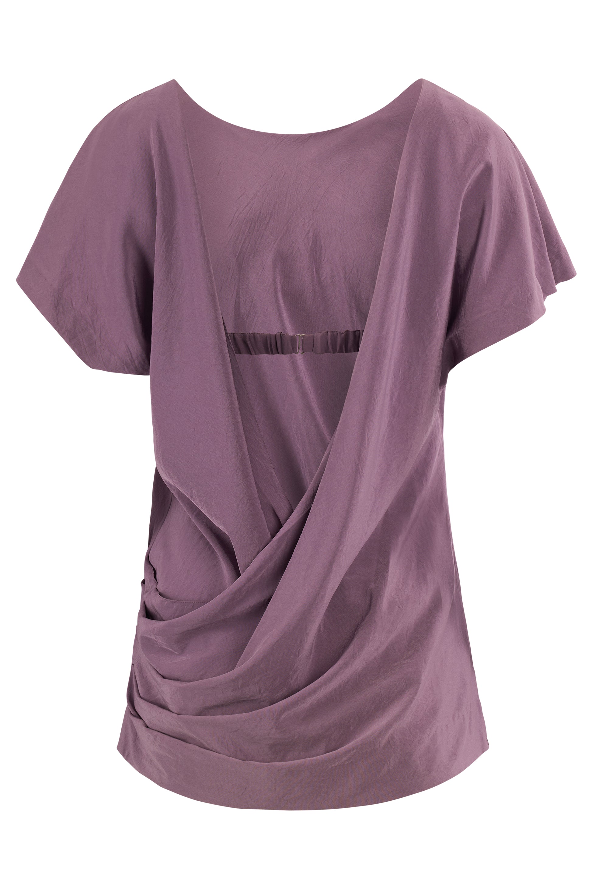 Elizabeth and James purple silk parachute dress from 2000's. Features a minimalist silhouette, a mauve silk fabric. Relaxed round neckline, fluid short sleeves, and an asymmetric draped detail at the side and open back. Fastens with a hook at the back of the neck. In excellent vintage condition.