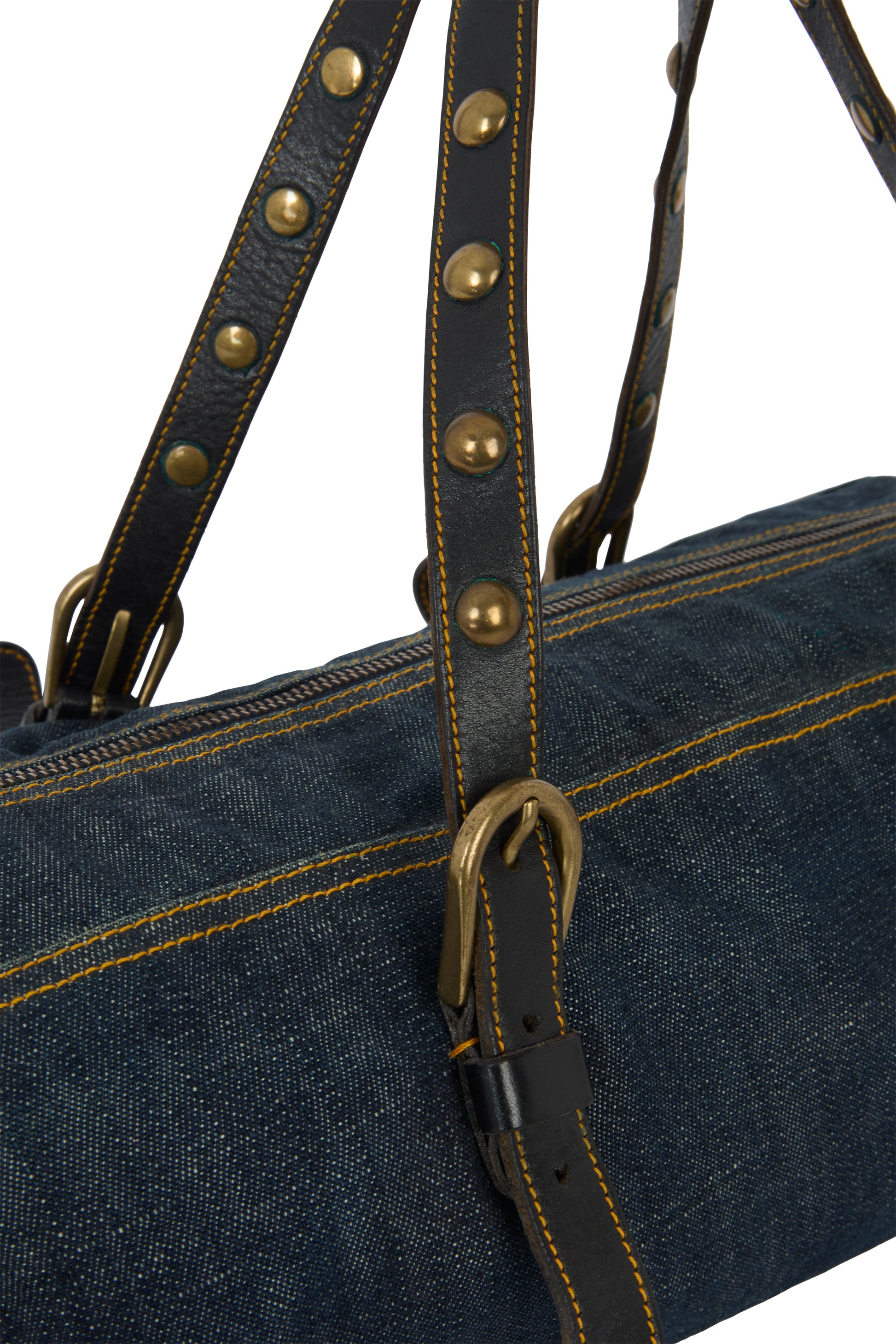 Vintage Miu Miu 2000's denim bowling bag. crafted in structured blue denim. The elongated shape is balanced by contrasting adjustable leather handles , punctuated with stud detailing and finished with antique gold-tone buckles. Large main compartment with inside zip pocket. Fastens with a top zip closure .
