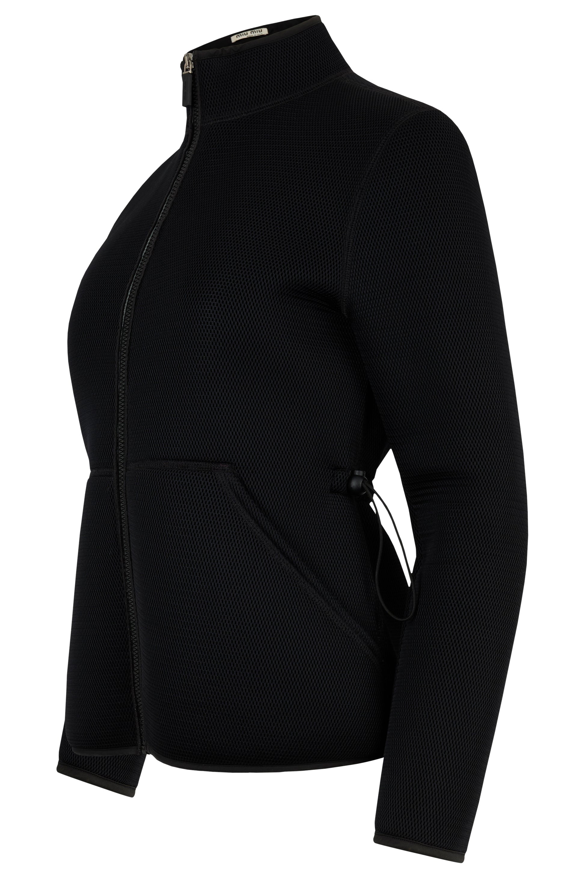 Vintage Miu Miu F/W 1999 black neoprene jacket., Features a black technical neoprene fabric ,sculpted and futuristic silhouette, high neck and adjustable side ties to cinch the waist. Two side pockets, polyester lining and Fastens with a front zip closure.