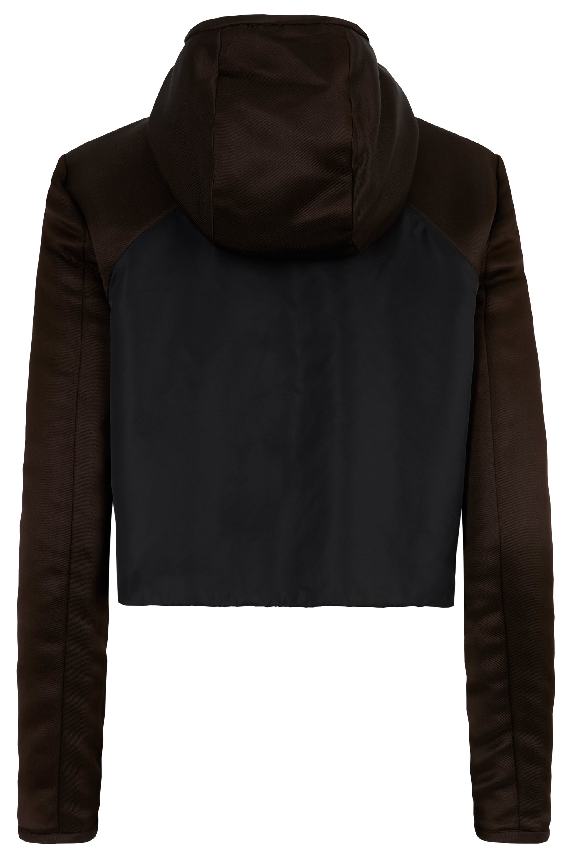 From Miu Miu F/W 2008 collection, this hooded bicolour jacket is crafted in a rich contrast of dark brown and black technical fabric, the piece features a fitted silhouette with a cropped cut. Two side zip pockets and fastens with a front double zip closure.