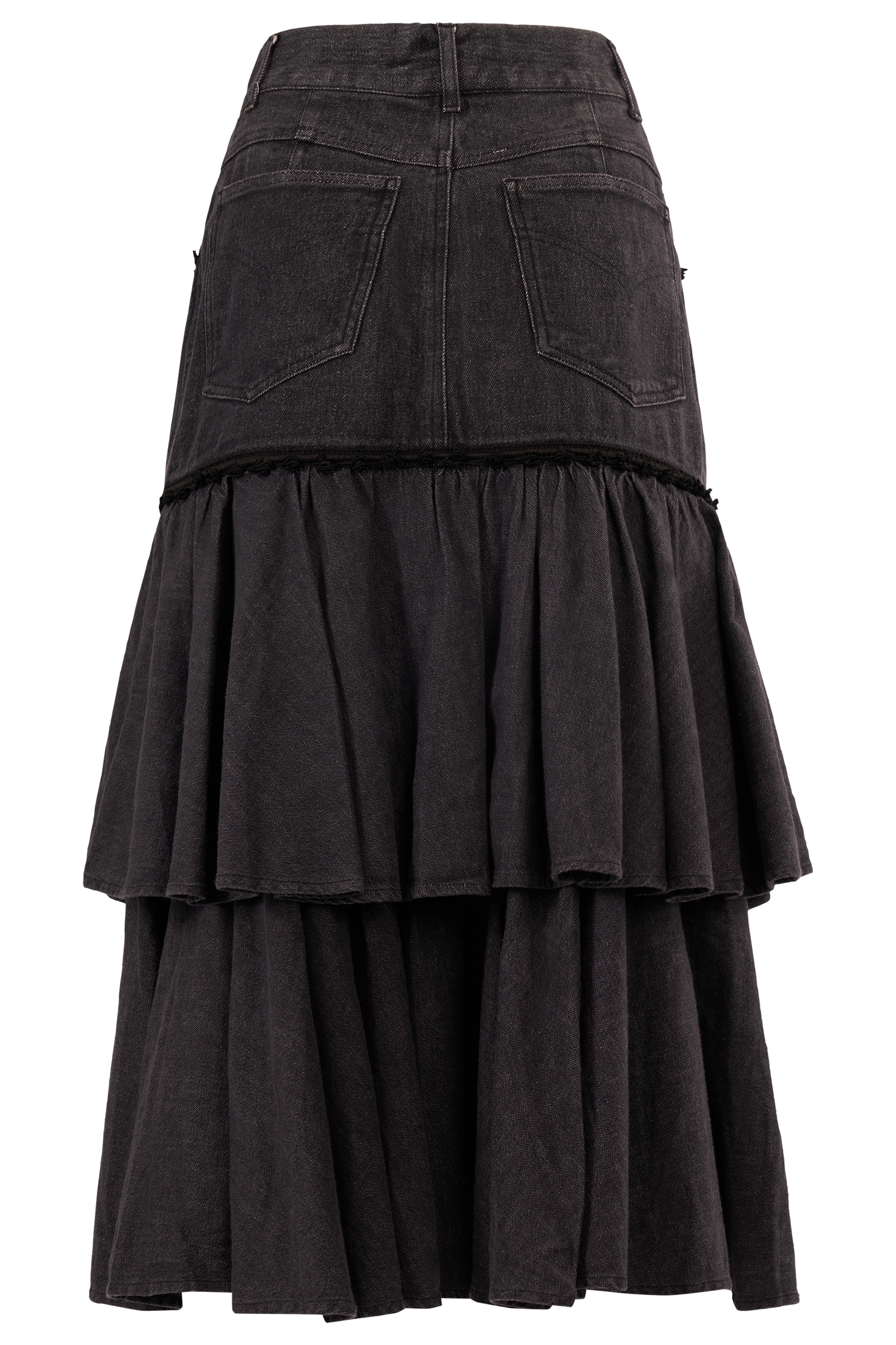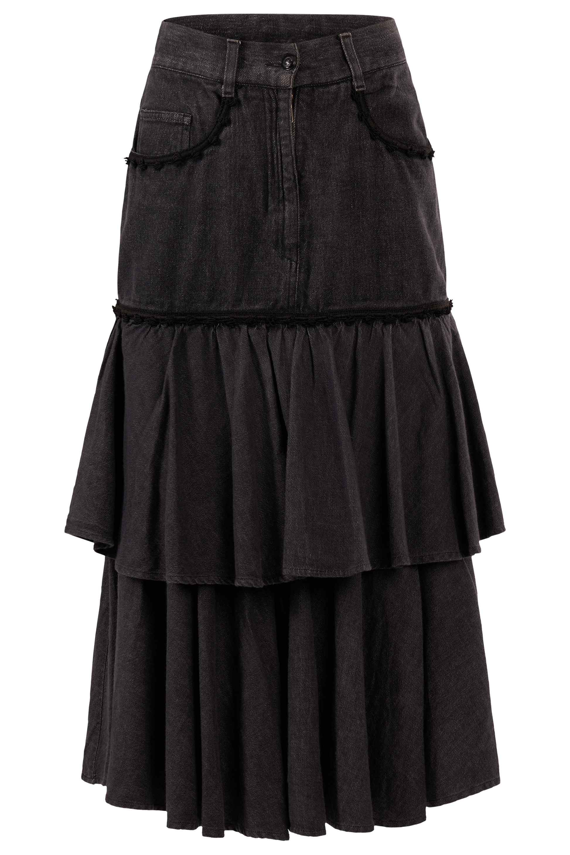 Vintage 2000's Moschino dark grey denim maxi skirt . Features a washed dark grey denim fabric structured waistband with belt loops, front button closure, and functional pockets. Black embroidery details on the pockets and the hips. In excellent vintage condition.