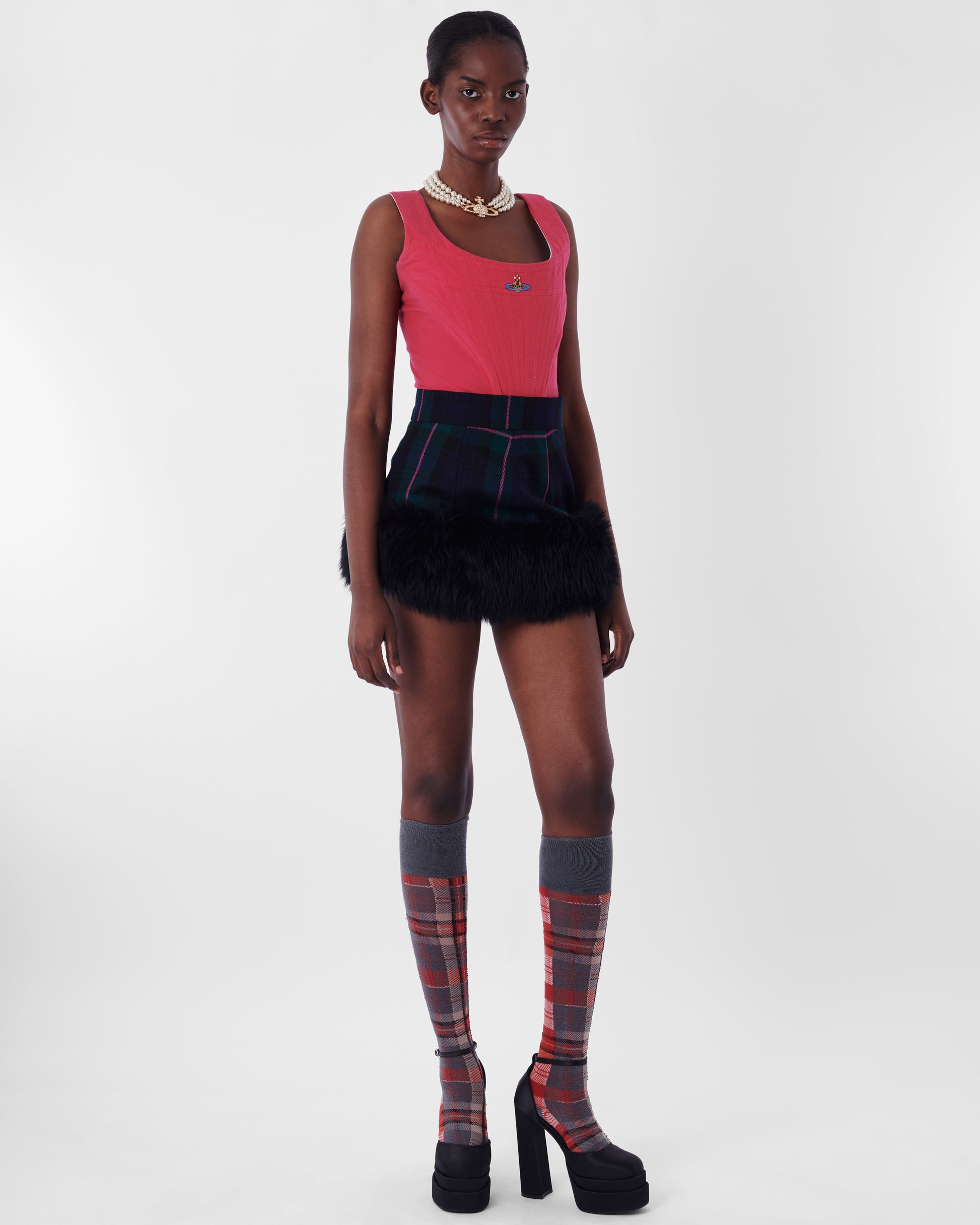Iconic Vivienne Westwood Fall Winter 1994 Pink Gordon Kilt. Features faux fur trim detail, orb engraved button, invisible zip closure and mini length. In excellent vintage condition.