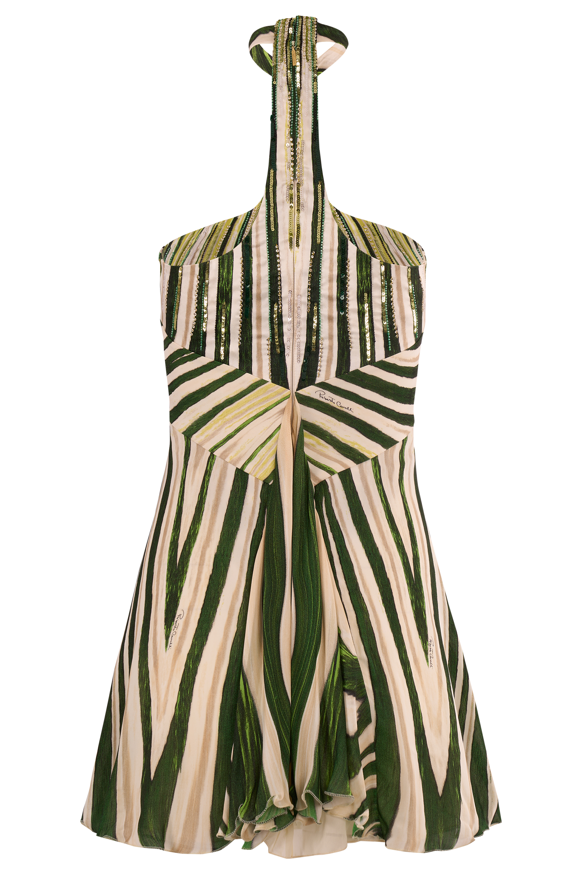 From Roberto Cavalli 2004 collection. Featuring a halter neck silhouette, it is adorned with intricate sequin and bead embellishments, enhancing the striped green, yellow, and ivory print with radiant sparkle. Fastens with a concealed back zip. In excellent vintage condition.