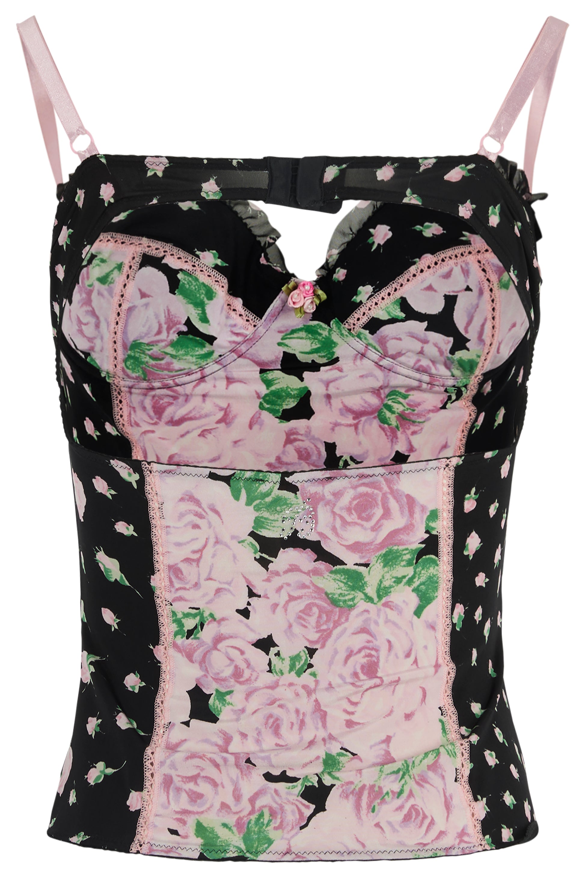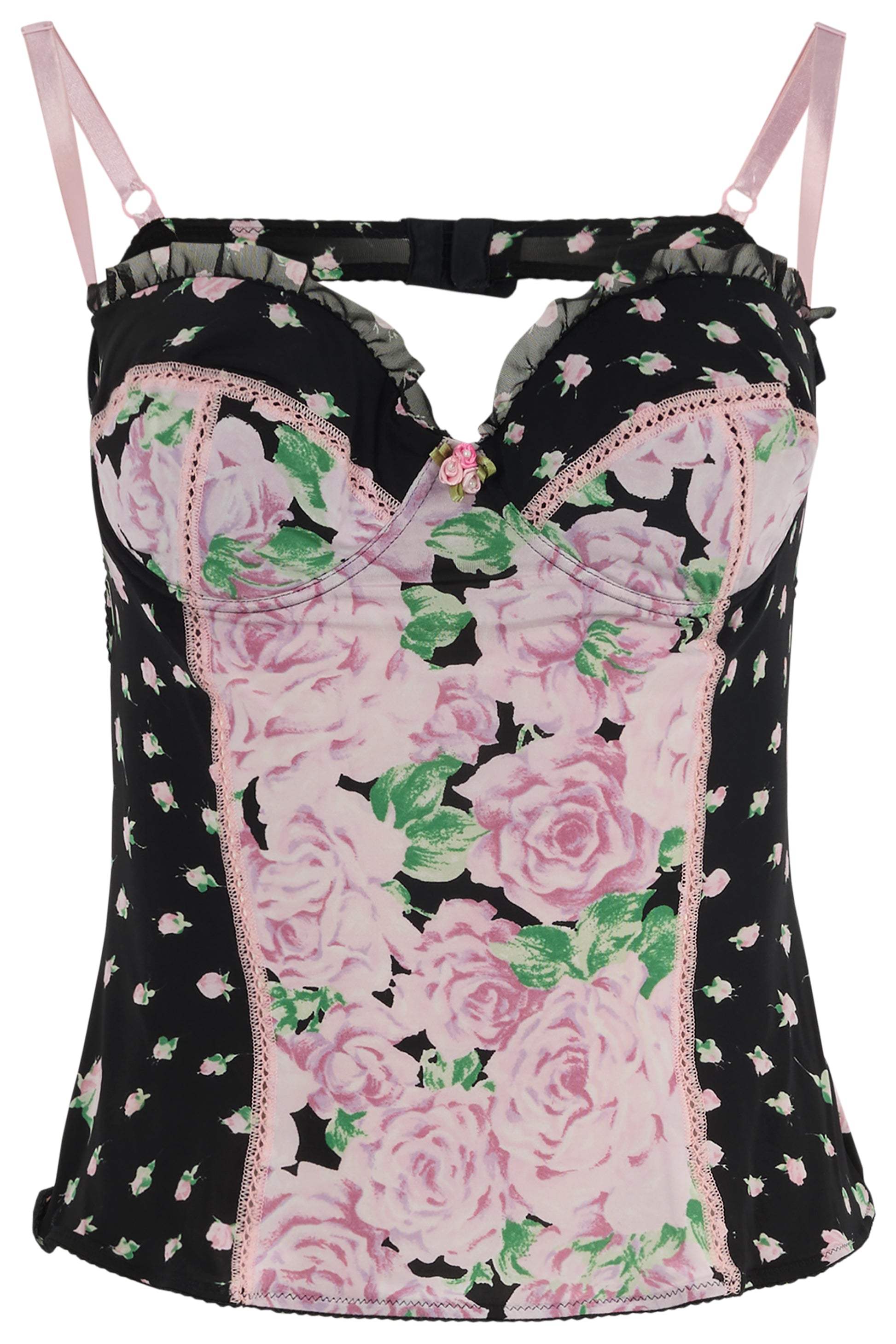 Vintage Blumarine Floral print corset. Featuring baby pink lace details and built-in stretchy bustier with ruffles. Floral details on the bust. Spaghetti adjustable straps. Fastened with hook and eye.