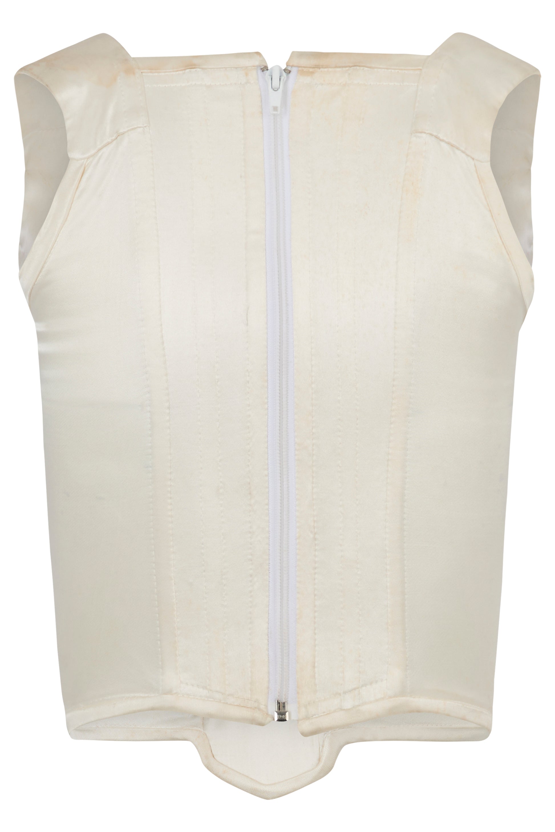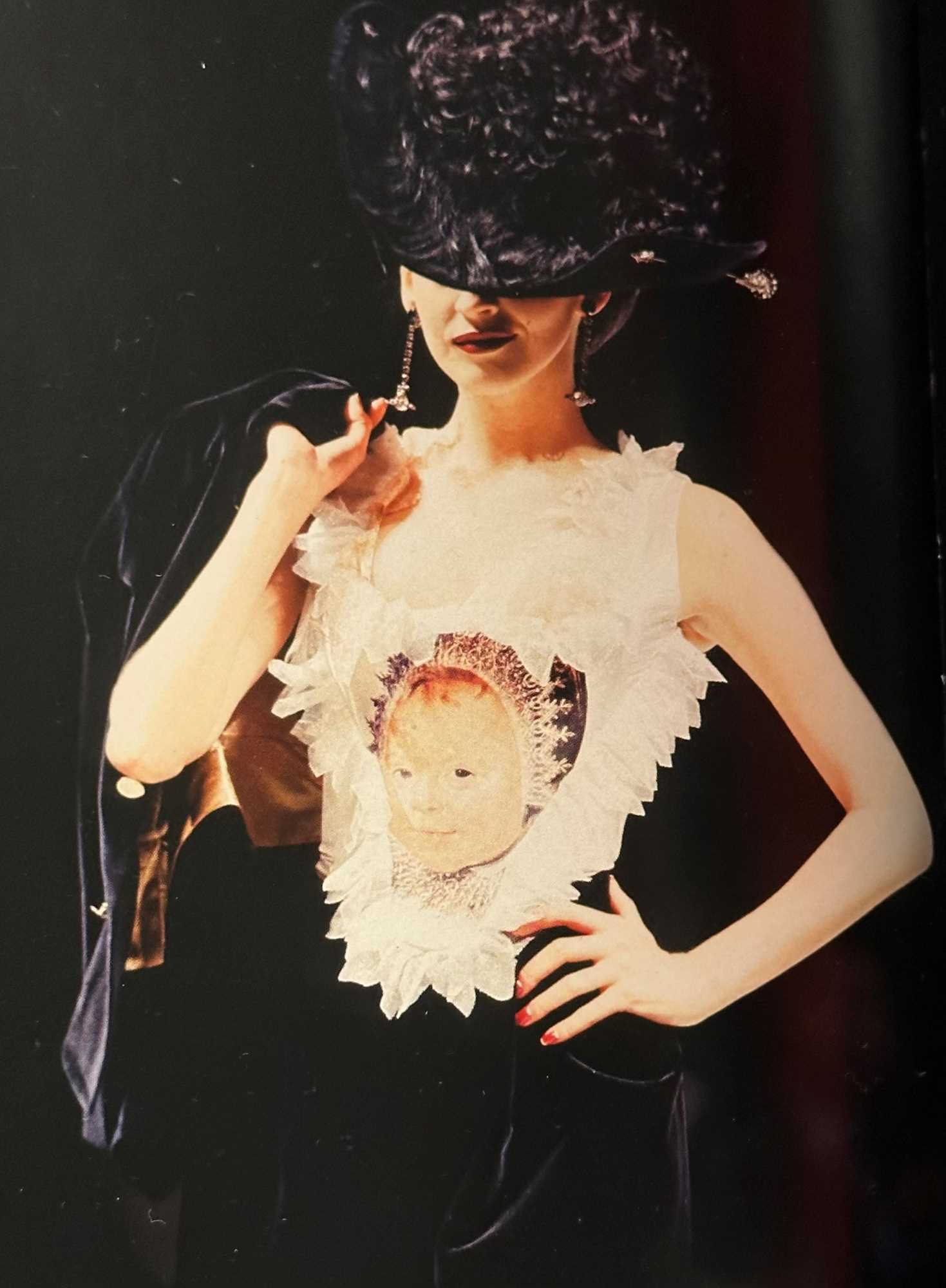 Rare piece from Vivienne Westwood's "Always on Camera" collection from F/W 1992. Features a portrait of a baby on a white viscose and lycra boned corset. Similar details seen on runway and featured in the January 1993 issue of Vogue following the runway.