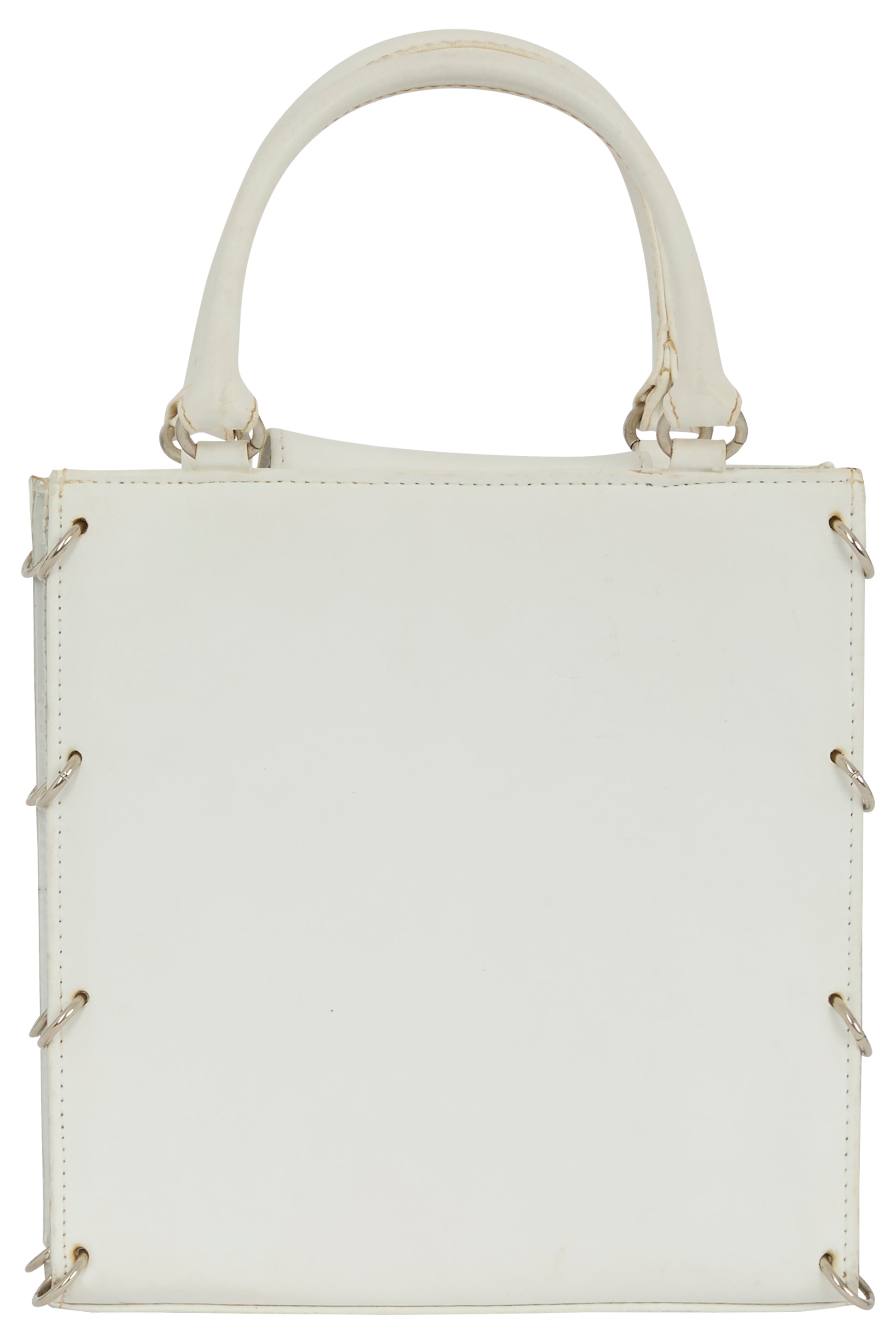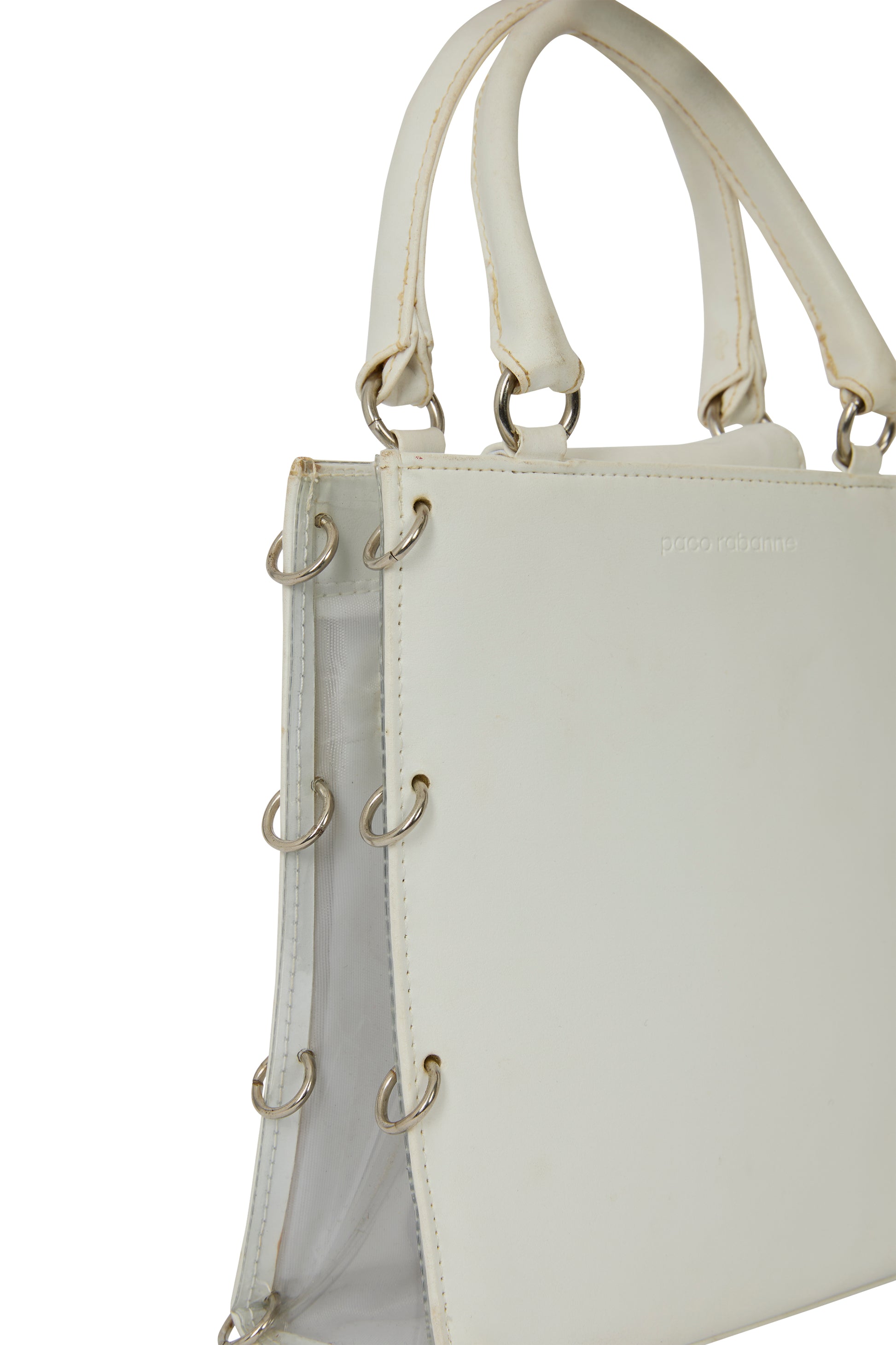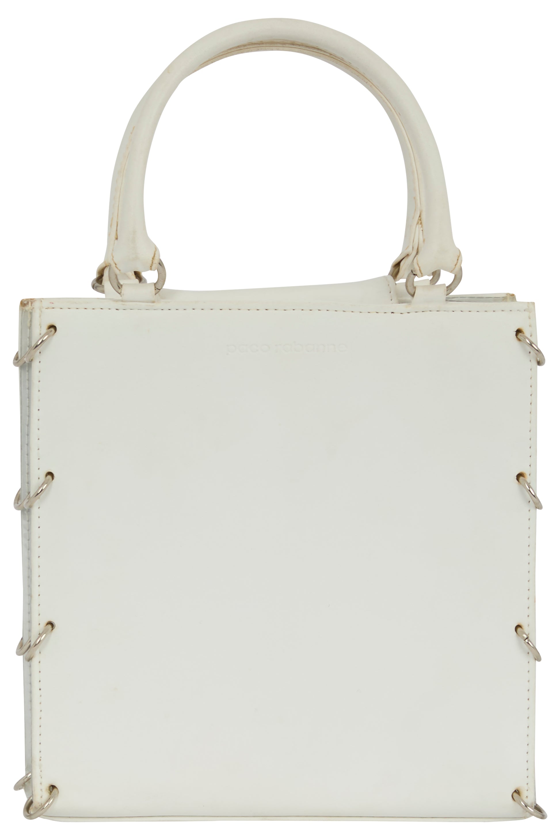 Vintage Paco 1969 Paco Rabanne handbag in white leather with acrylic and stainless steel hoops. This white leather tote reimagines minimalism through a sculptural, almost industrial lens. The clean, rectangular silhouette is punctuated by signature metal ring bindings along the sides a subtle nod to the house’s iconic chainmail heritage. Crafted from smooth white leather, transparent vynil panels on each side, the bag embraces a sleek, unadorned surface with the Paco Rabanne logo embossed discreetly at the front. Its structured form and rigid top handles. Fastens with clasp button closure.