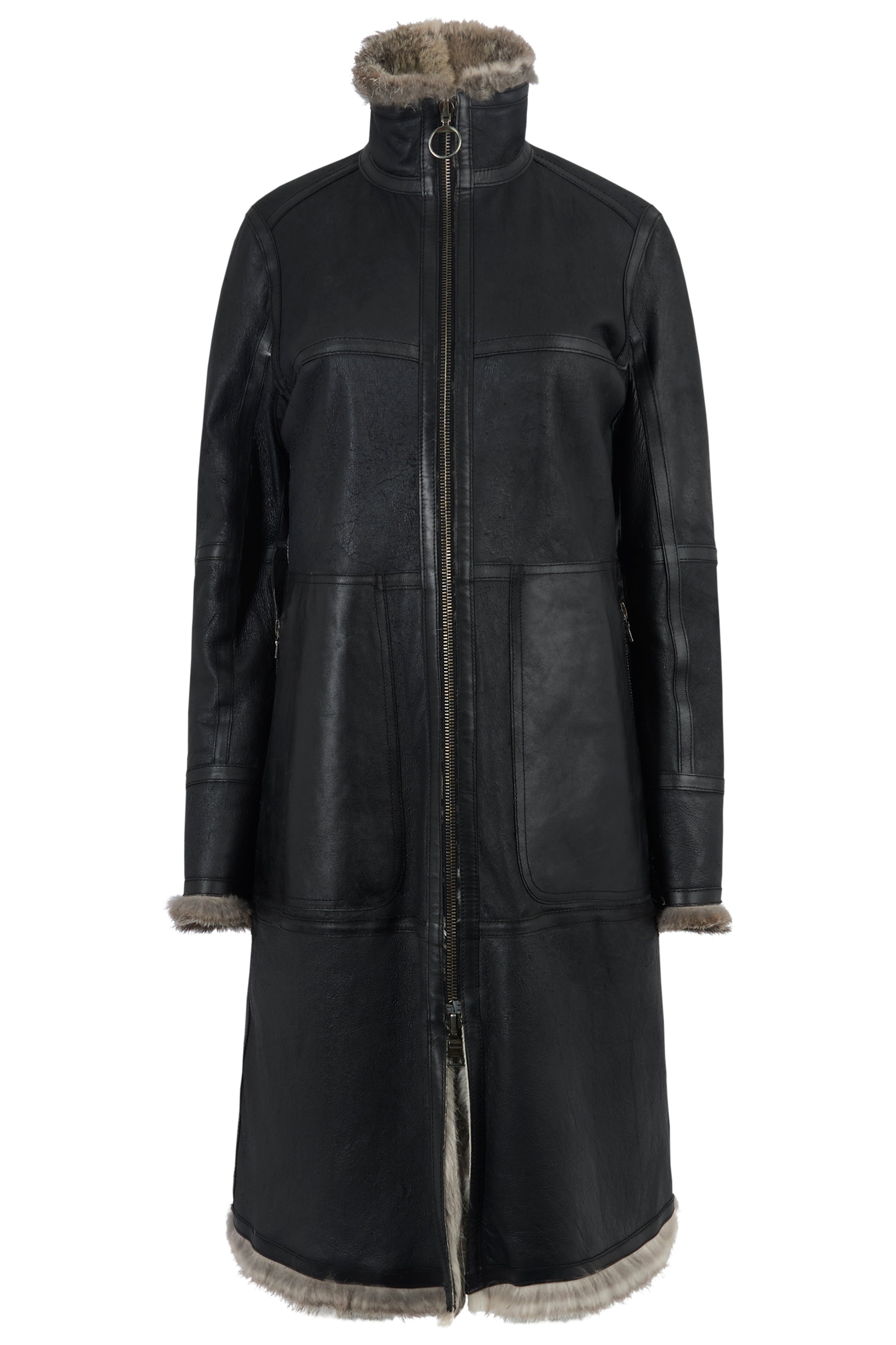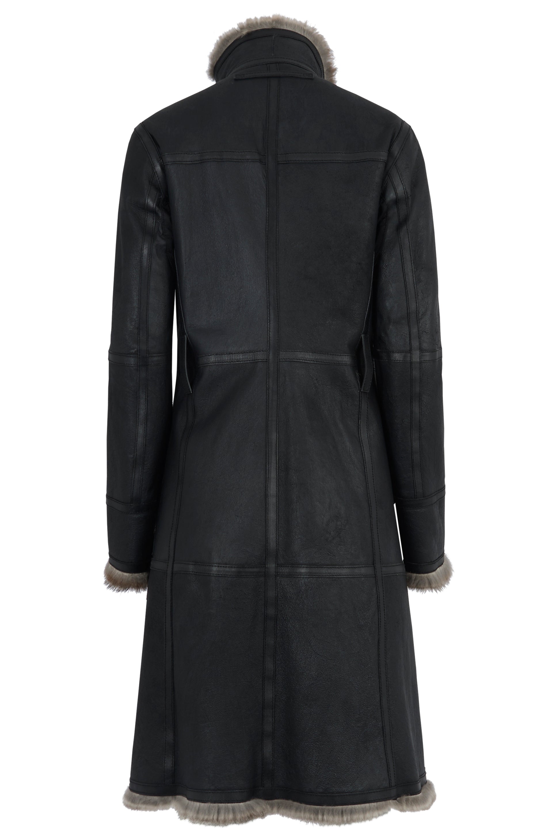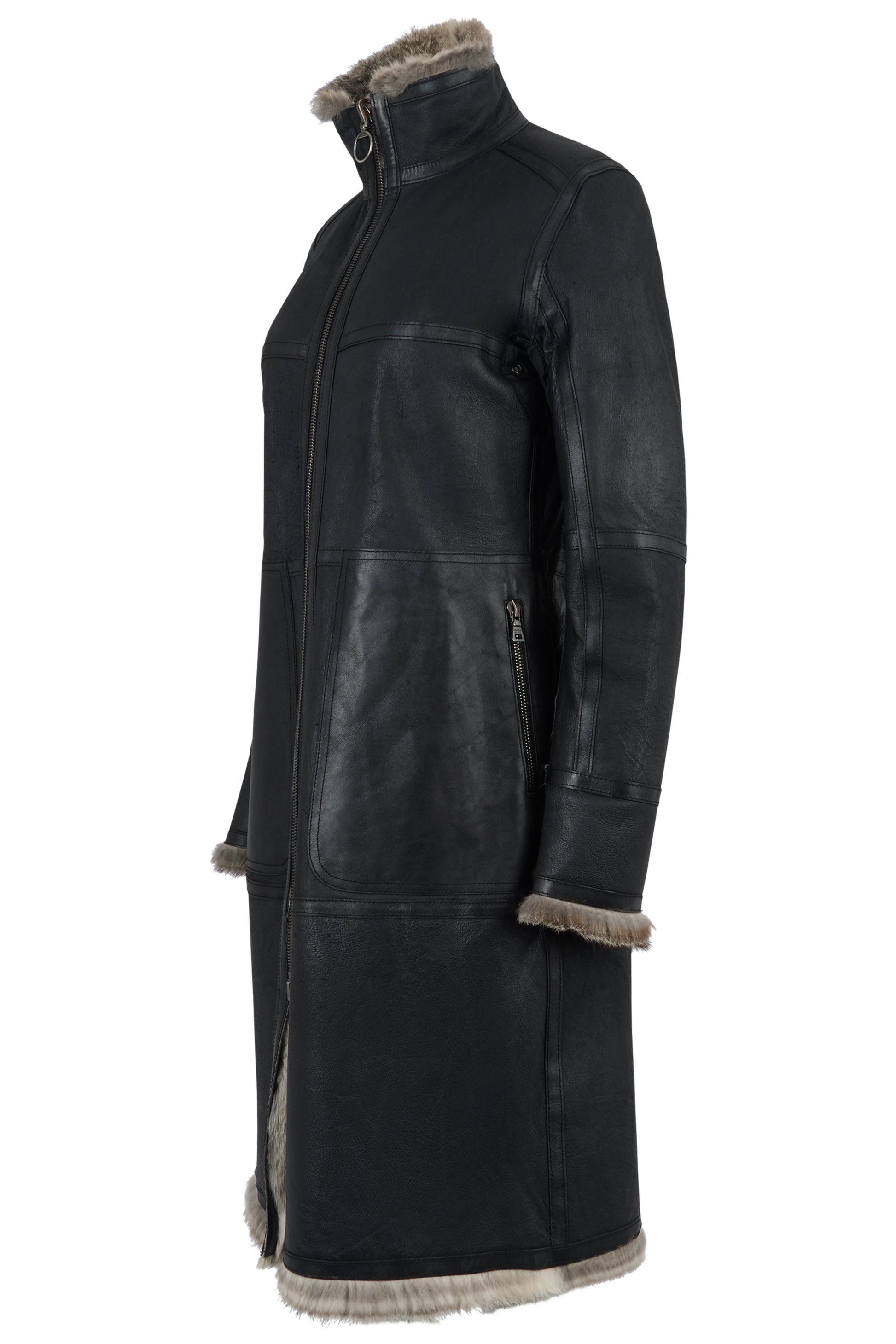 Vintage circa 1990's Prada leather coat. Features a black leather fabric and real shearling the coat is designed with a reversible construction, two sides zip pockets and a front double zip closure with signature pull.
