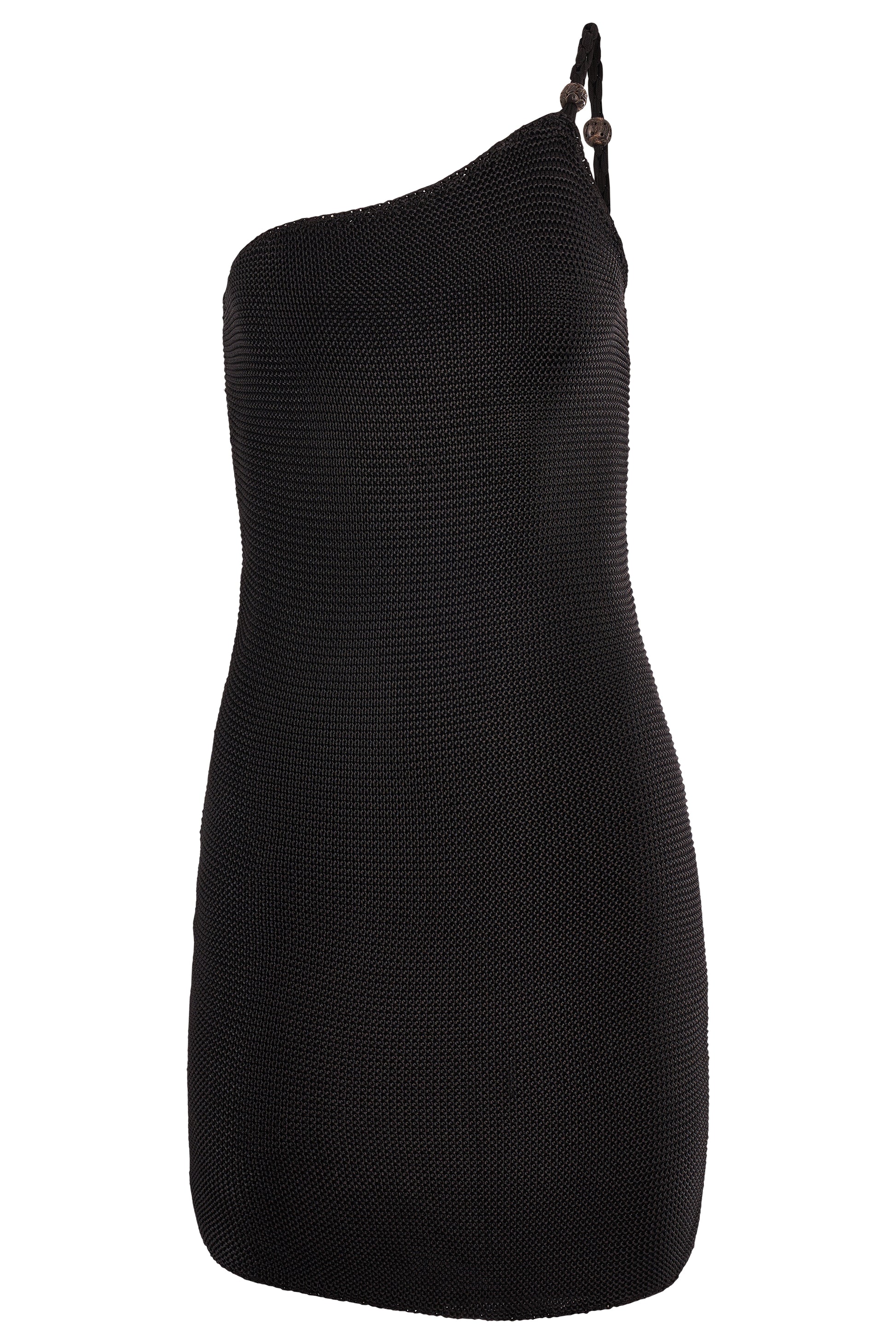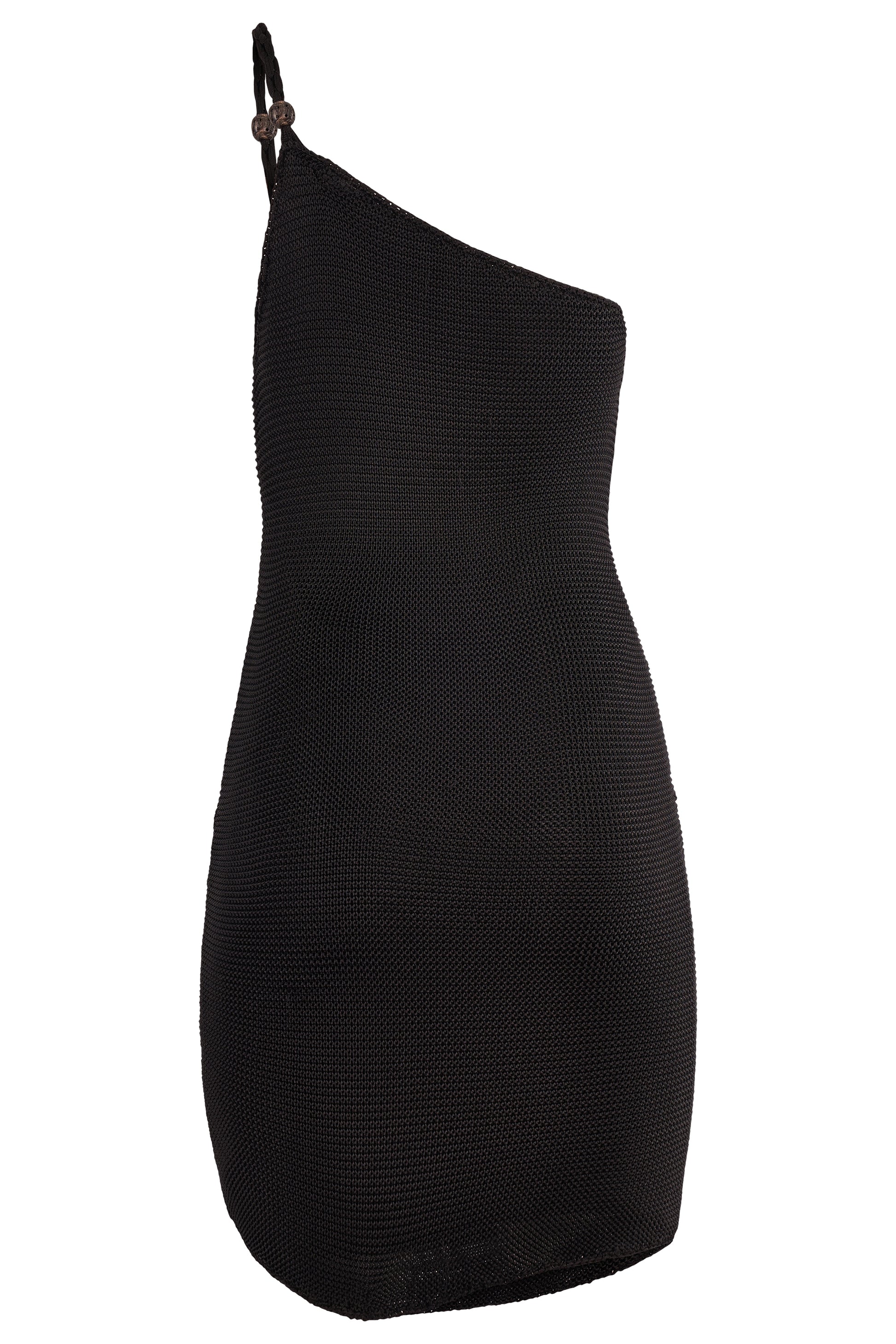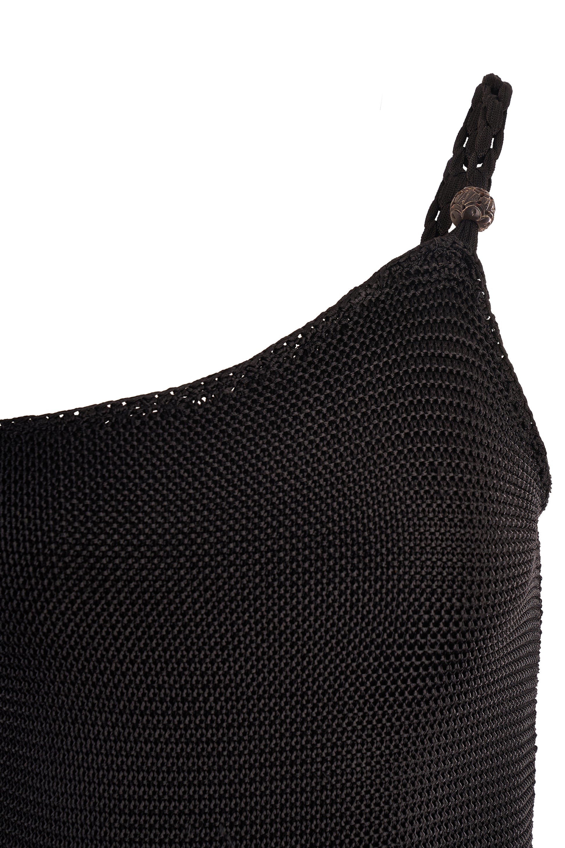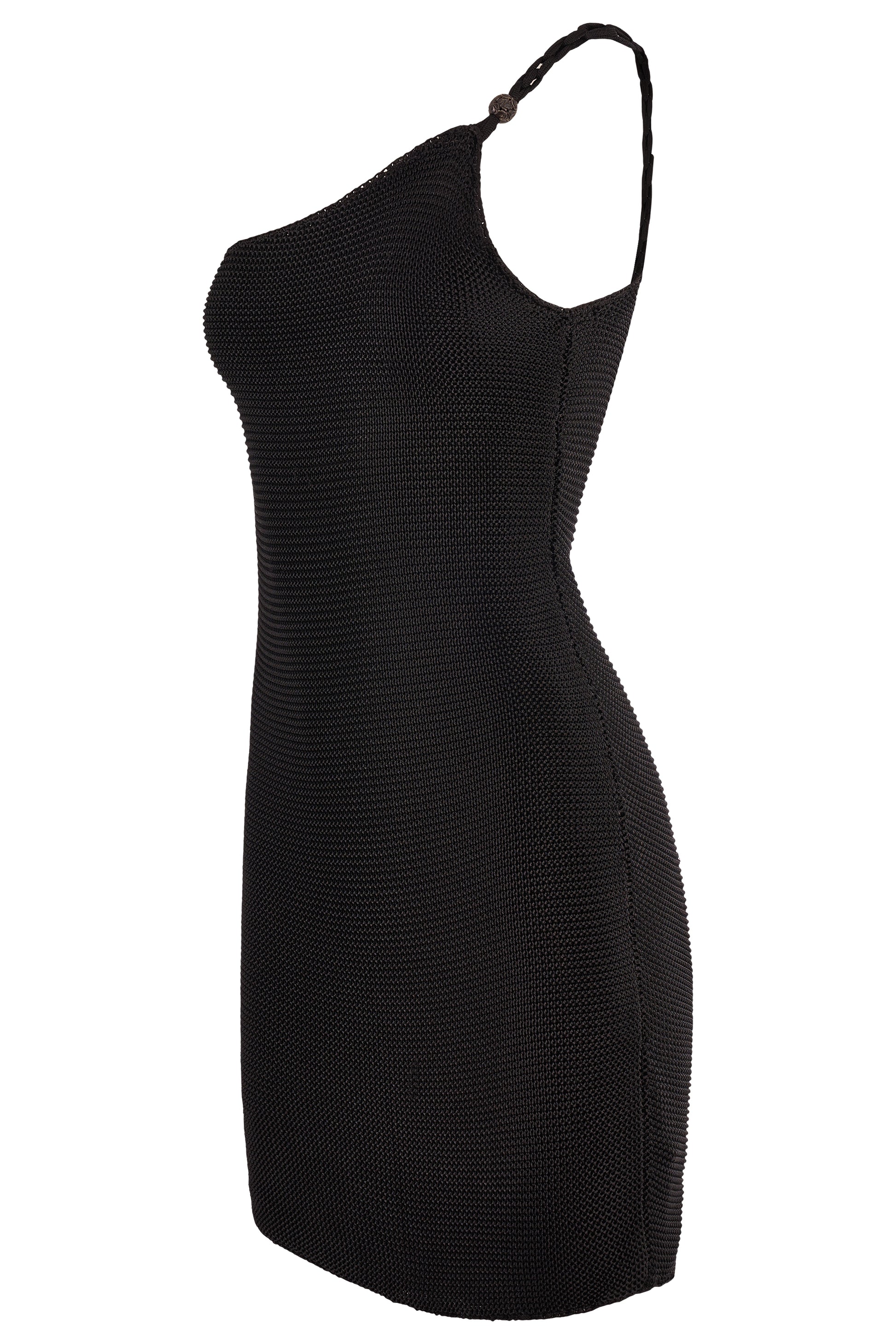 Vintage Ralph Lauren crochet one shoulder dress. Featuring a sleek one-shoulder silhouette, the dress is intricately hand-crocheted in rich black yarn. Black silk inside lining. The single shoulder strap is detailed with braided ties and metal accents. In excellent vintage condition.