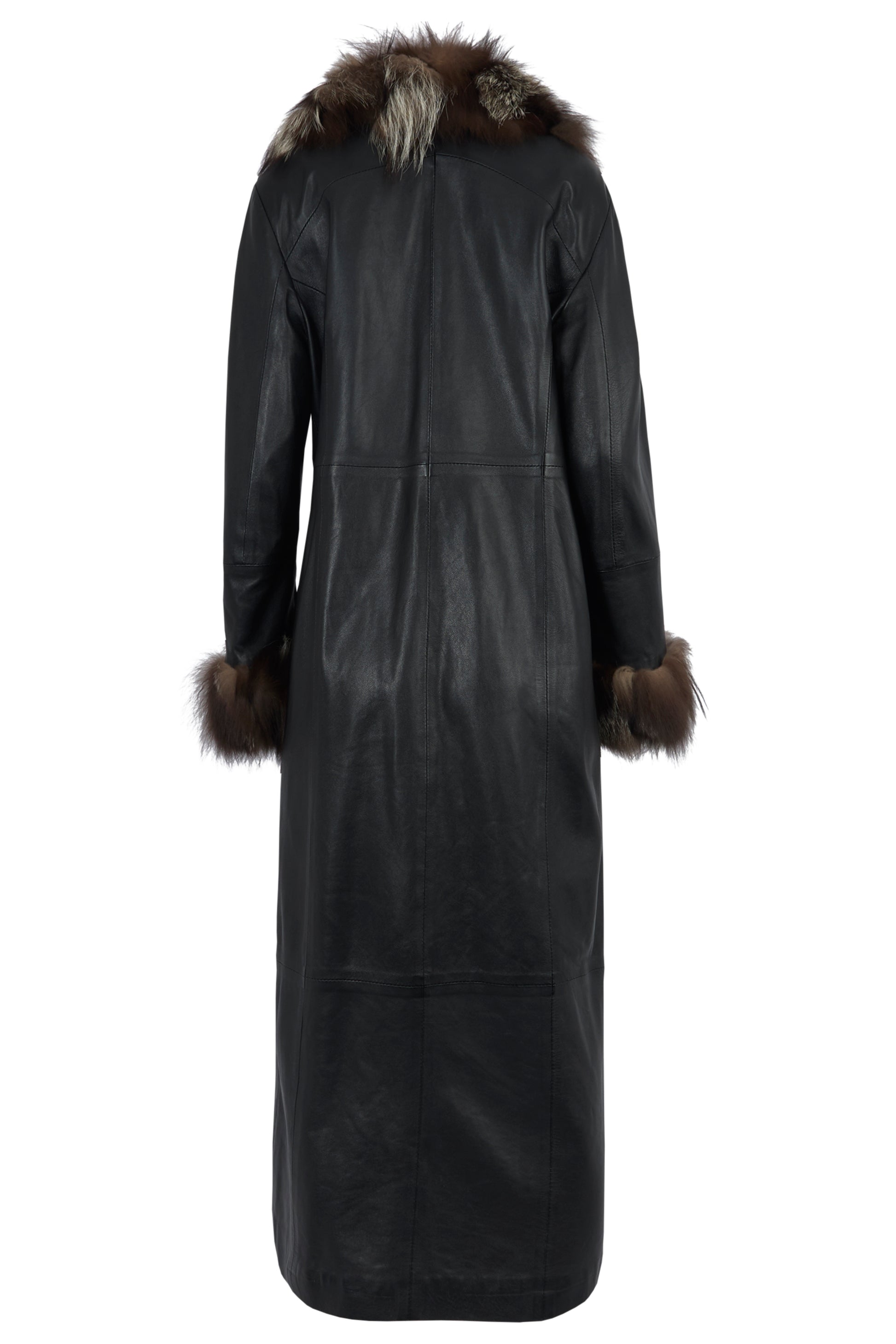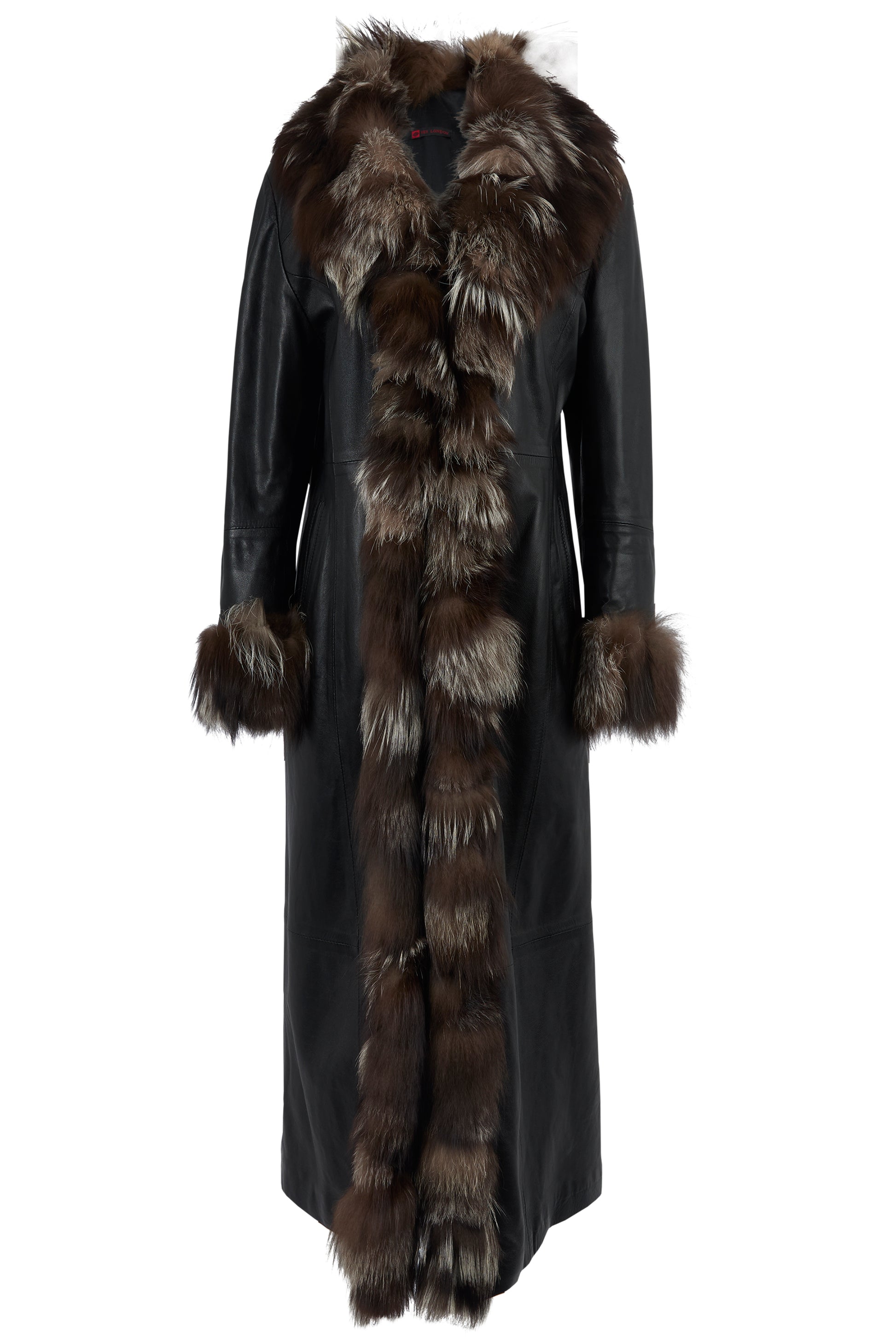 Vintage 2000's silver fox fur trim leather brown maxi coat. Features a brown soft leather fabric, fur trim along the wide collar, front opening and sleeve cuffs. Full length, two side pockets . Fastens with two front buttons.