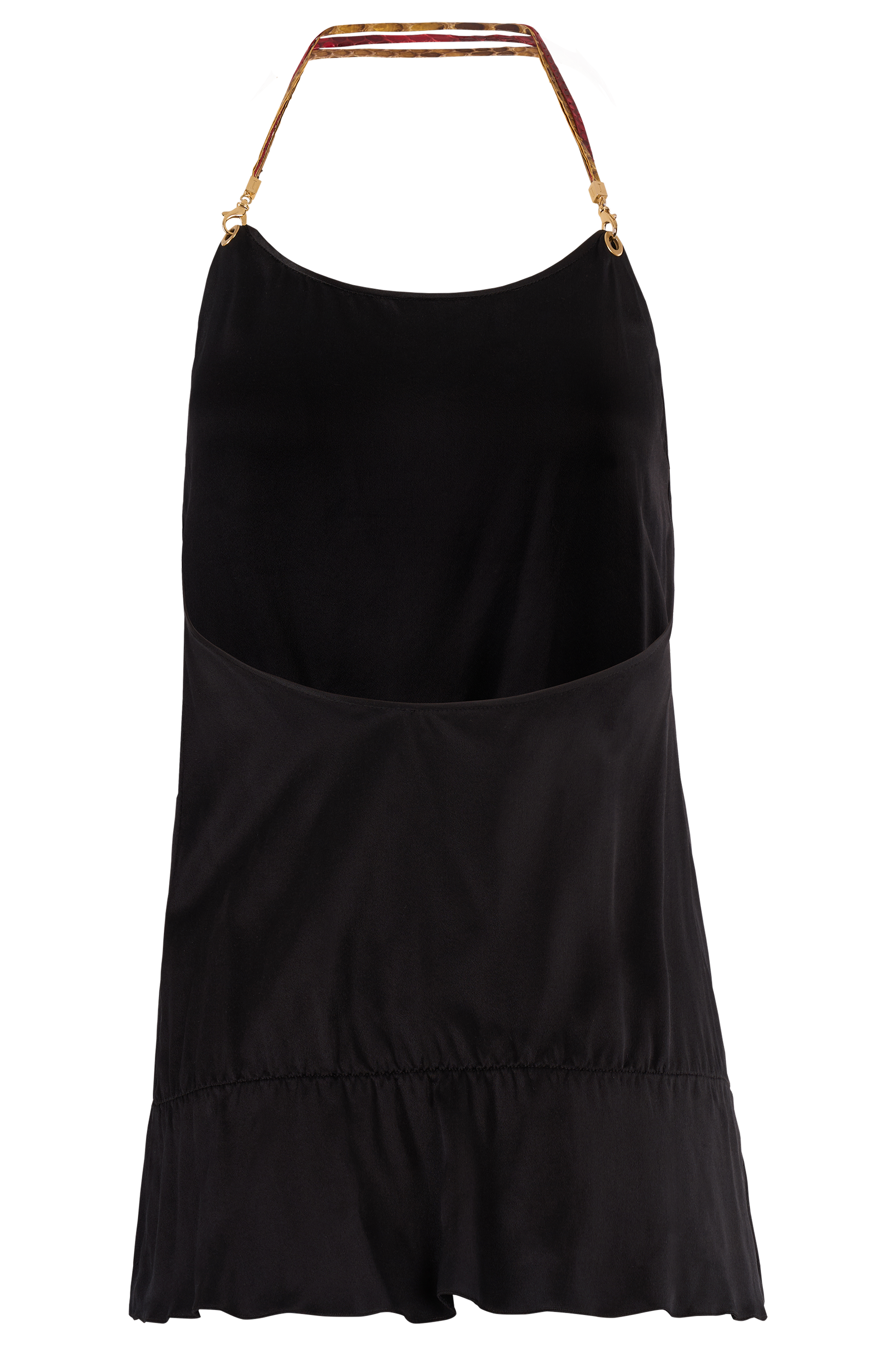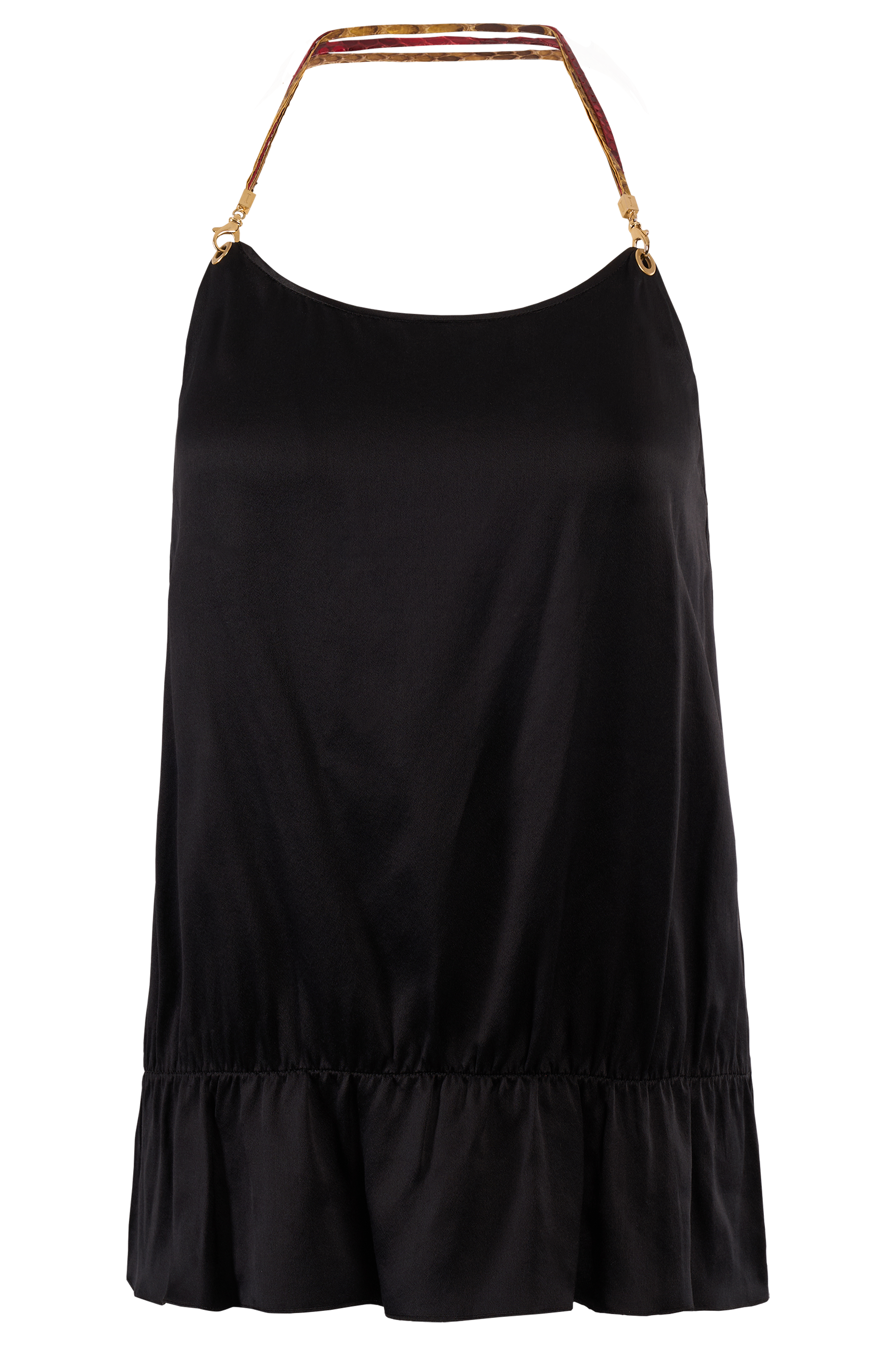 Vintage Iceberg black silk top. Feature a light silk fabric, round neckline, open back, ruched at the hem and removable halter straps in python. In excellent vintage condition.