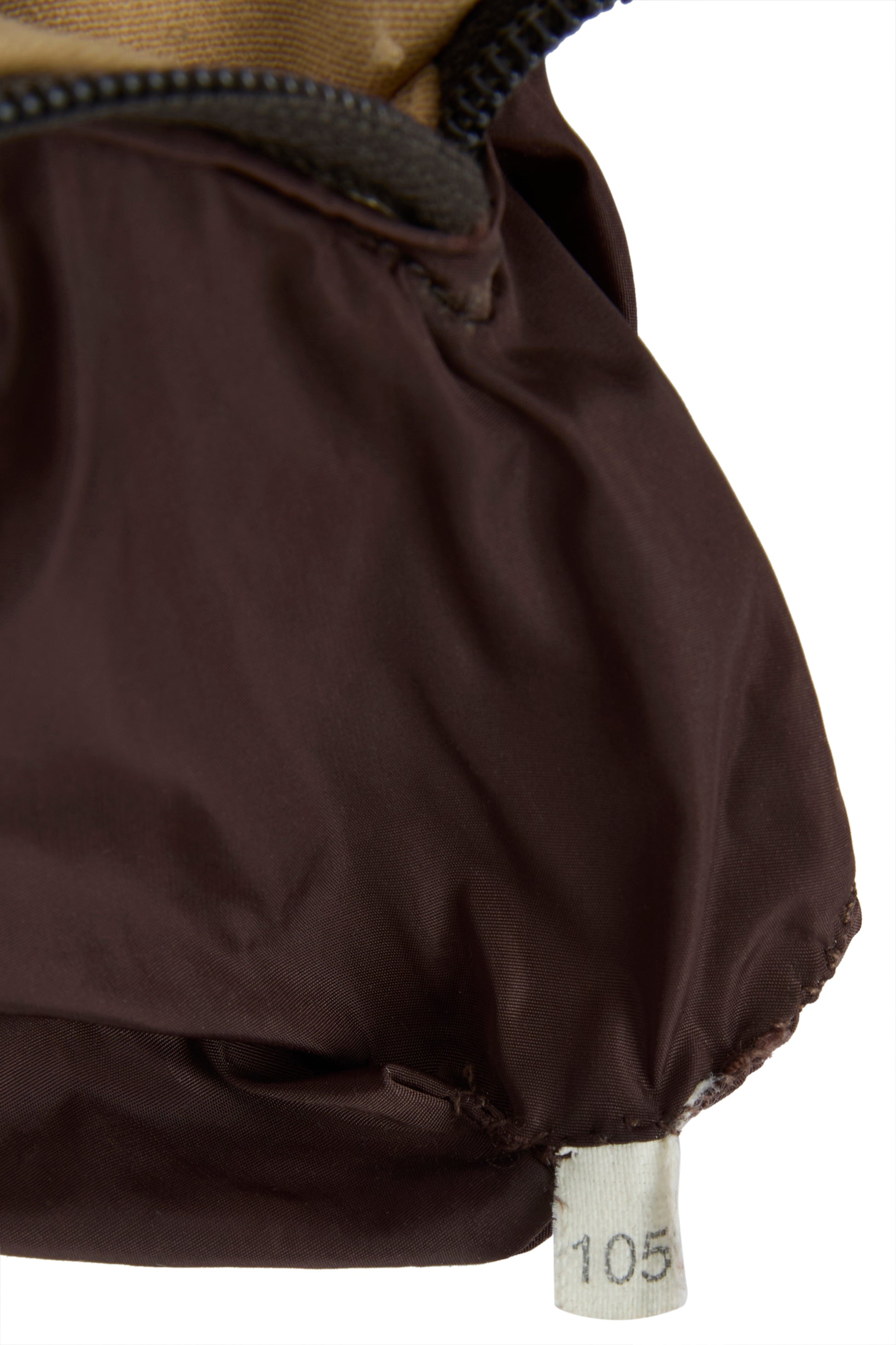 Vintage 2000's Prada mini pouch. Features a canvas in a warm sand tone, contrasted with a deep brown top handle. The classic vertical red leather " linea rossa" sport Prada logo. Main compartment with a brown lining , Fastens with a top zip closure.