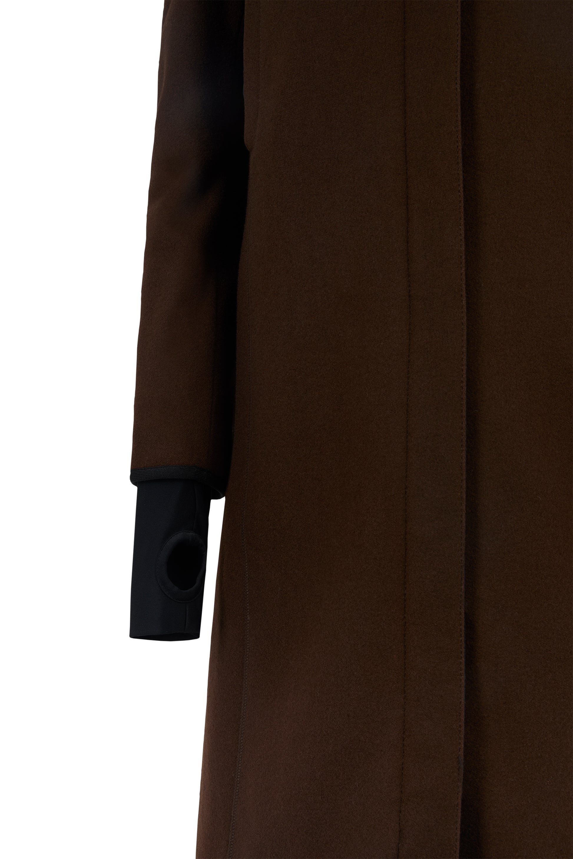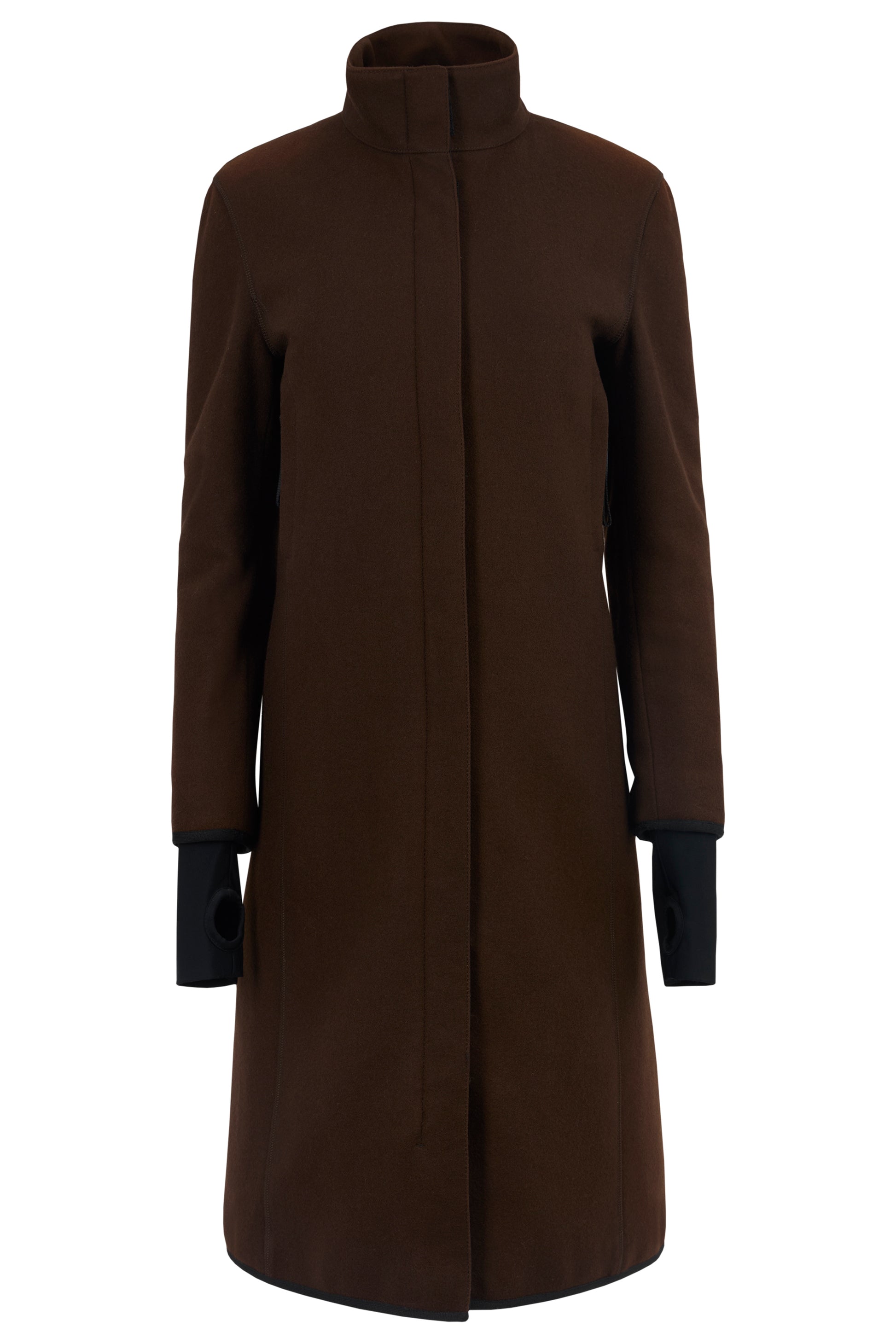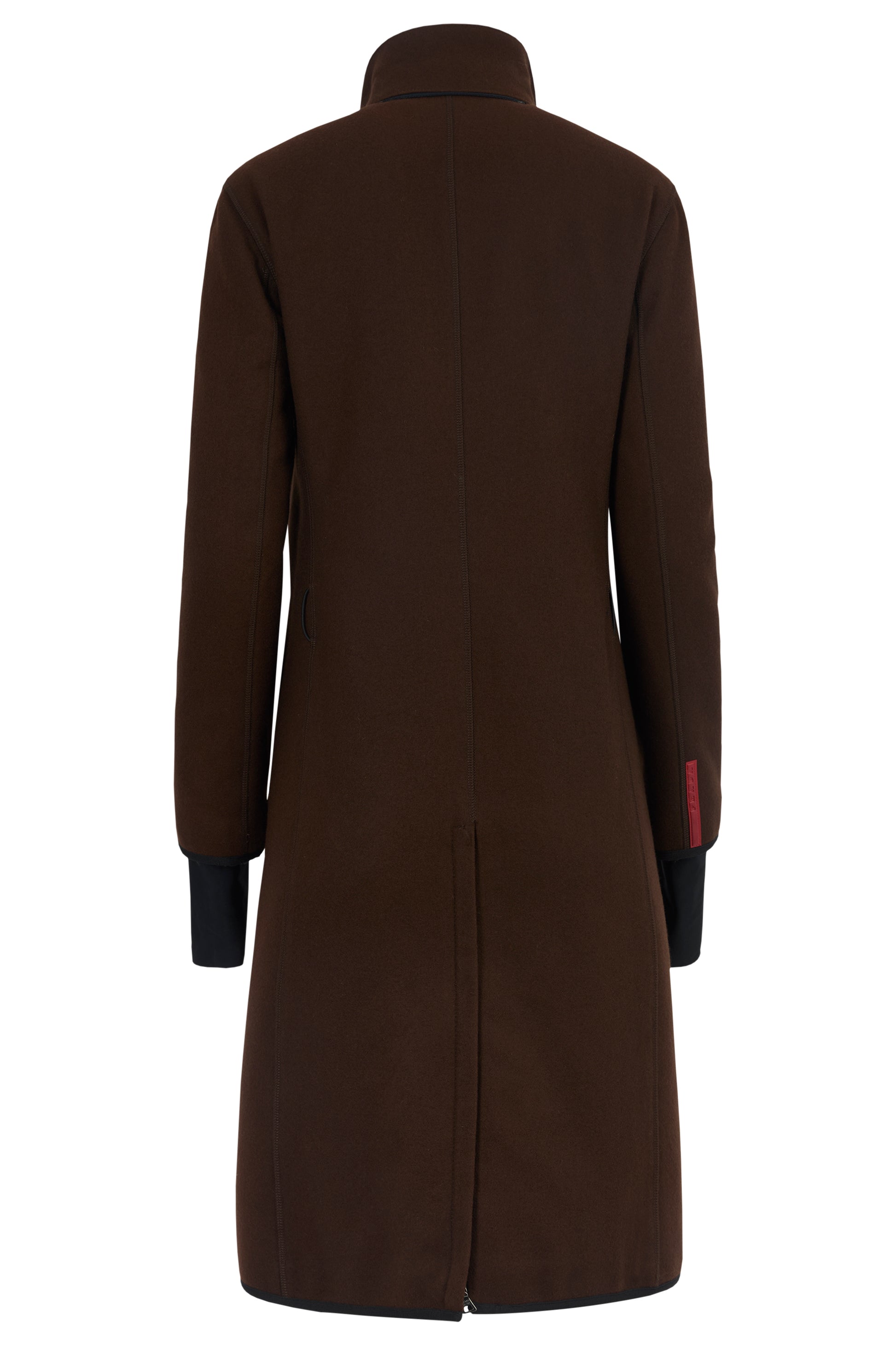 Vintage 2000's Prada brown wool coat . Features a rich brown wool fabric, clean and straight mid length silhouette cut, Technical nylon details at the inner collar and the thumbhole sleeves , two velcro inside pockets and two zip pockets on the chest . Fastens with a front double zip closure and velcro.